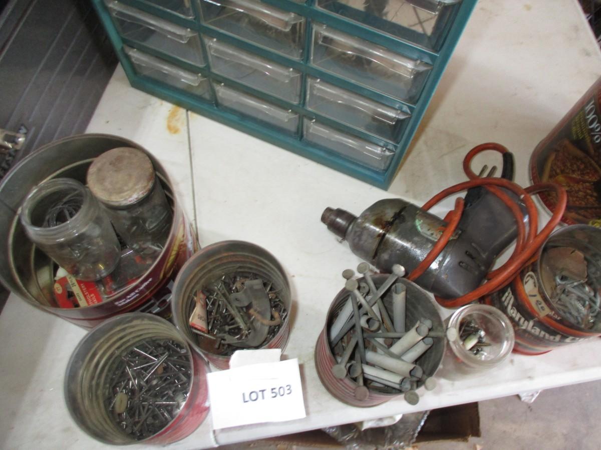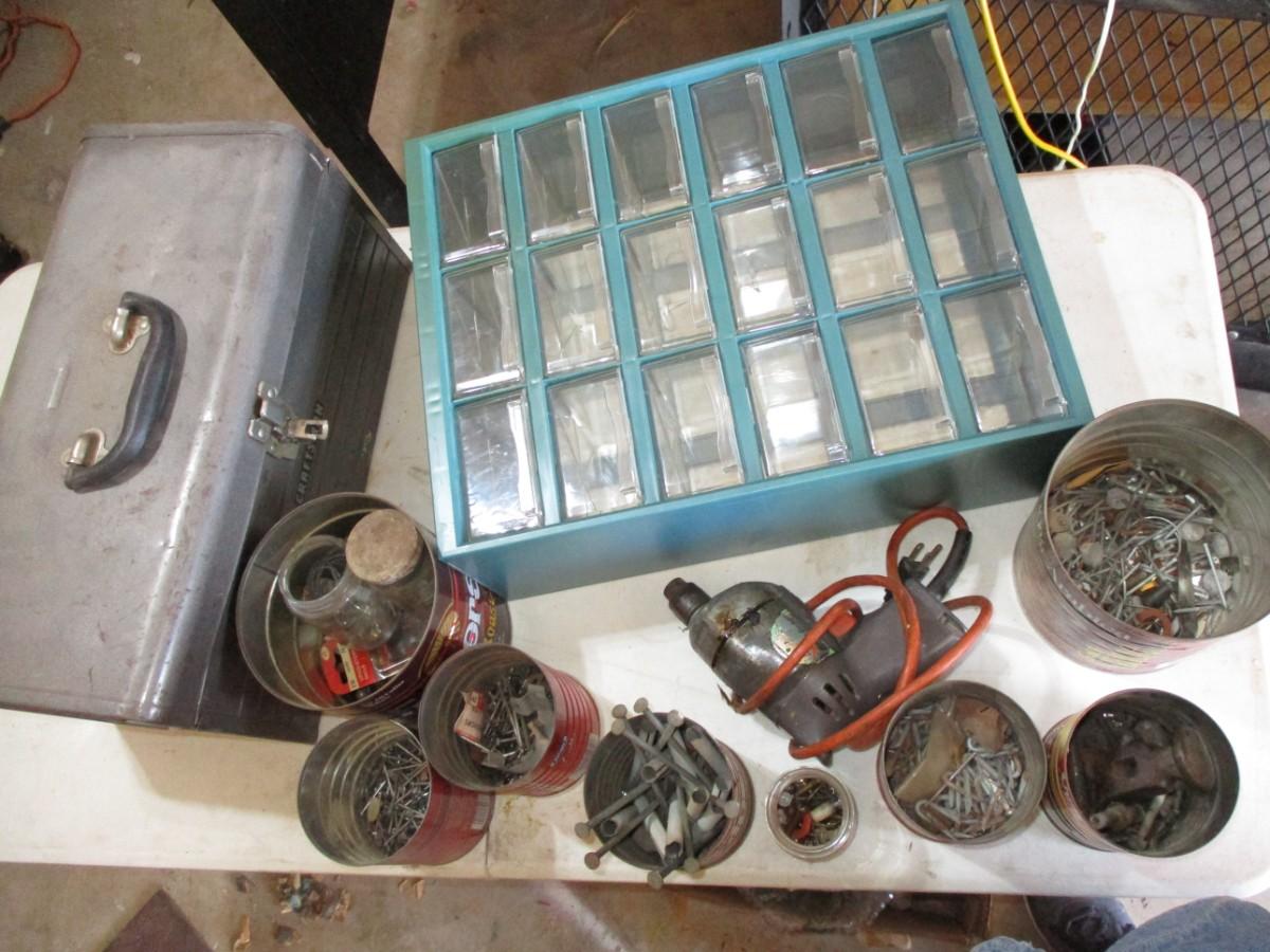 Drill works. Screw storage box, various nails and screws, Empty craftsman tool box