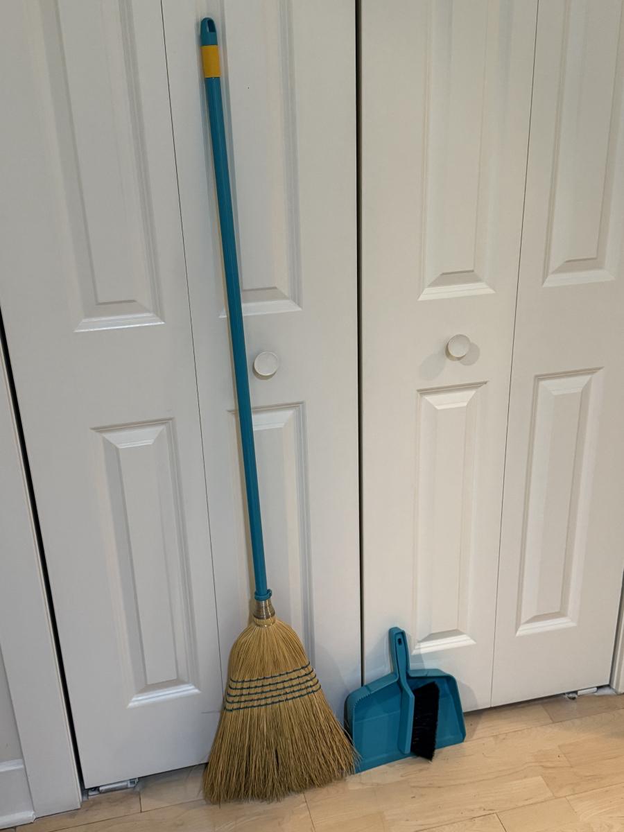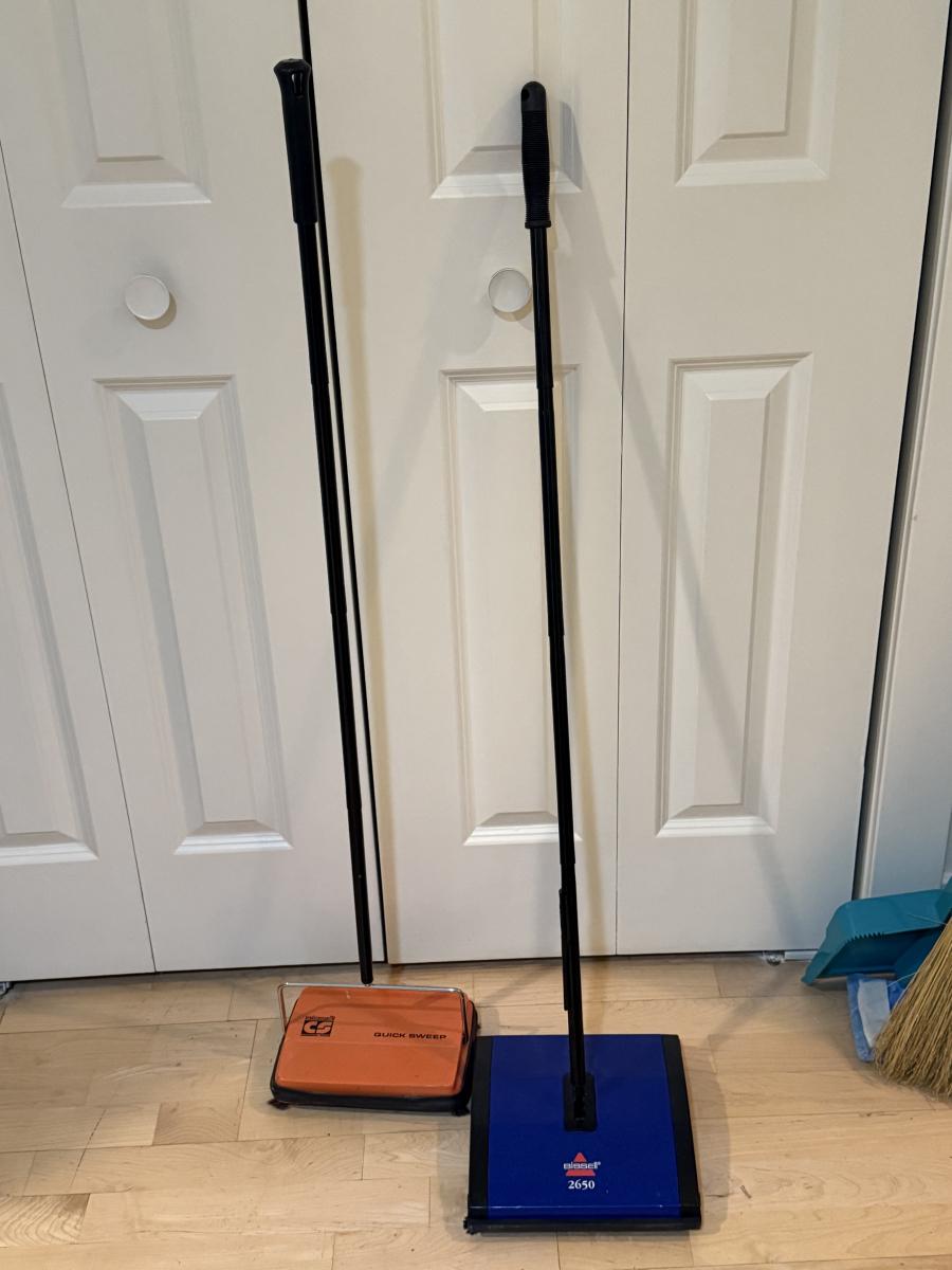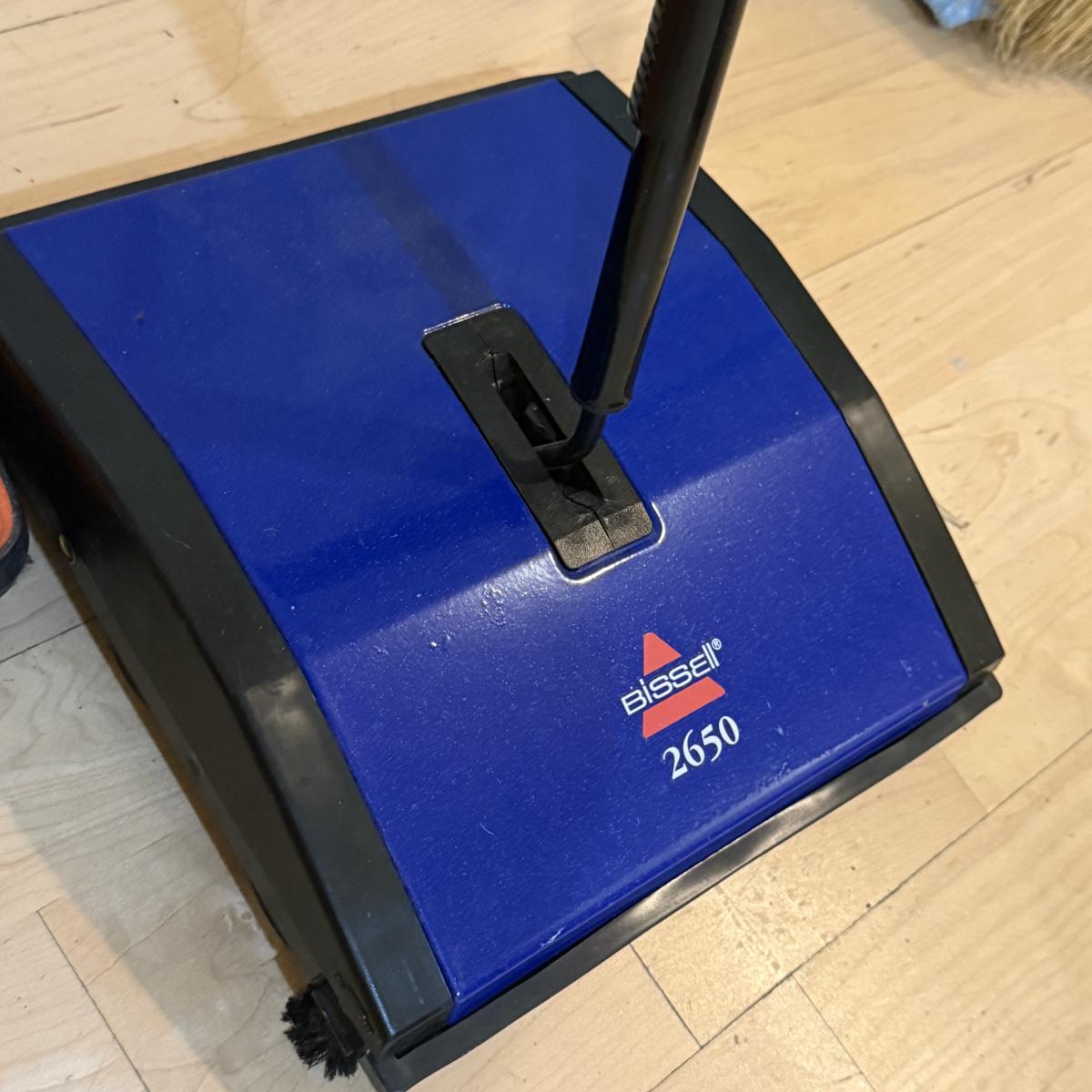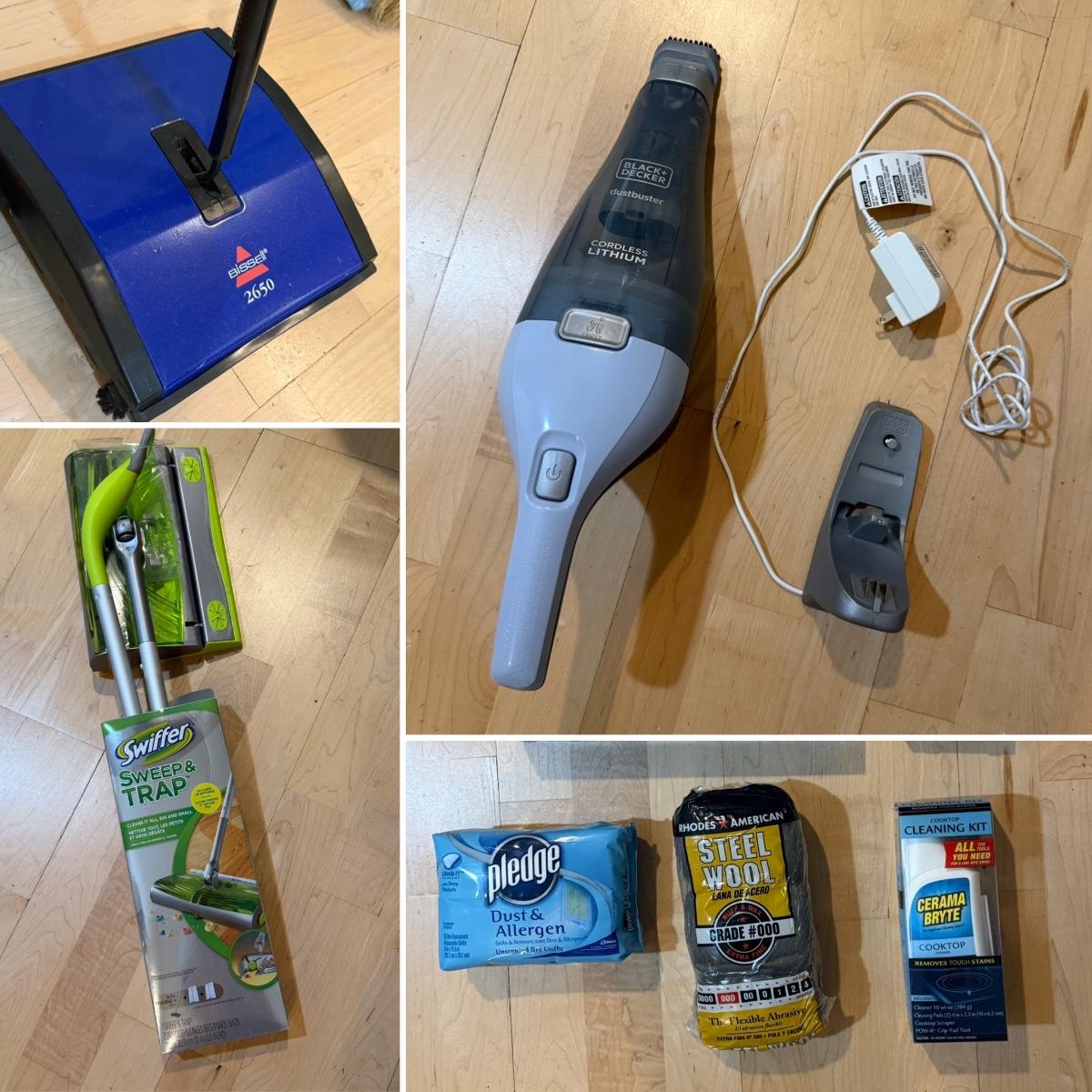 A good variety of cleaning tools and supplies. The Black + Decker cordless lithium Dustbuster powered on and had suction. It comes with a wall mounting charger. There are two Bissell brand floor sweepers. Also included are a NIB Swiffer Sweep & Trap, a NIB Grab It floor sweeper, a Quickie microfiber dust mop (with attachments that have been used), a broom with matching dustpan and brush, plus NIB packages of steel wool, Ceramabryte, Chore Boy, Pledge dust & allergen cloths, and an unopened package of six Resolve High Traffic Foam cans.