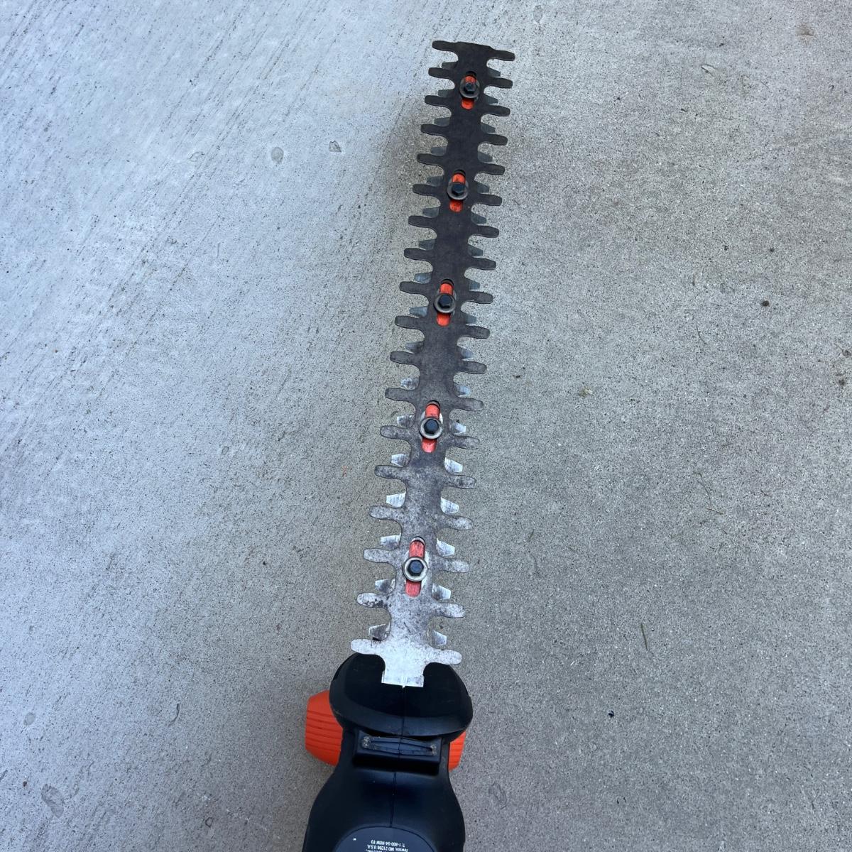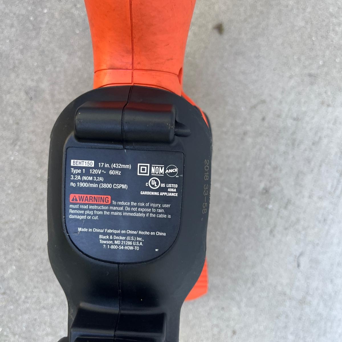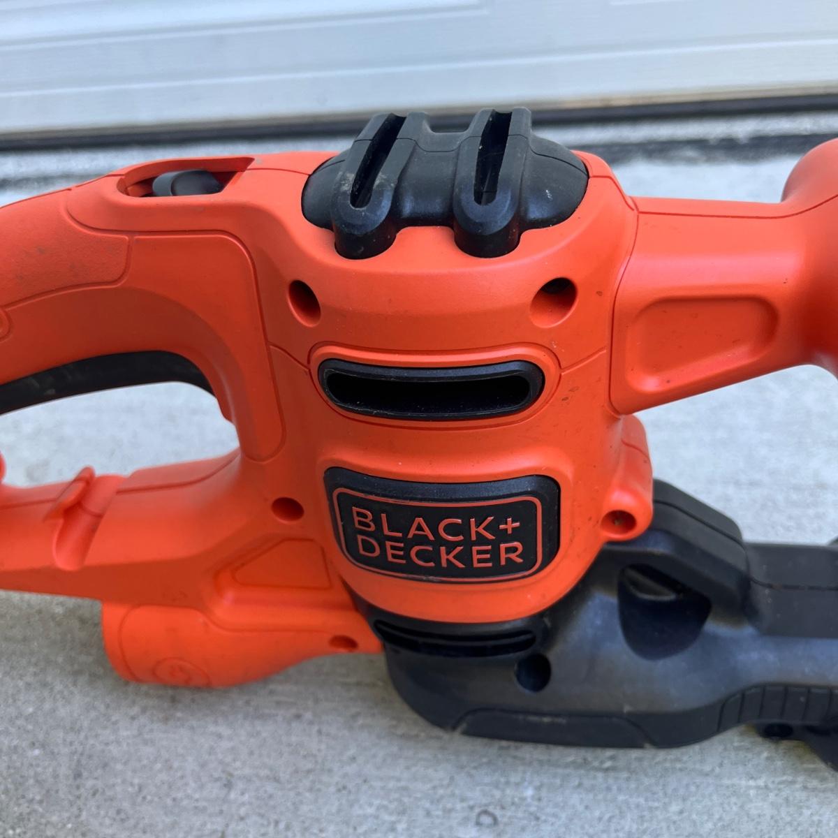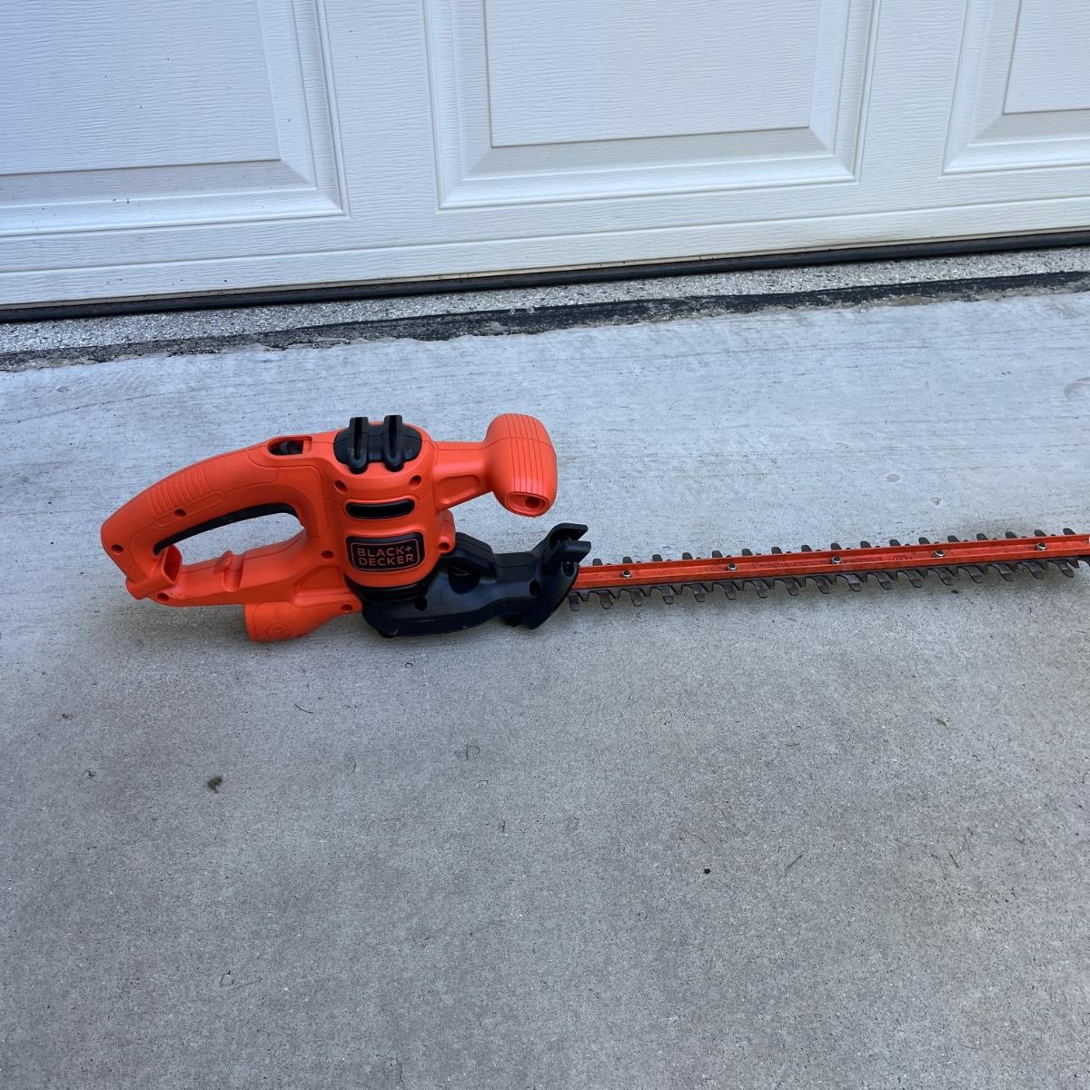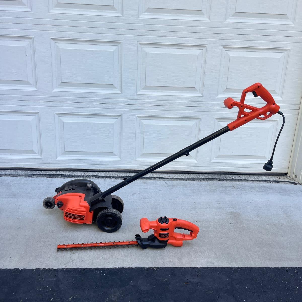 Lot includes a Black & Decker electric hedge trimmer with 17” long blade and electric edger. Both items powered on when plugged in.