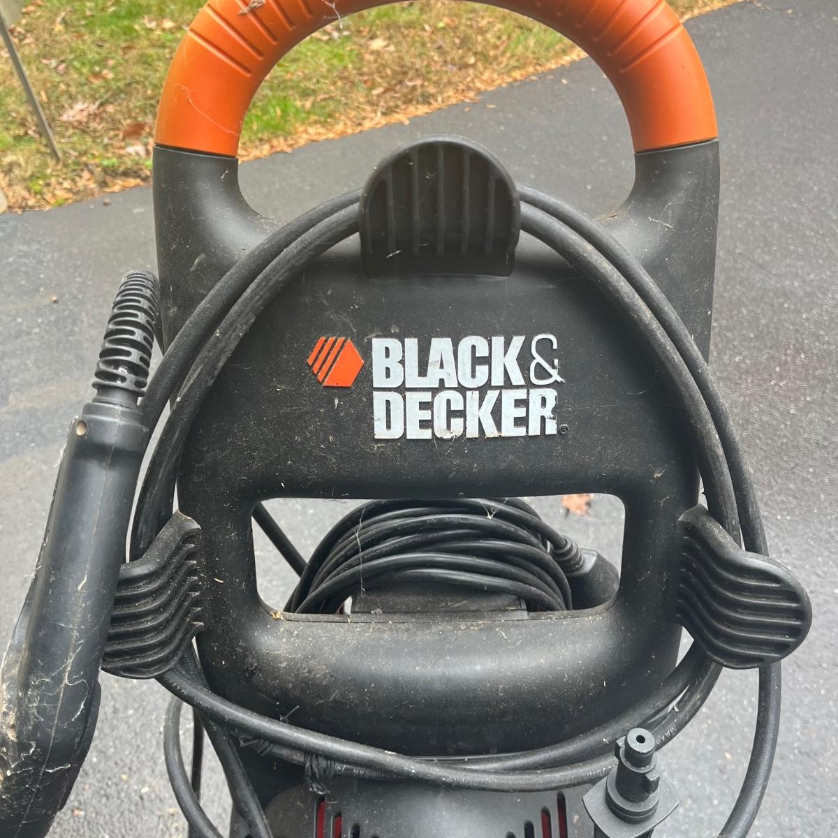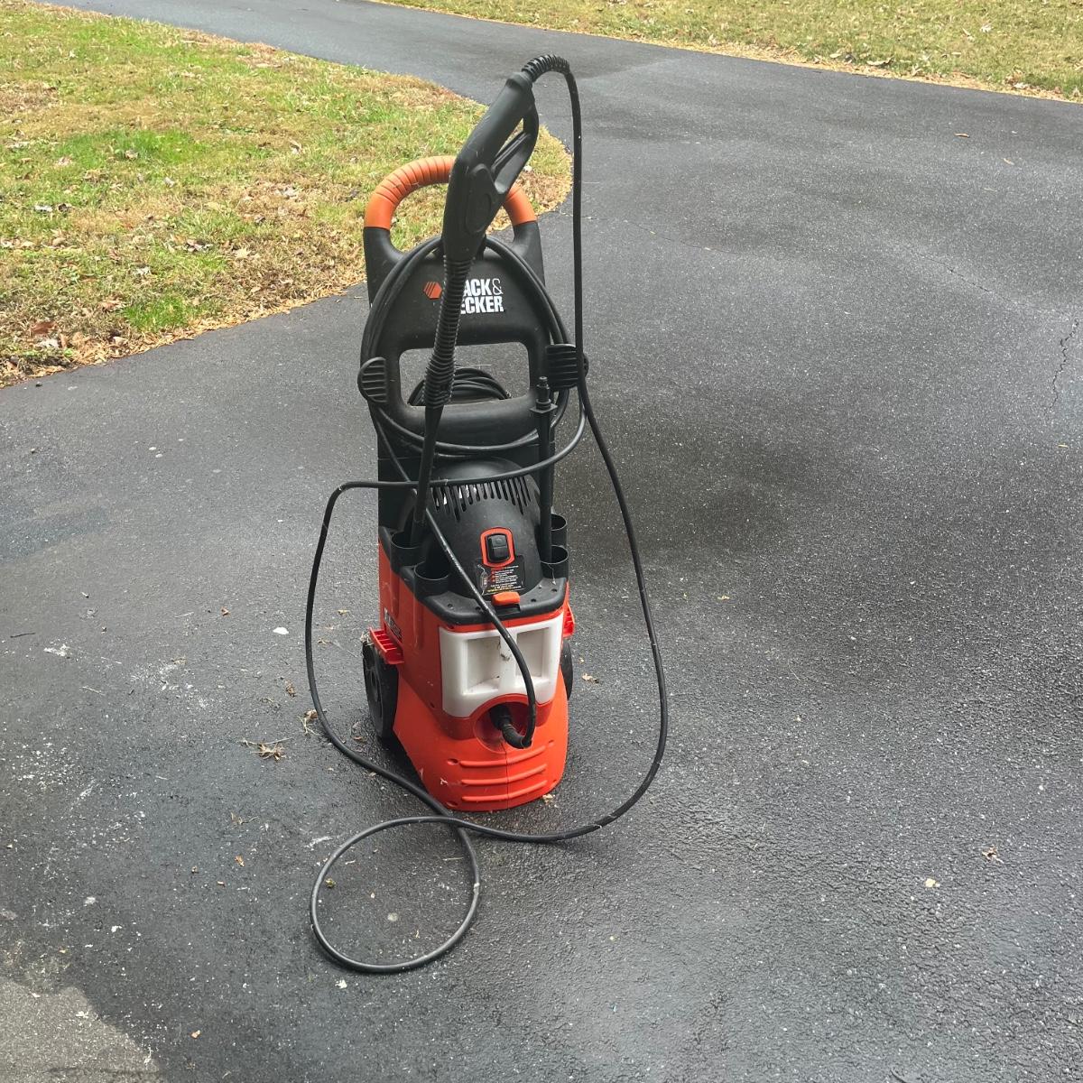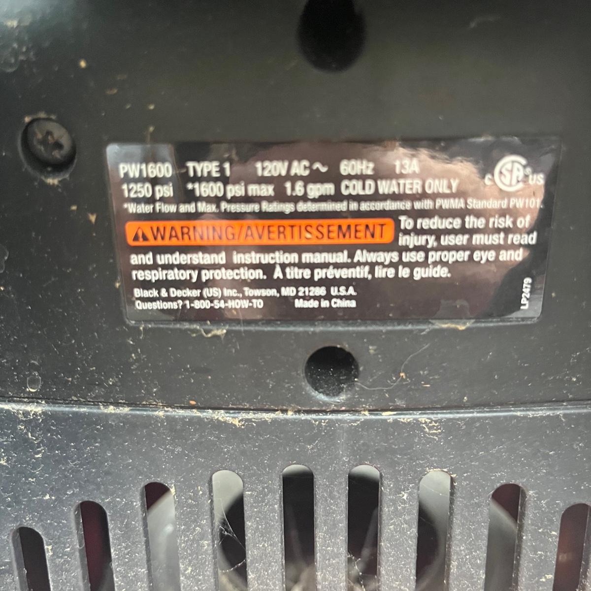 Lot includes a Black and Decker electric power washer model # PW1600. Unit has 1600 PSI max power and powered on when tested. Unit measures 14” x 14” x 38”.