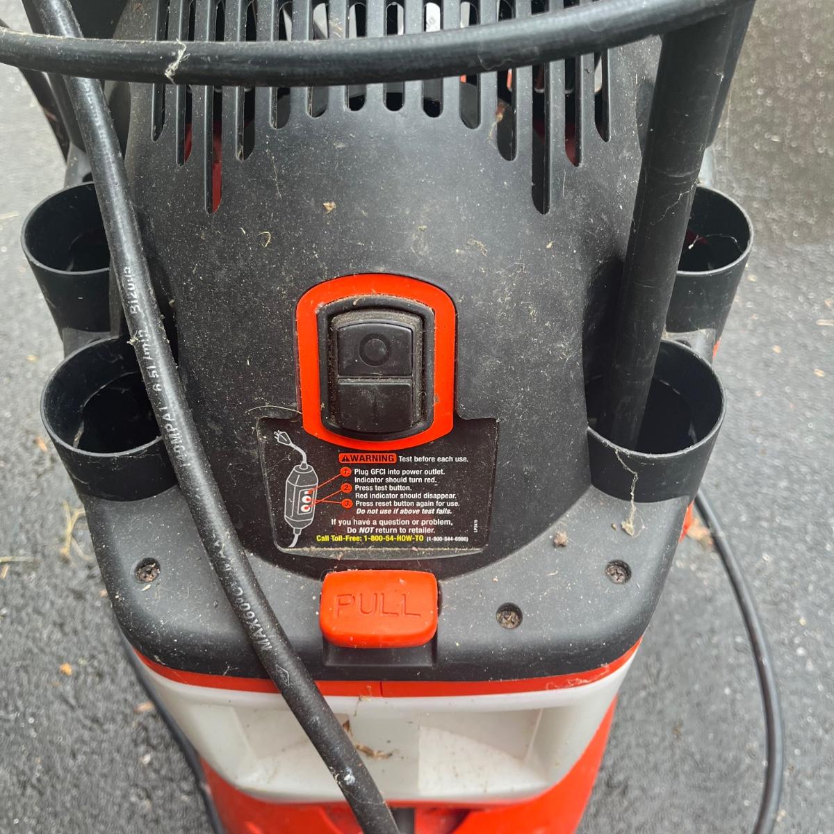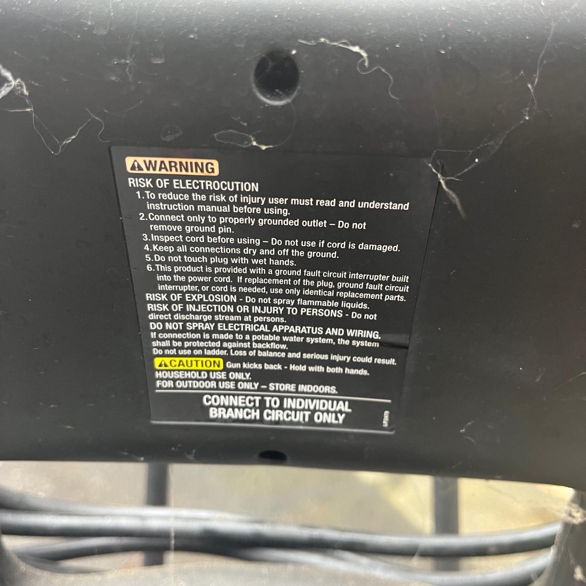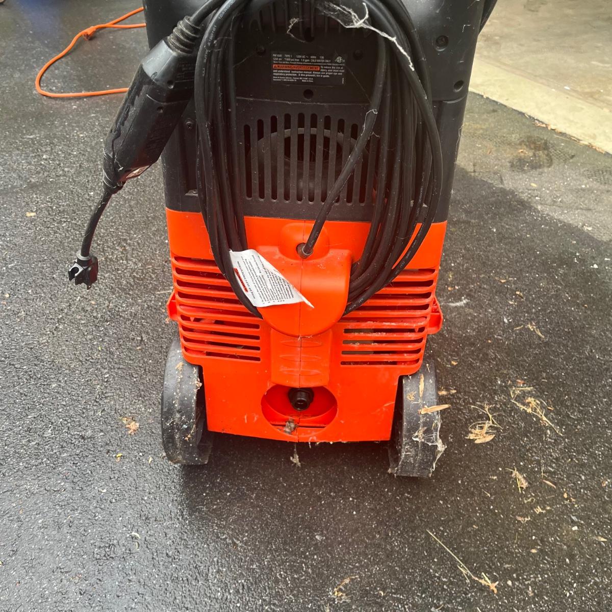 Lot includes a Black and Decker electric power washer model # PW1600. Unit has 1600 PSI max power and powered on when tested. Unit measures 14” x 14” x 38”.