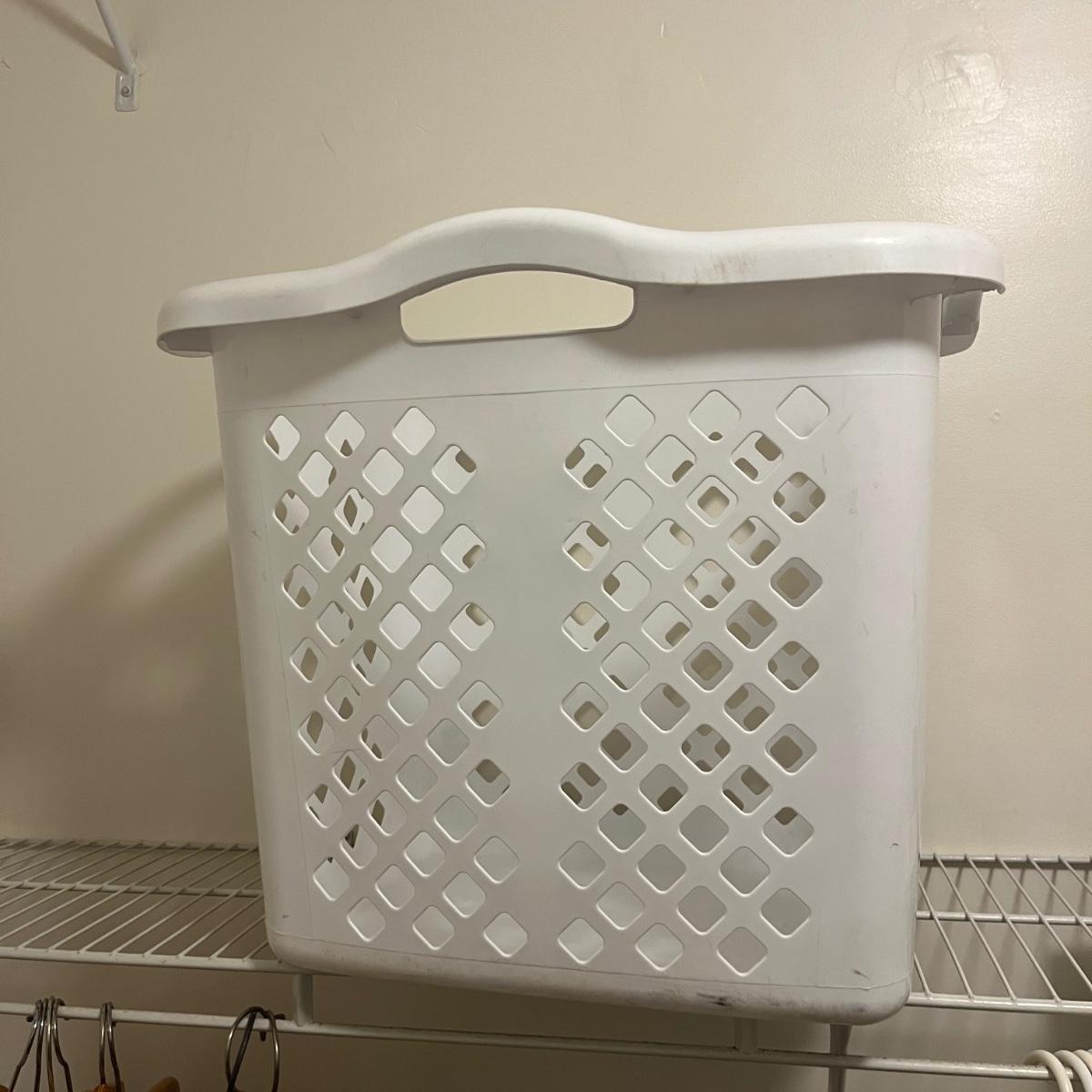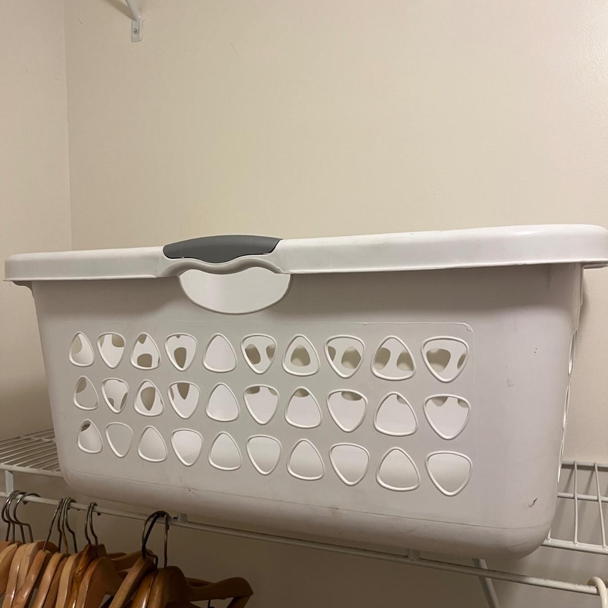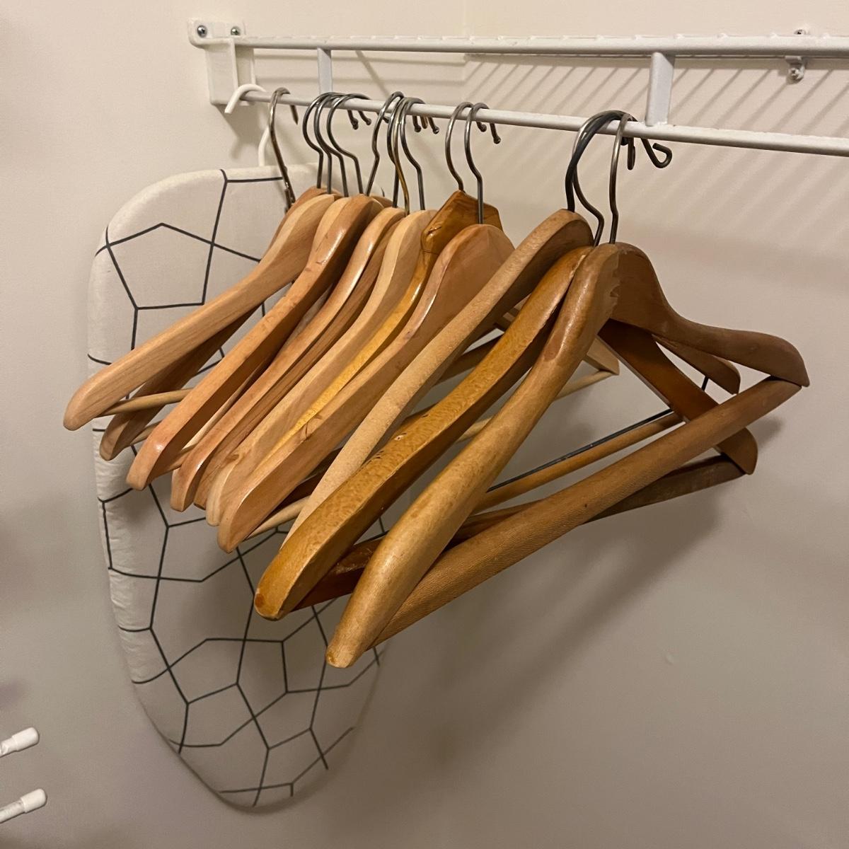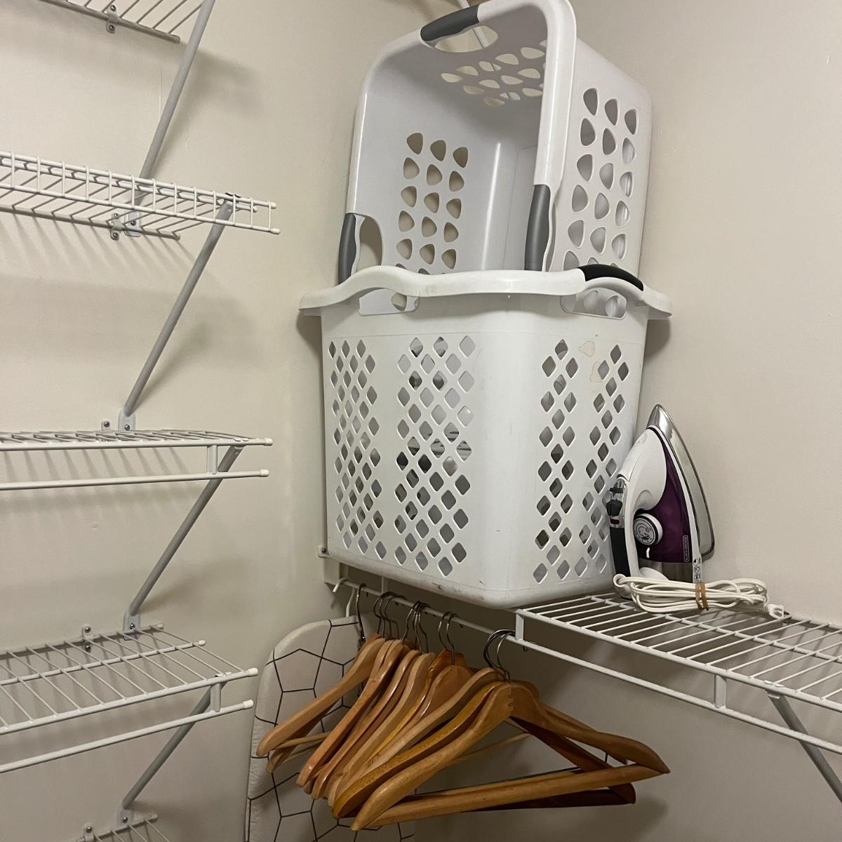Lot includes a Black & Decker iron, nine wooden hangers, two plastic laundry baskets and a small portable ironing board. Largest basket measures 18” x 28” 12”H. Iron powered on when plugged in.