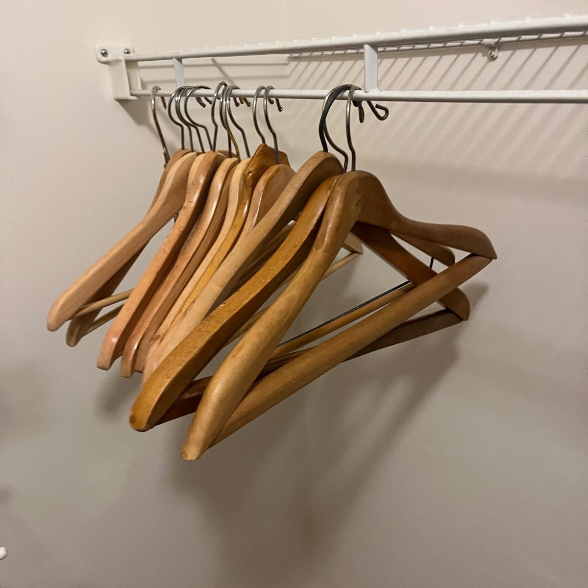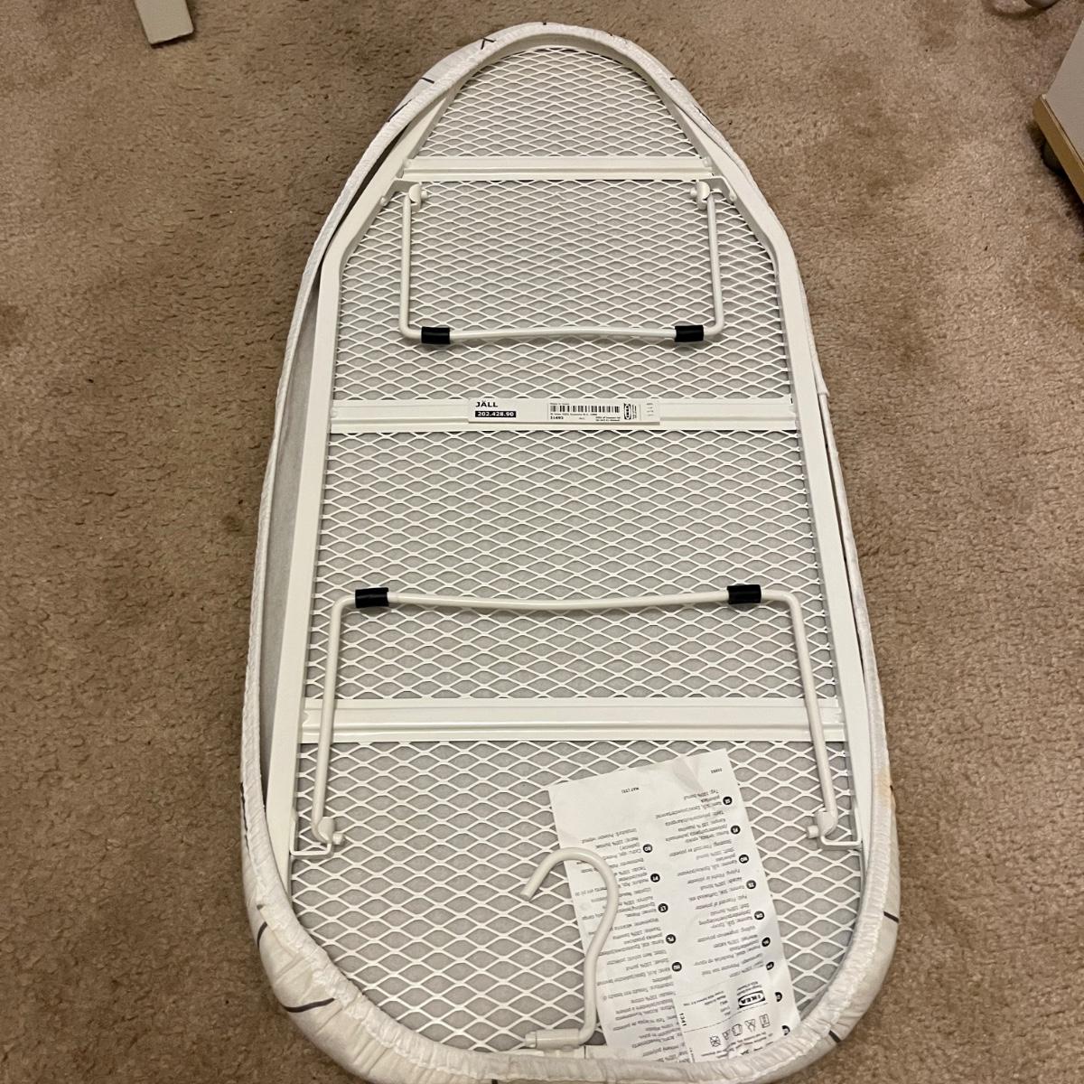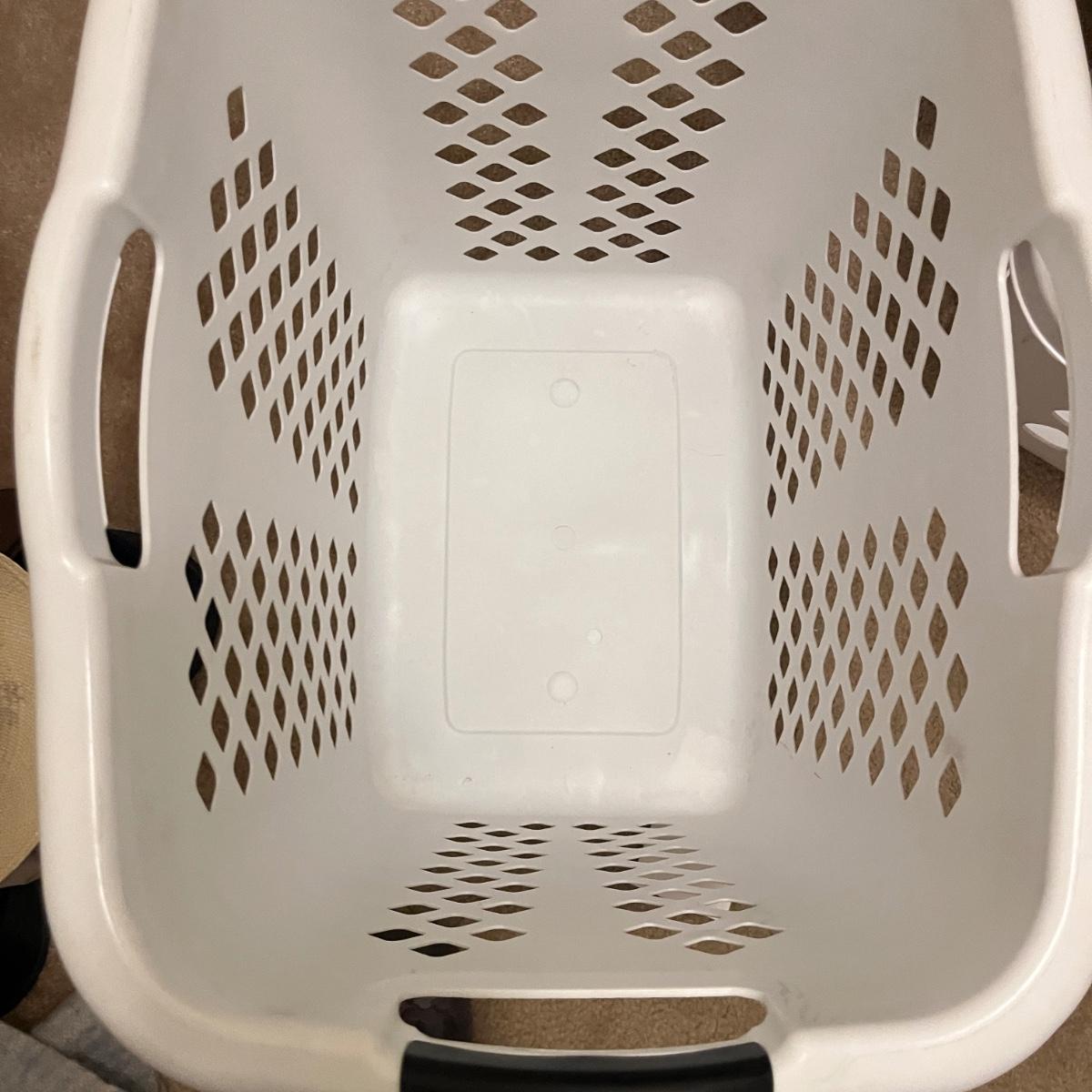 Lot includes a Black & Decker iron, nine wooden hangers, two plastic laundry baskets and a small portable ironing board. Largest basket measures 18” x 28” 12”H. Iron powered on when plugged in.