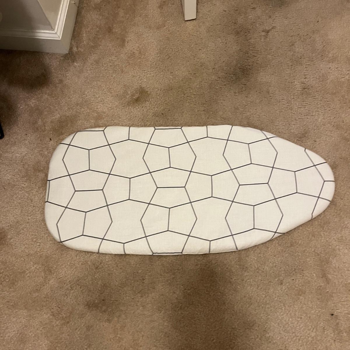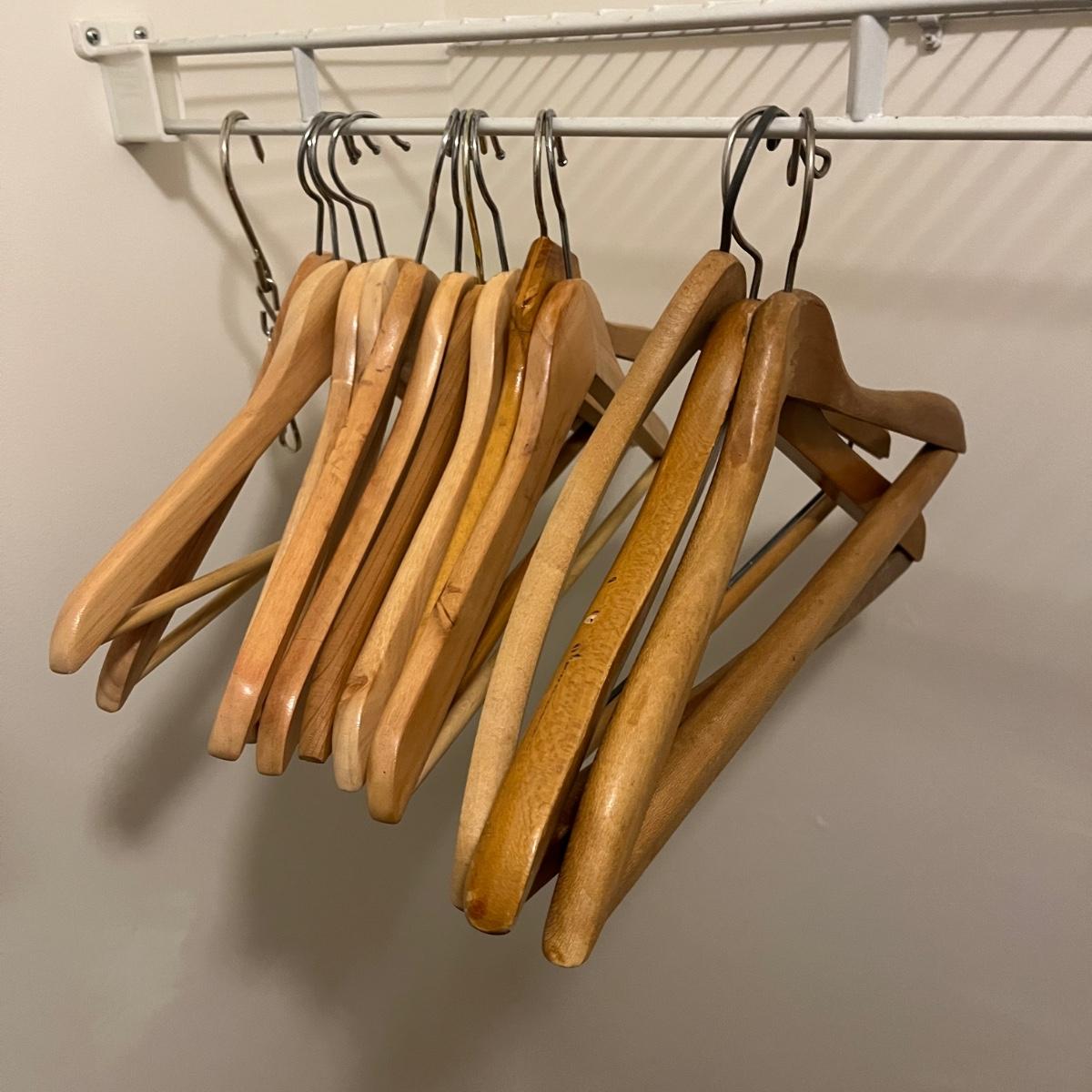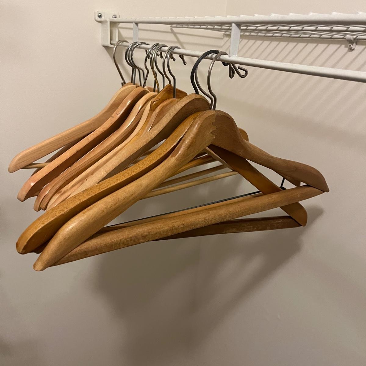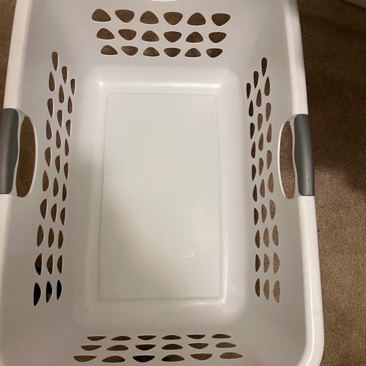 Lot includes a Black & Decker iron, nine wooden hangers, two plastic laundry baskets and a small portable ironing board. Largest basket measures 18” x 28” 12”H. Iron powered on when plugged in.