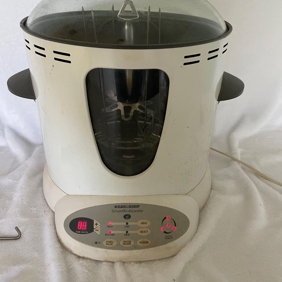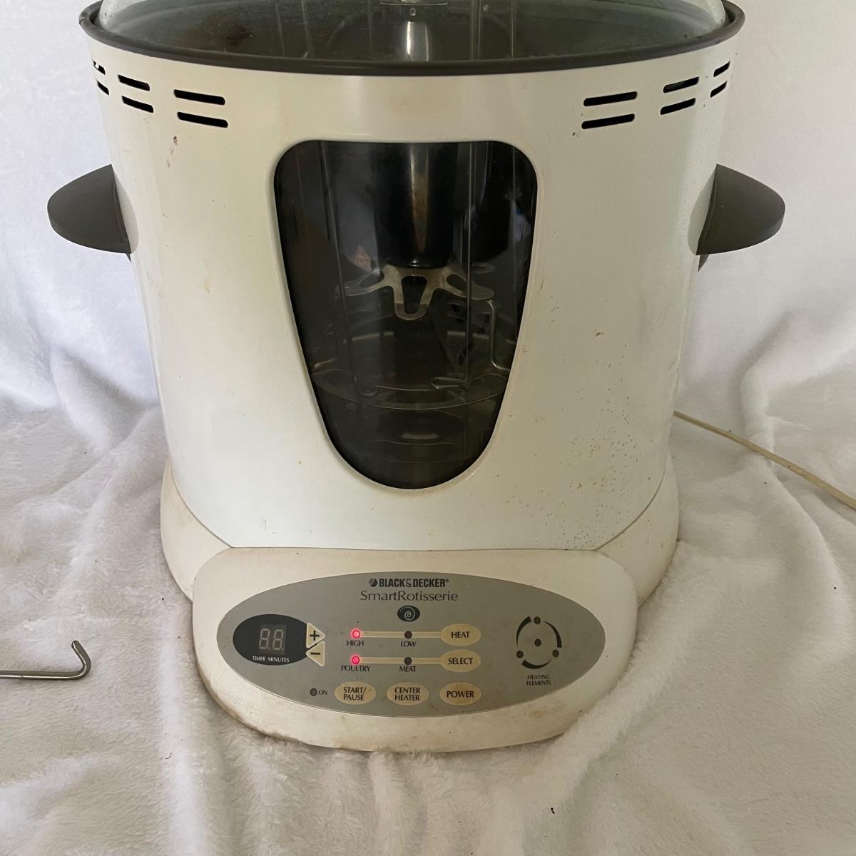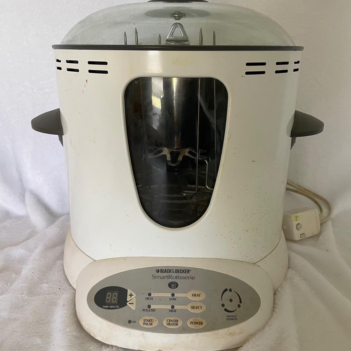 White Black & Decker Smart Rotisserie cooker. Provided with instructional manual. Powers on when plugged in. In good condition. Measures 11.5”H.