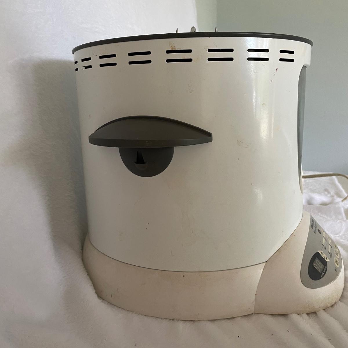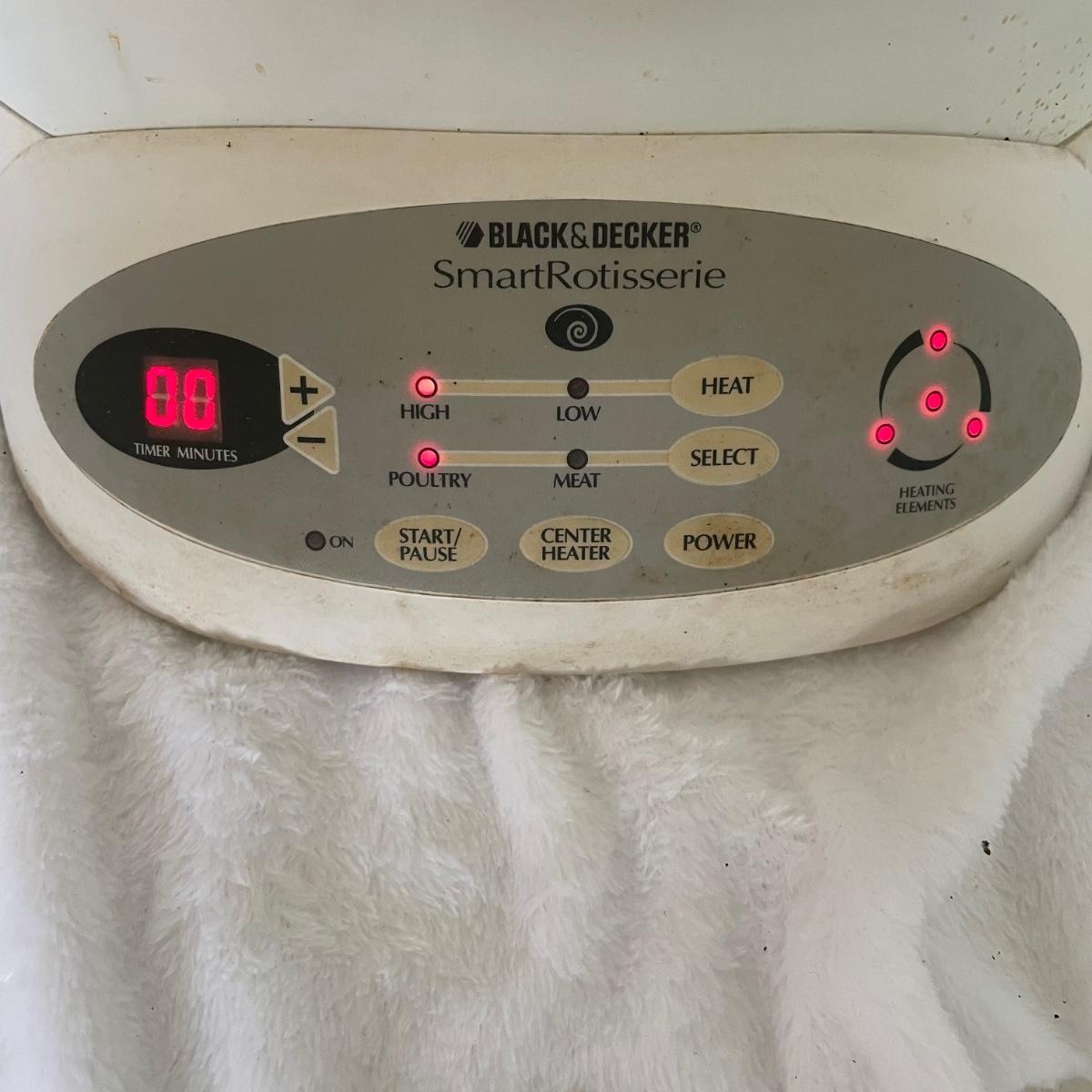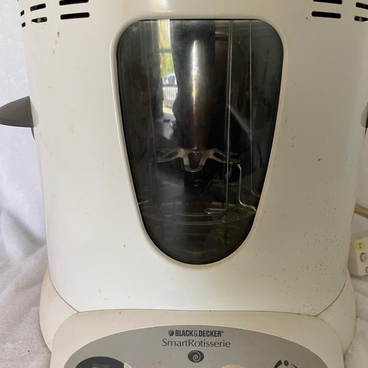White Black & Decker Smart Rotisserie cooker. Provided with instructional manual. Powers on when plugged in. In good condition. Measures 11.5”H.