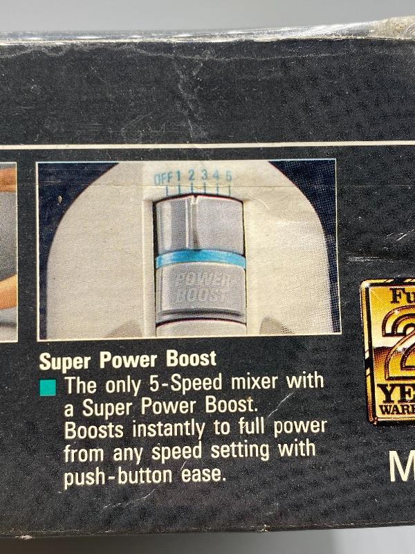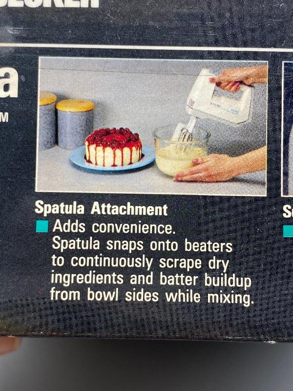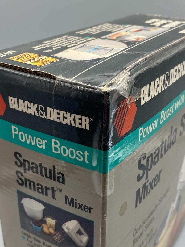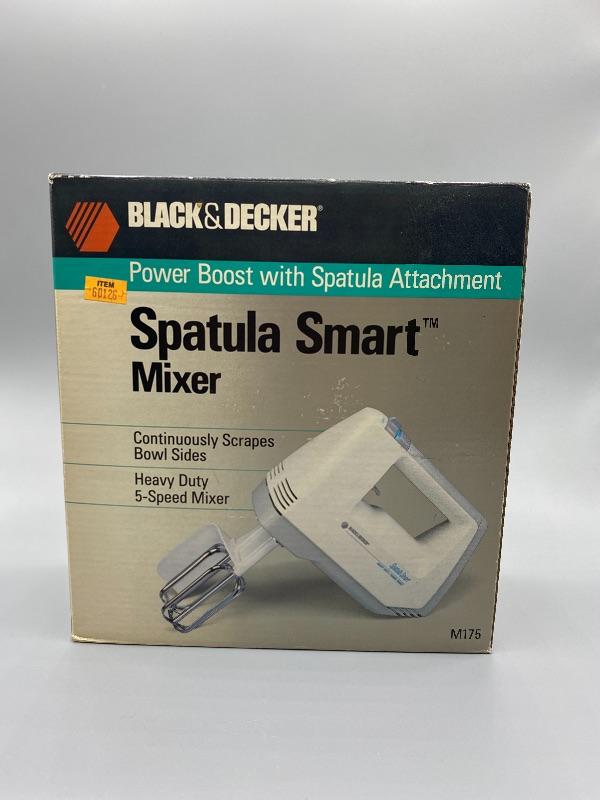 Black & Deccker hand mixer, new in box. Spatula Smart mixer has a scrapper attachment that scraps the bowl while you mix. 5 speed with power boost button. New, unused, but box has been opened.