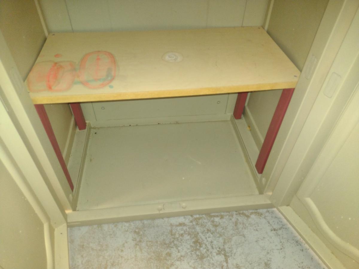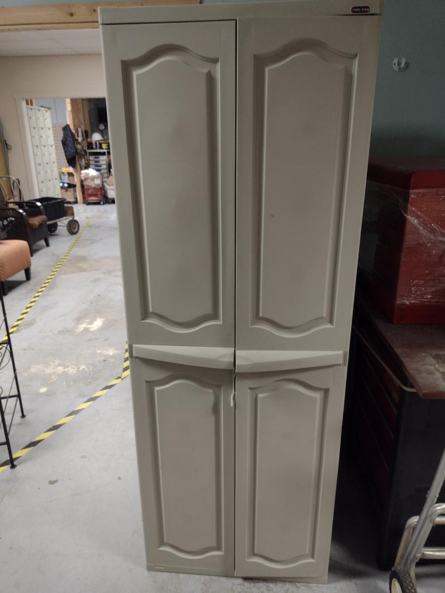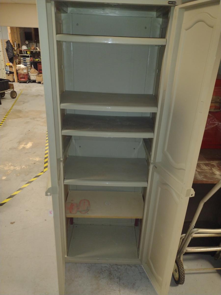 Black & Decker Storage Cabinet- Approx 25" x 17 1/2" x 69" Tall (Choice #1). Item has four adjustable shelves with homemade additional shelf in bottom- please see all pictures.
