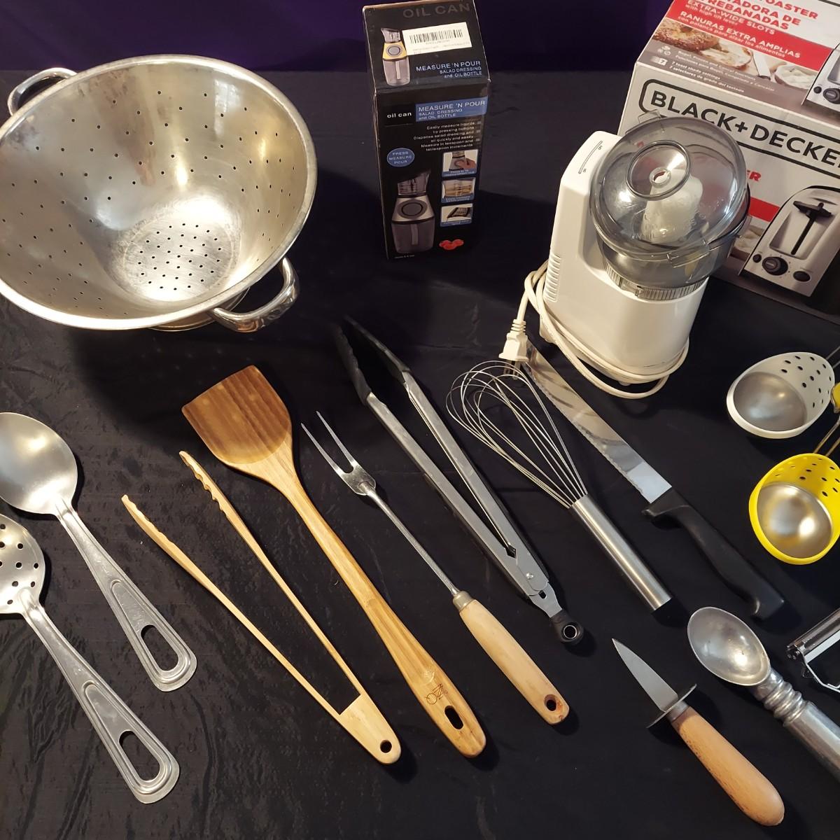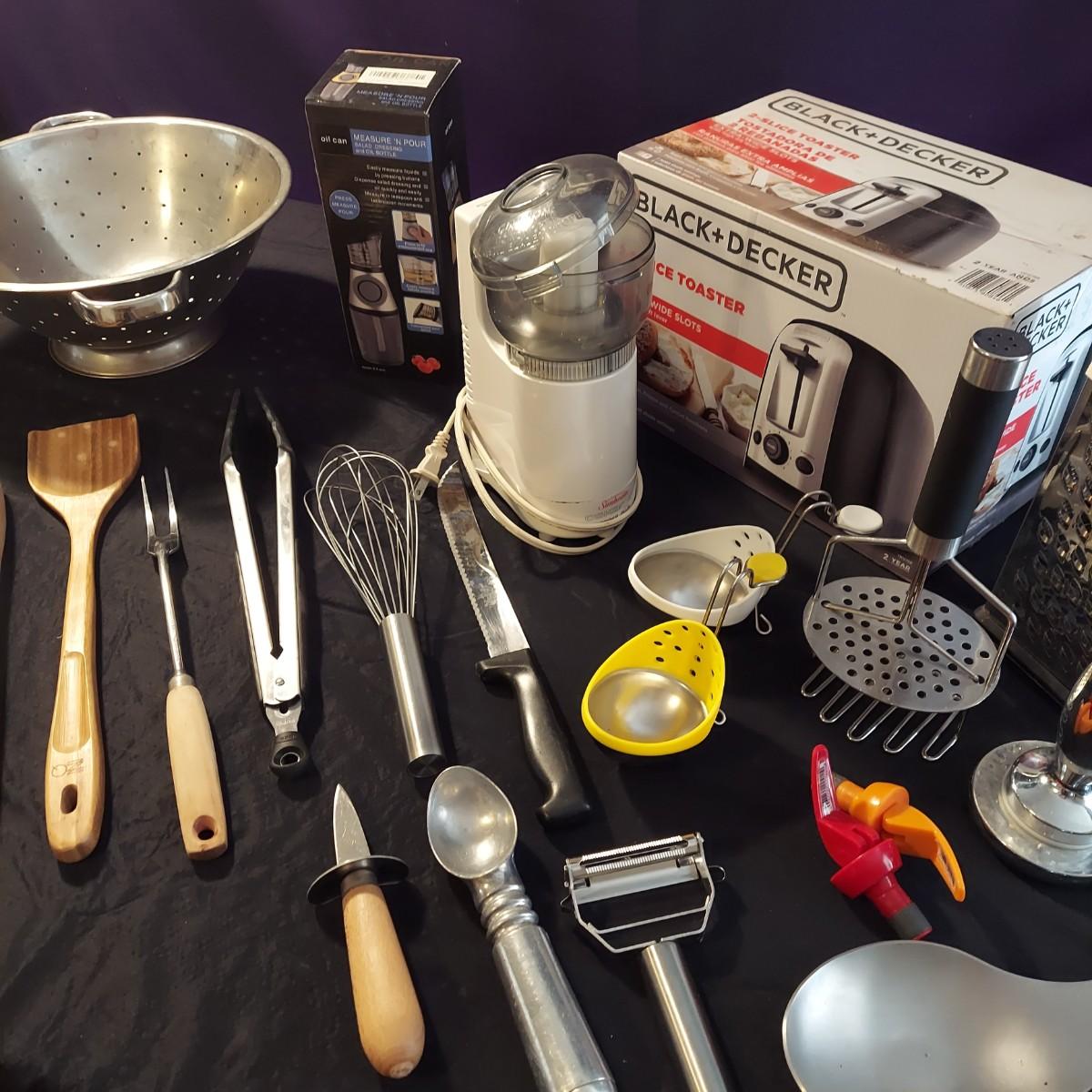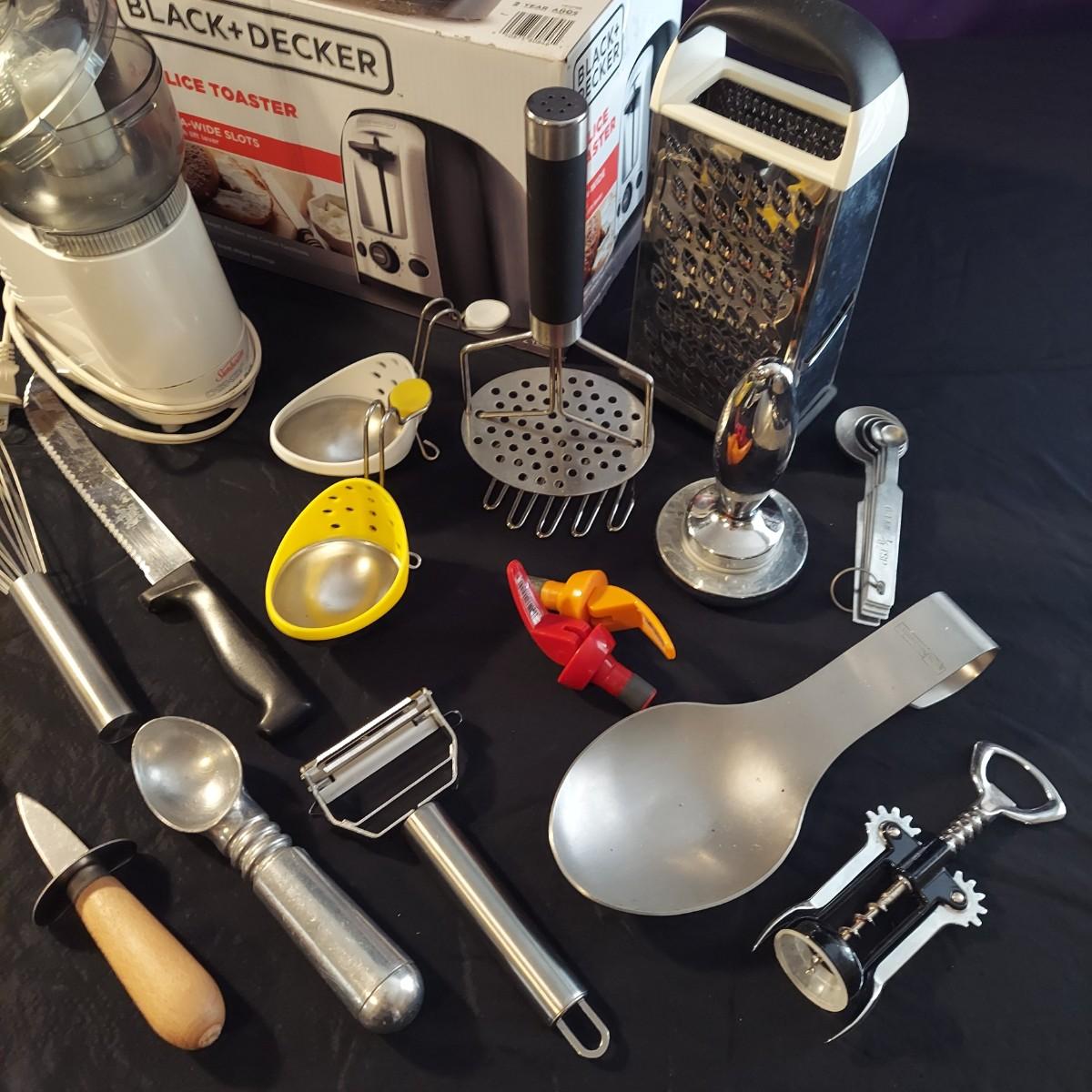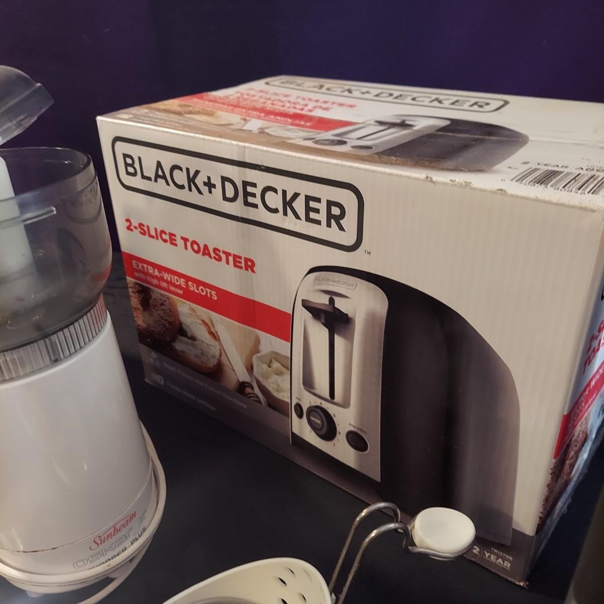 Lot includes a Black + Decker 2-slice toaster that appears to be unopened in the original box plus several kitchen utensils and gadgets. Metal strainer measures 12"D x 5"H. Sunbeam food chopper powered on when plugged in. Please see photos for details. Local Pickup Only