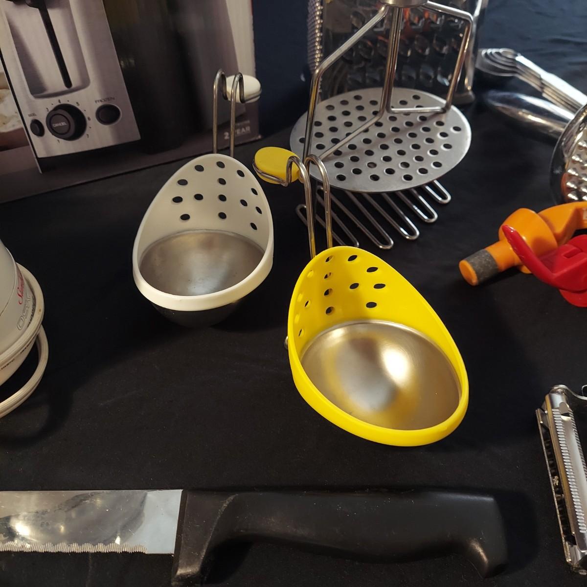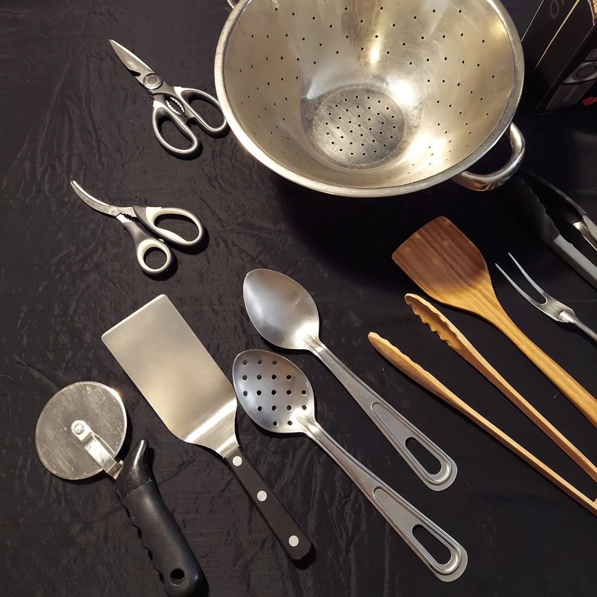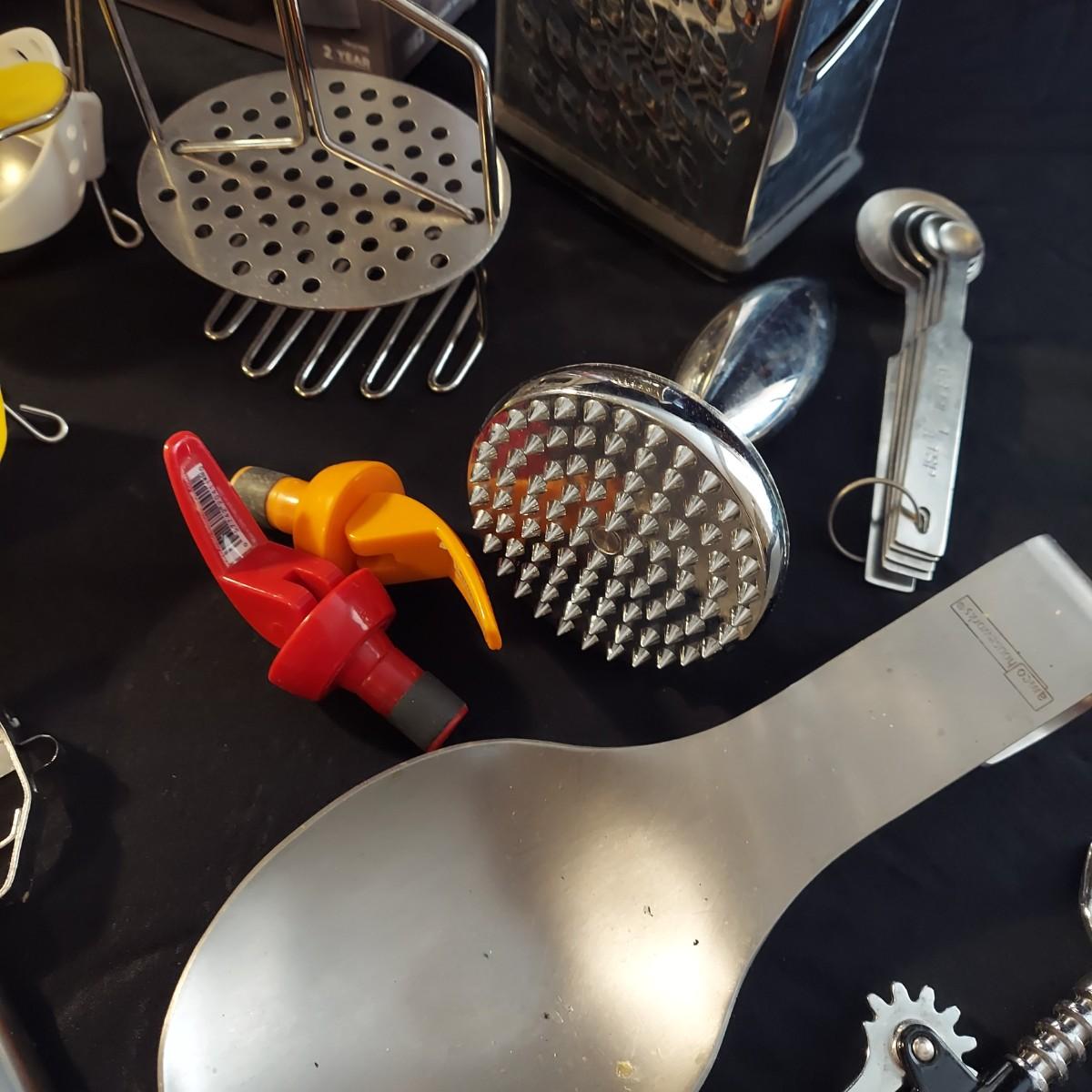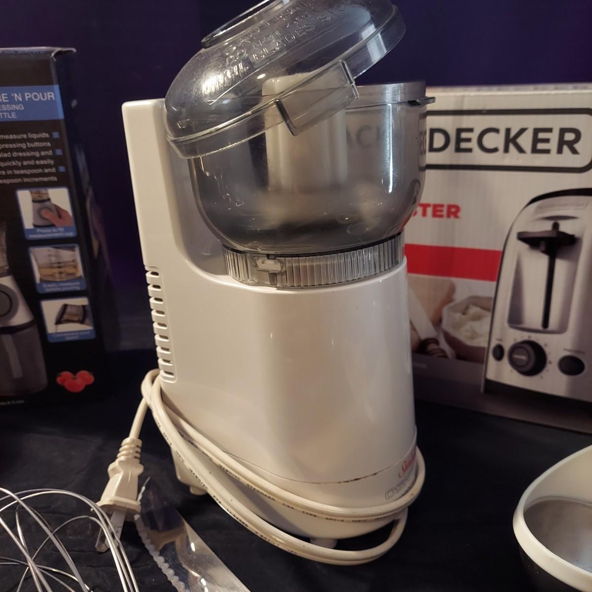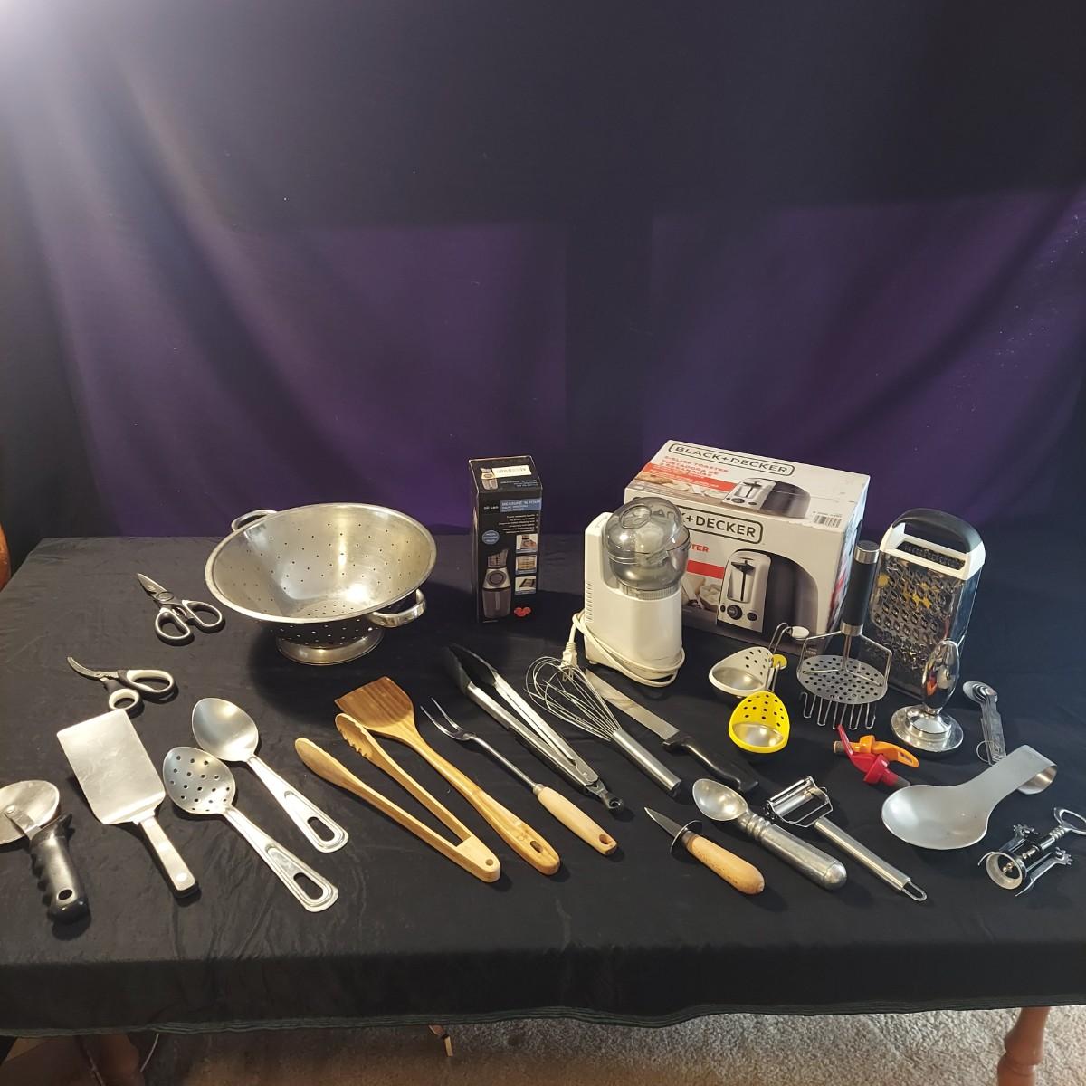 Lot includes a Black + Decker 2-slice toaster that appears to be unopened in the original box plus several kitchen utensils and gadgets. Metal strainer measures 12"D x 5"H. Sunbeam food chopper powered on when plugged in. Please see photos for details. Local Pickup Only