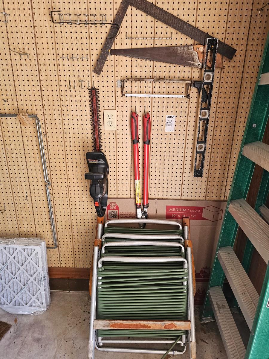 Lawn tools, saw, level, vintage lawn chairs (ladder & AC filters not included)