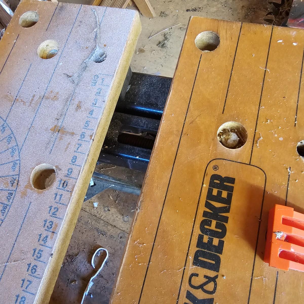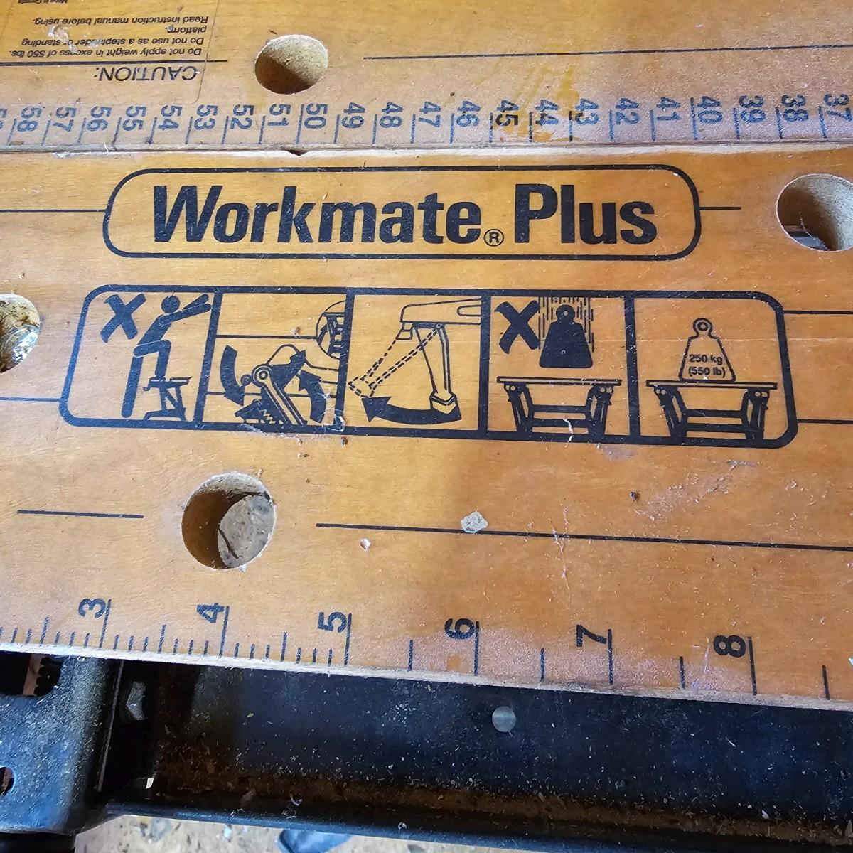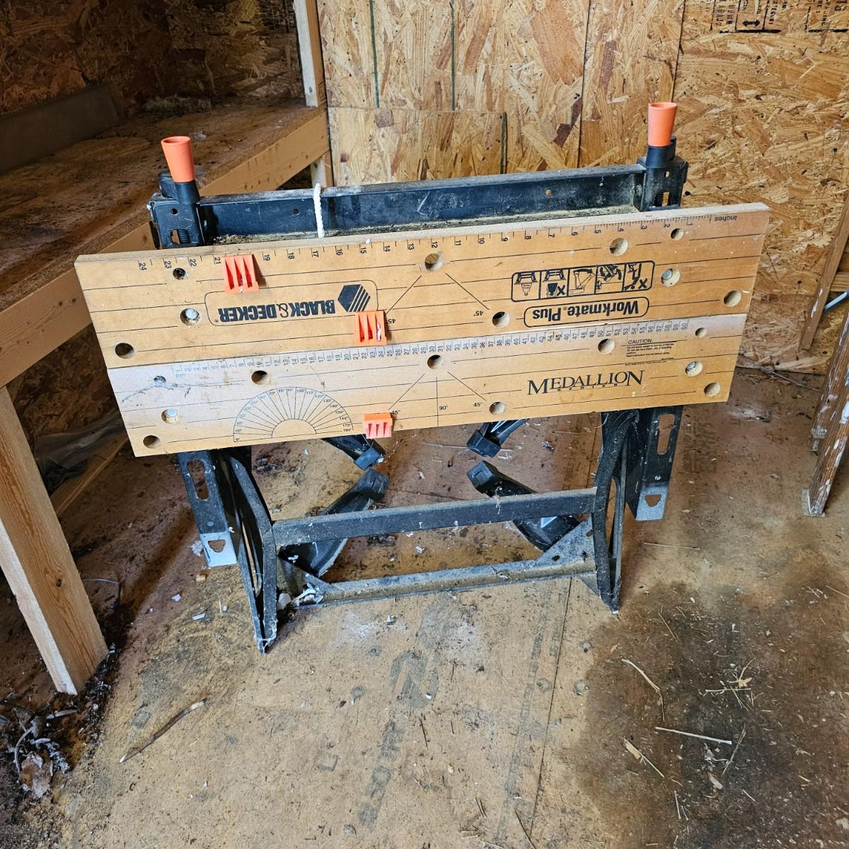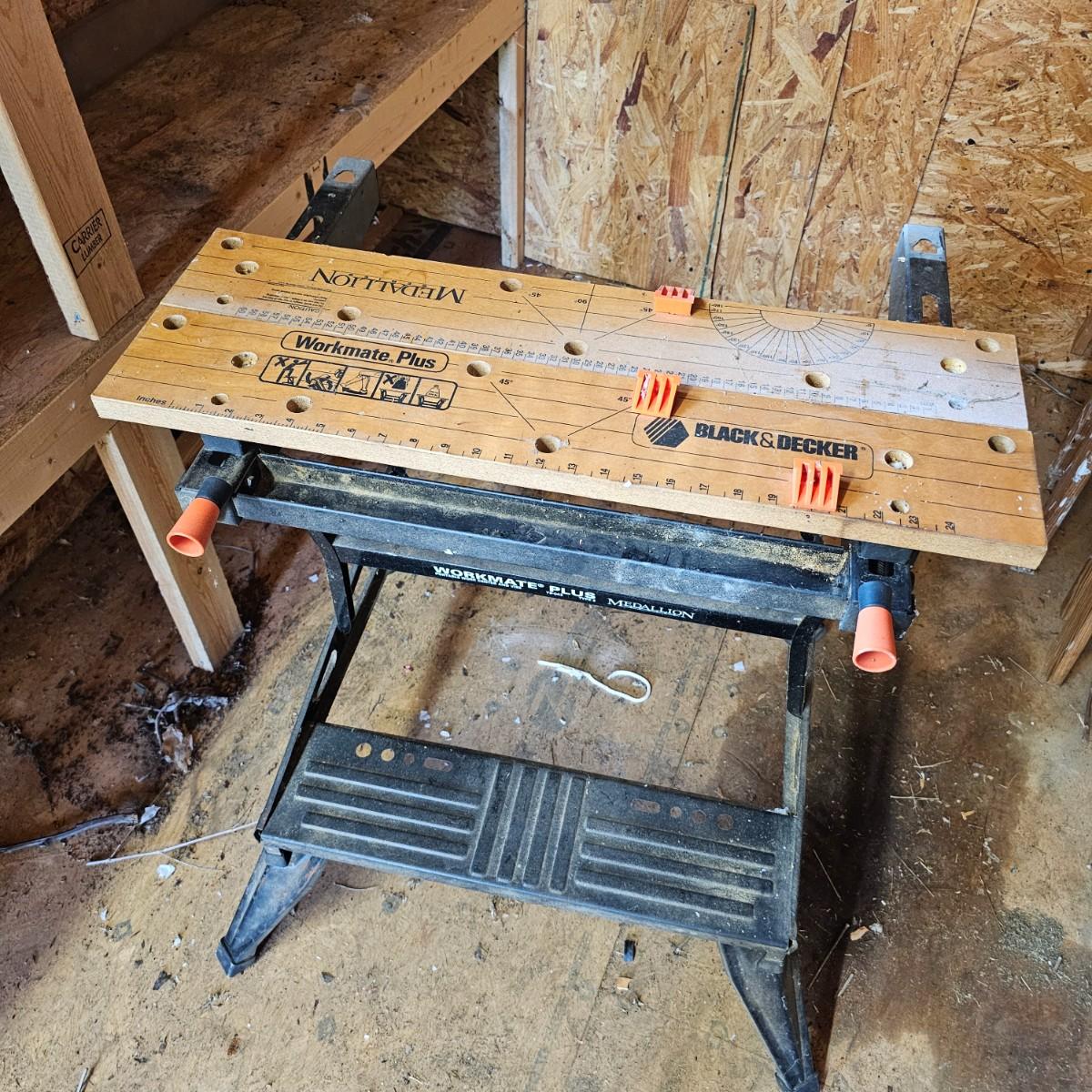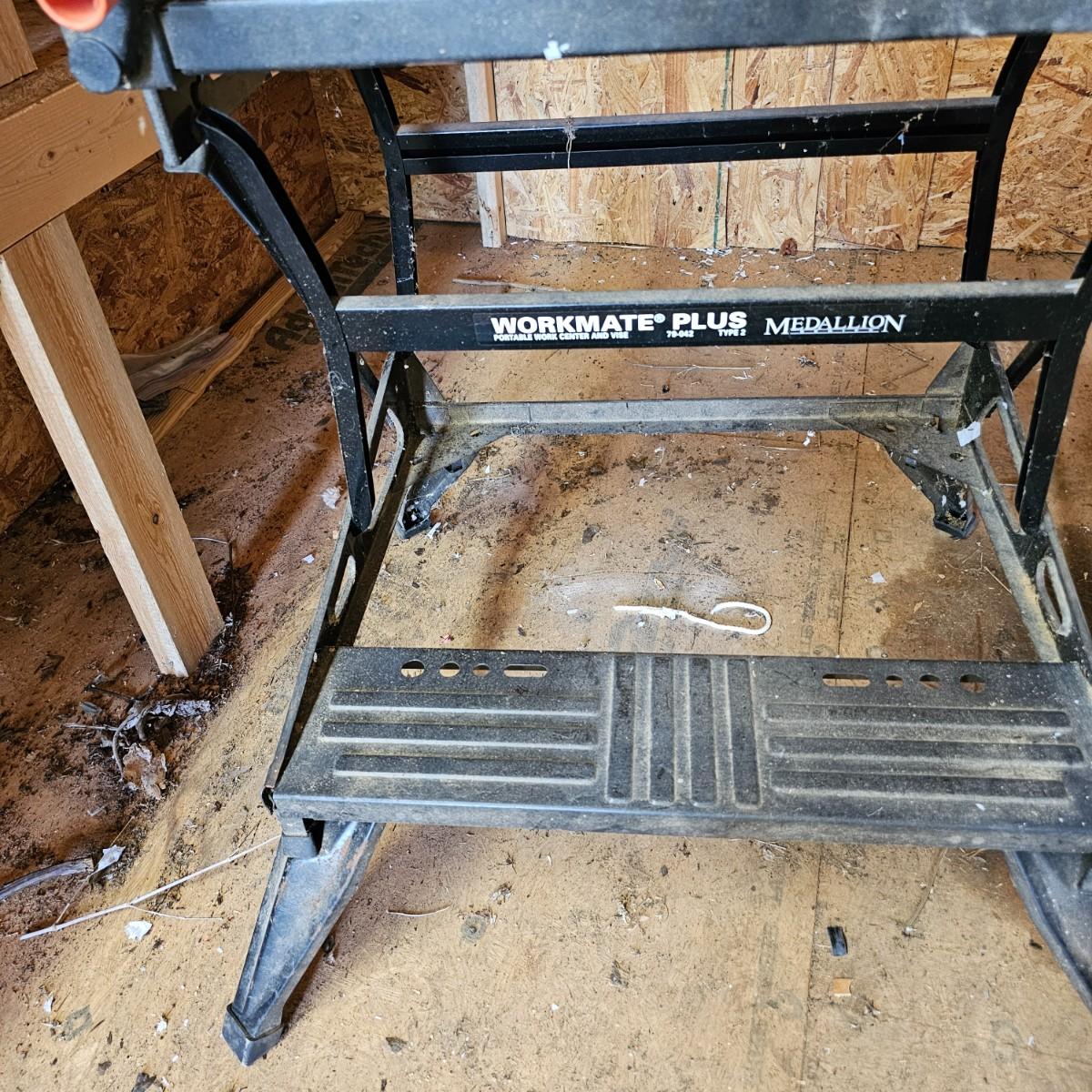 Portable work center and vise, the Black & Decker Workmate Plus goes where you need it to for any job. Sturdy step, wooden work surface with hold downs and an adjustable vice. Folds flat for easy storage and transport. Unit measures 28" x 29" x 31"H. Folding legs stay open, may not stay closed. See photos for details. Local pickup only.