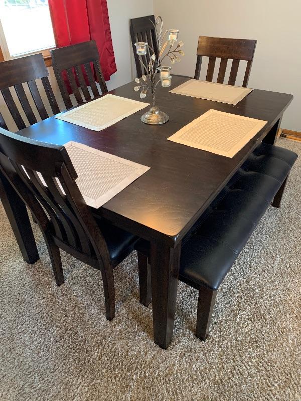 Well cared for dining table 5 ft x 42" 5 chairs and bench. Black