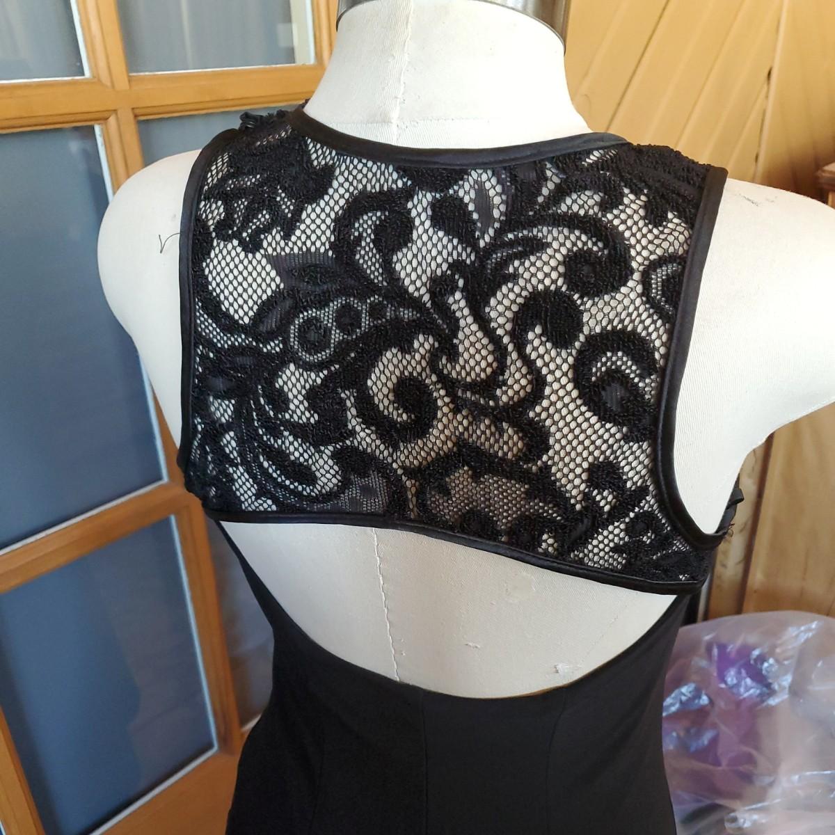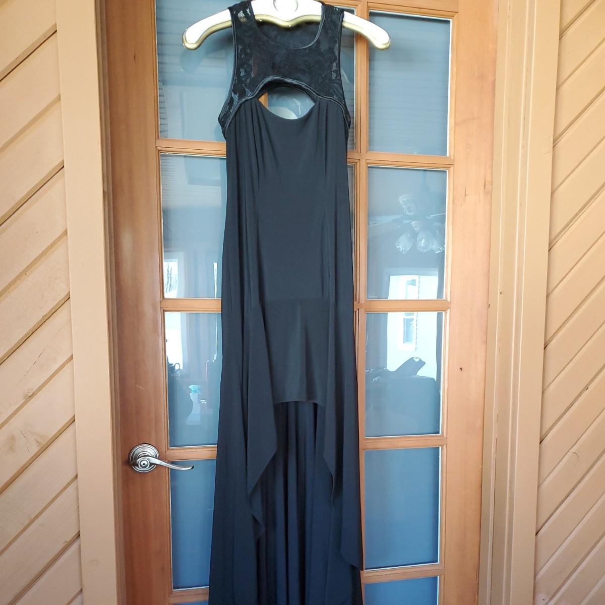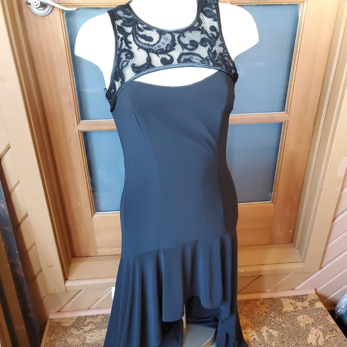 Black dress blonde notes by Stacy Sklar size 5 High Low Hem Lace Bodice