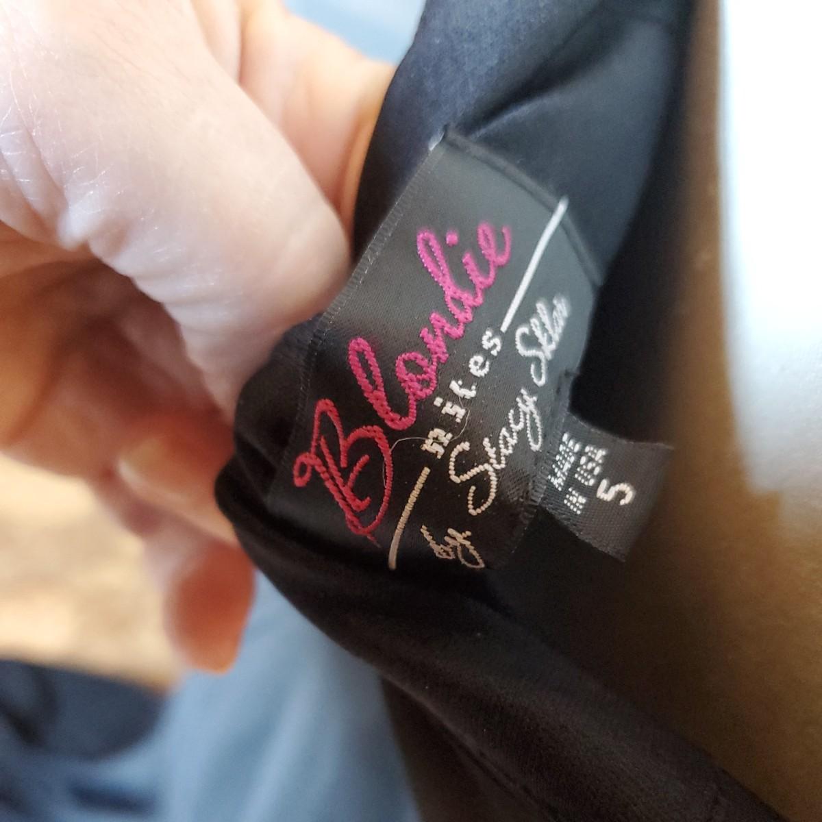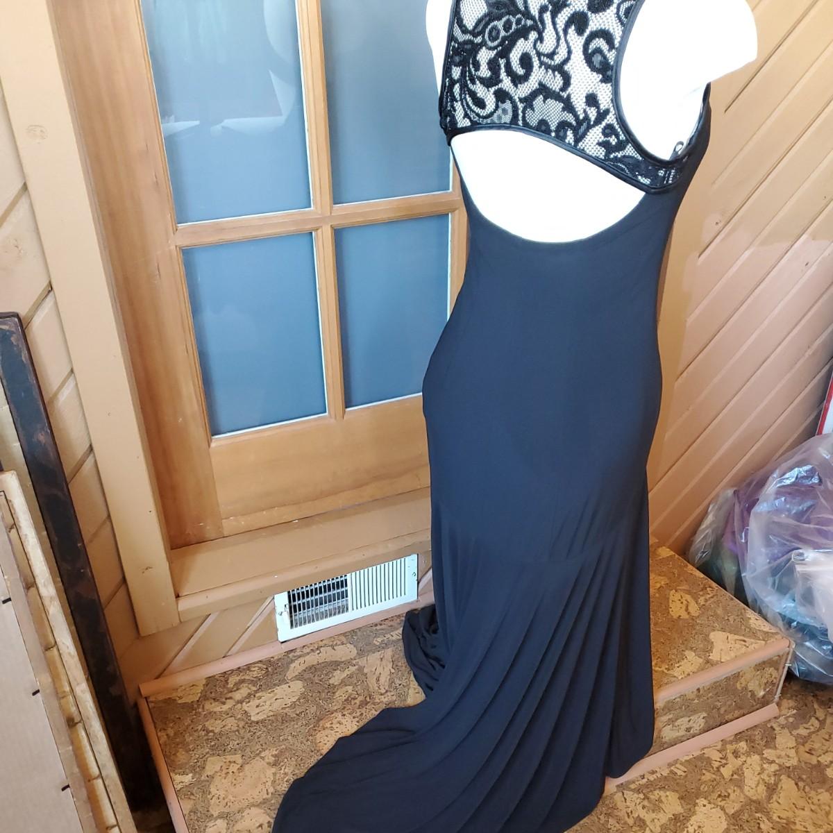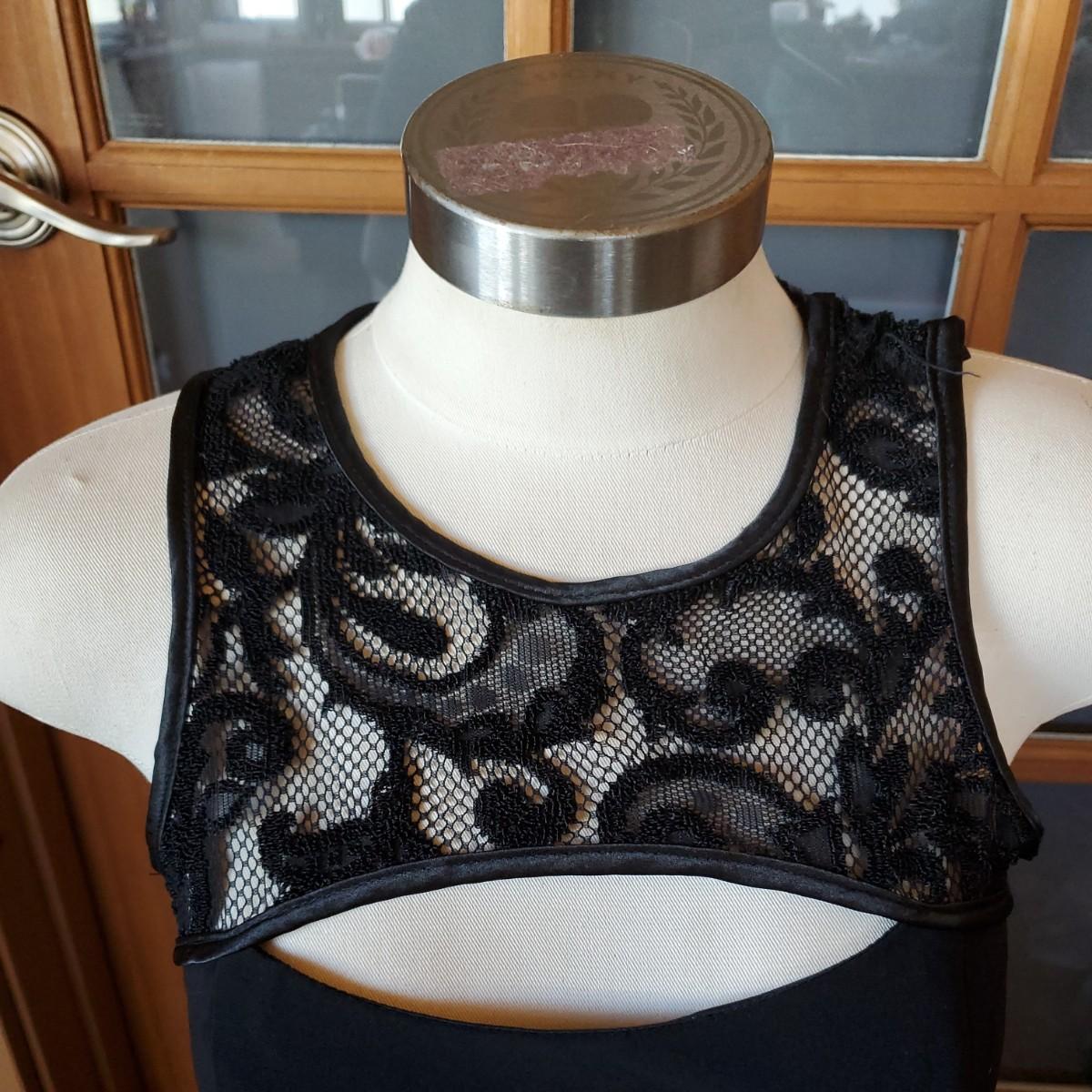 Black dress blonde notes by Stacy Sklar size 5 High Low Hem Lace Bodice