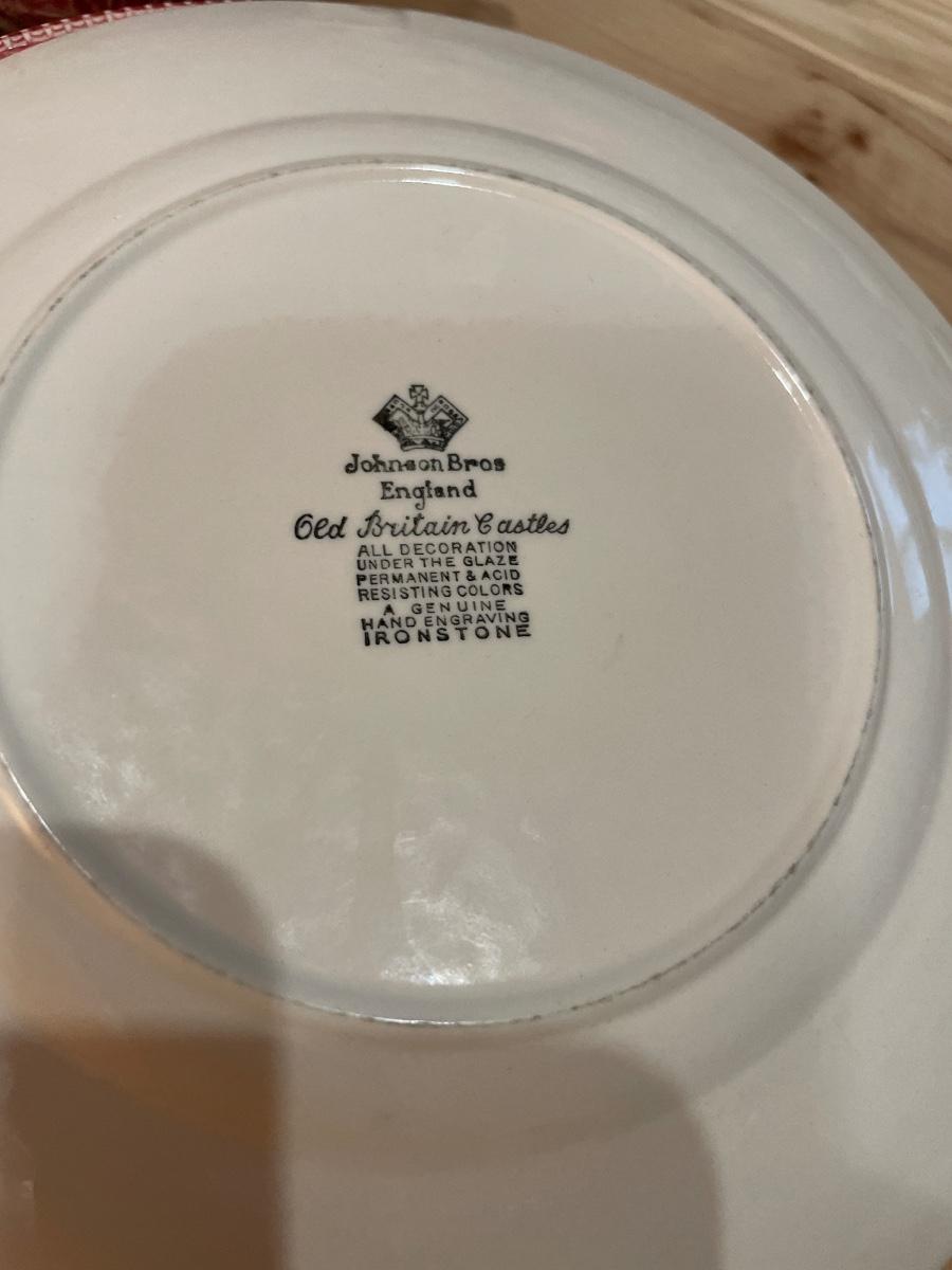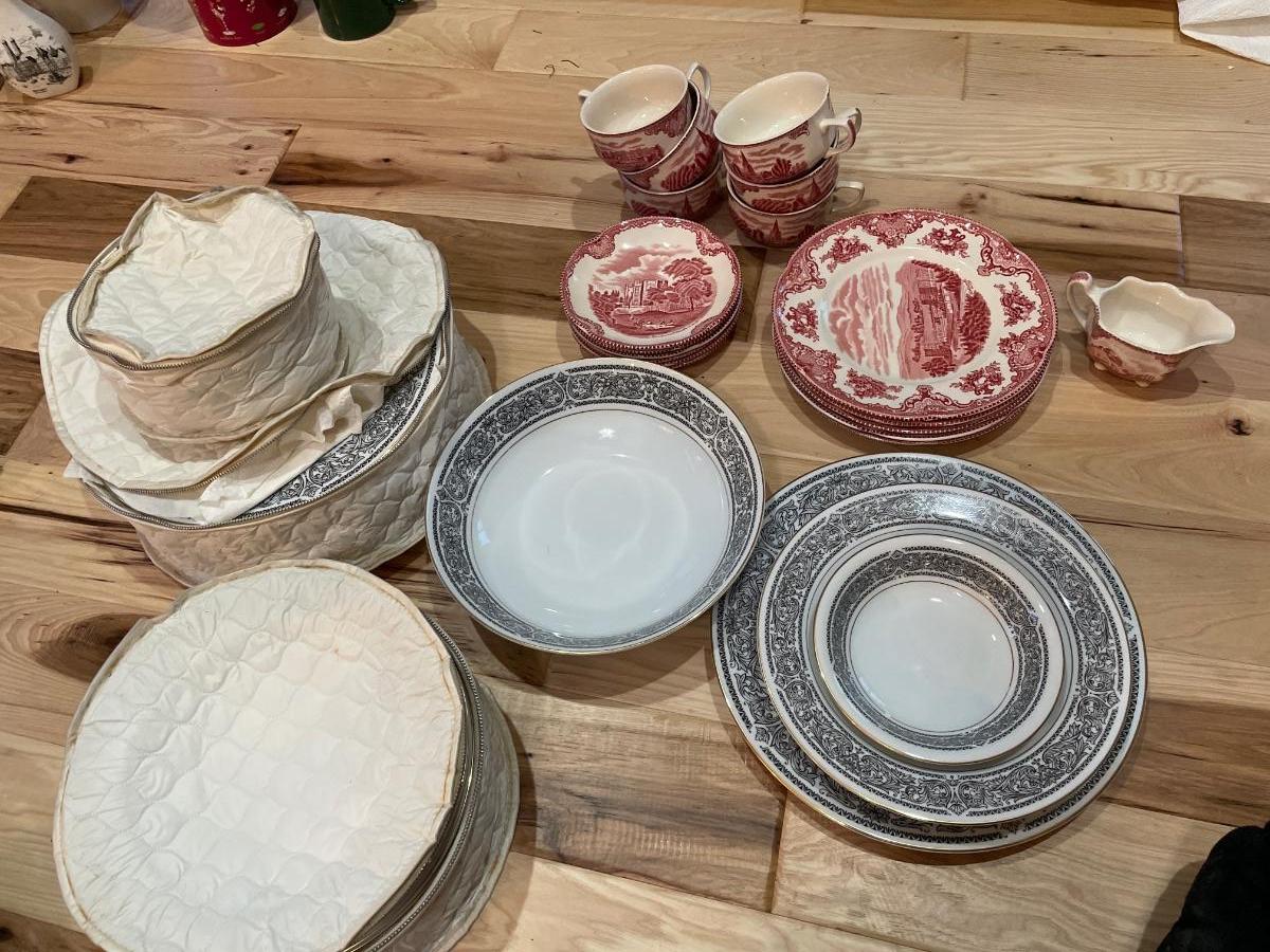 Black edge Mikasa and Johnson Bros tea cups and desert plate