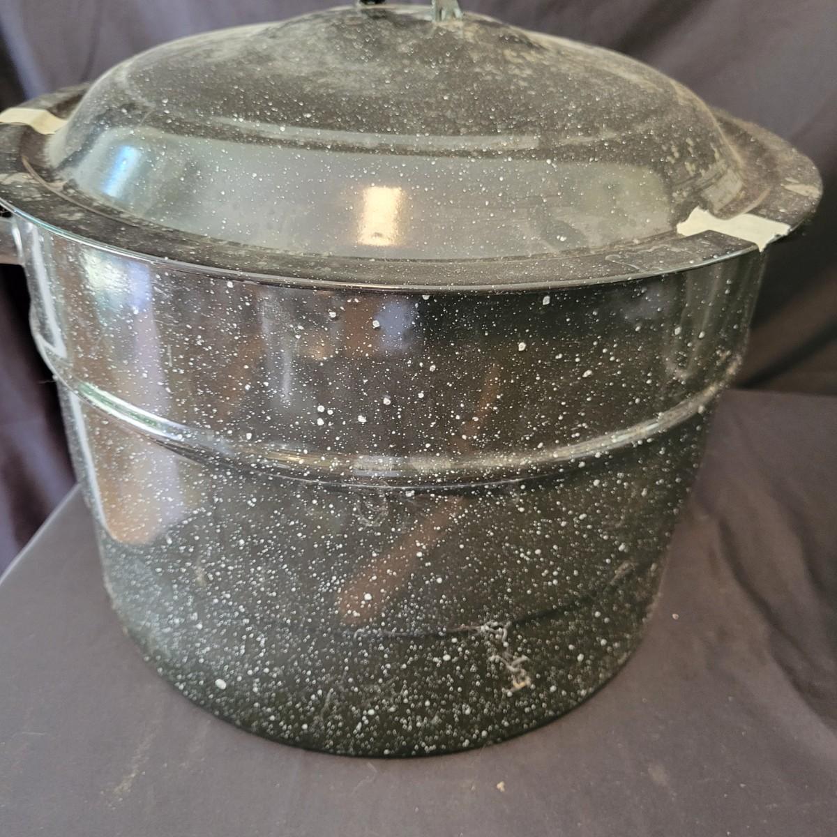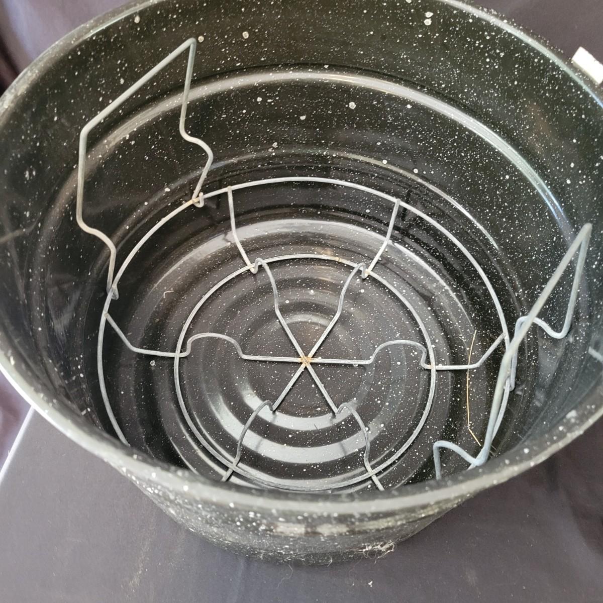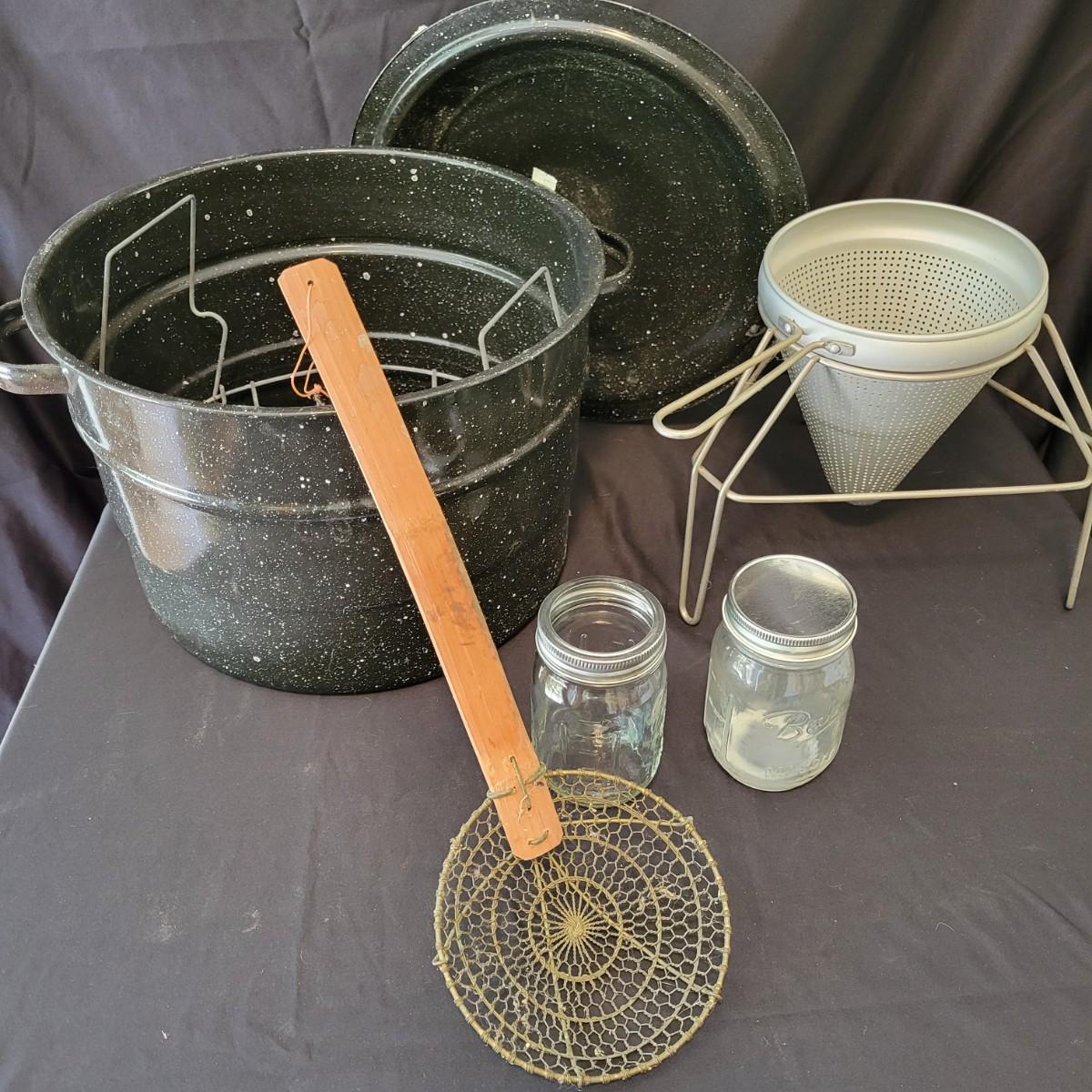 Large black enamel canning pot with wire rack to protect and remove jars. Pot measures approximately 14" x 13". Also includes a metal strainer with a bamboo handle, 2 Bell mason jars and an aluminum cone strainer with stand. Shipping available