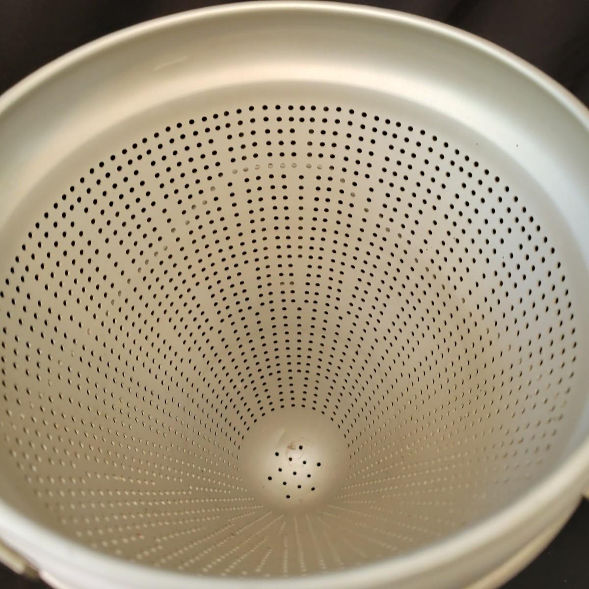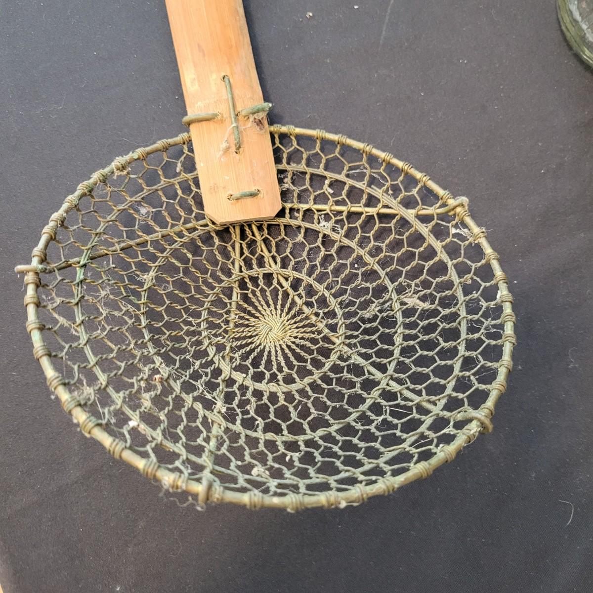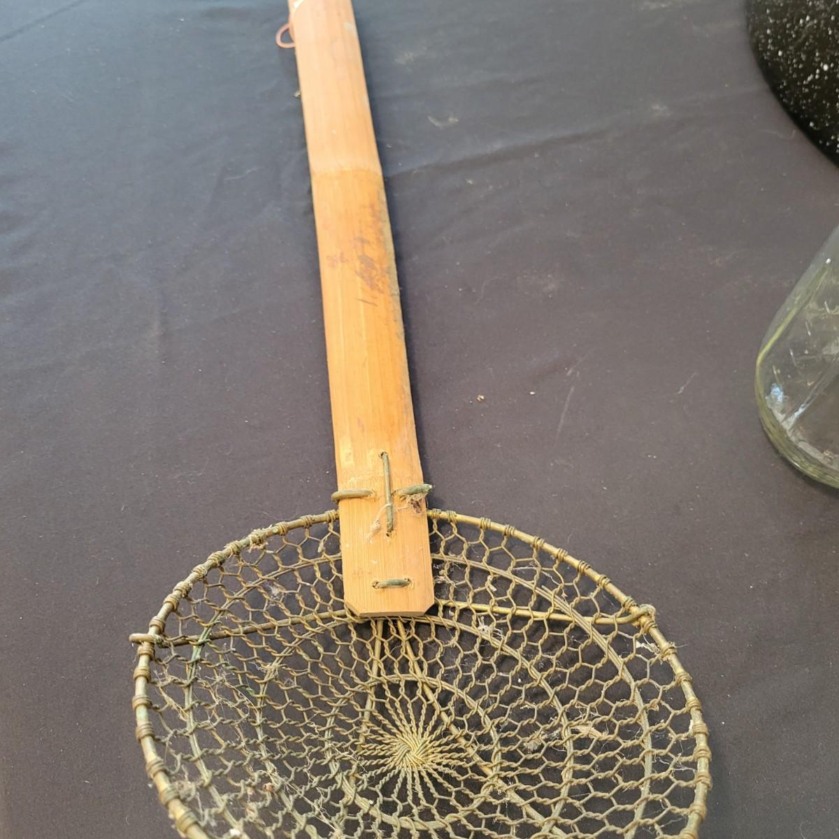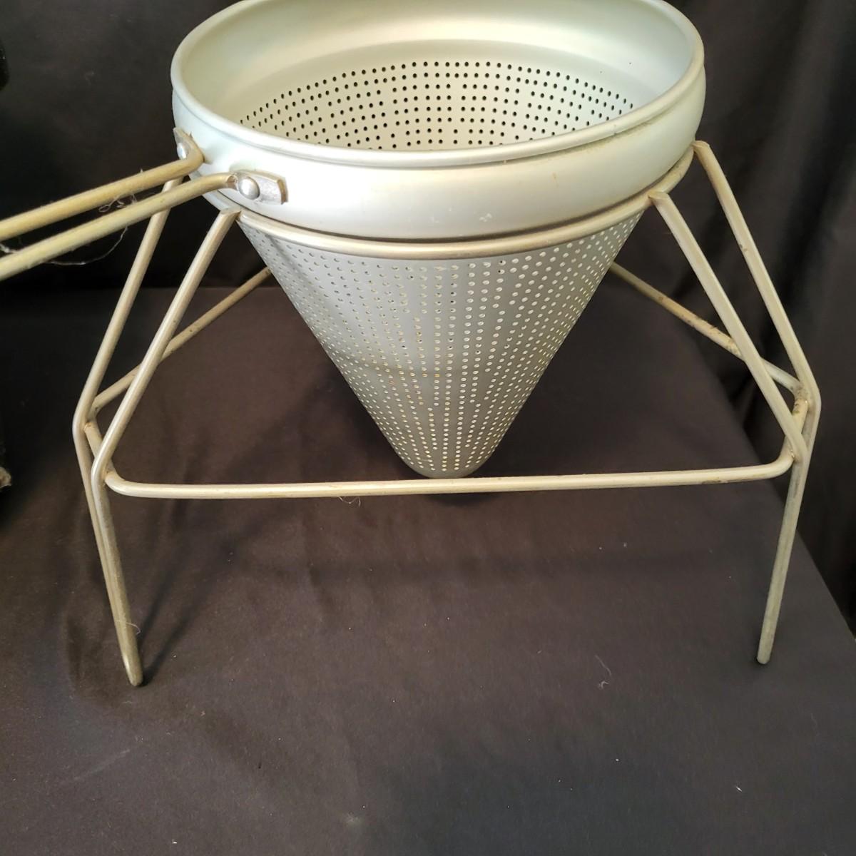 Large black enamel canning pot with wire rack to protect and remove jars. Pot measures approximately 14" x 13". Also includes a metal strainer with a bamboo handle, 2 Bell mason jars and an aluminum cone strainer with stand. Shipping available