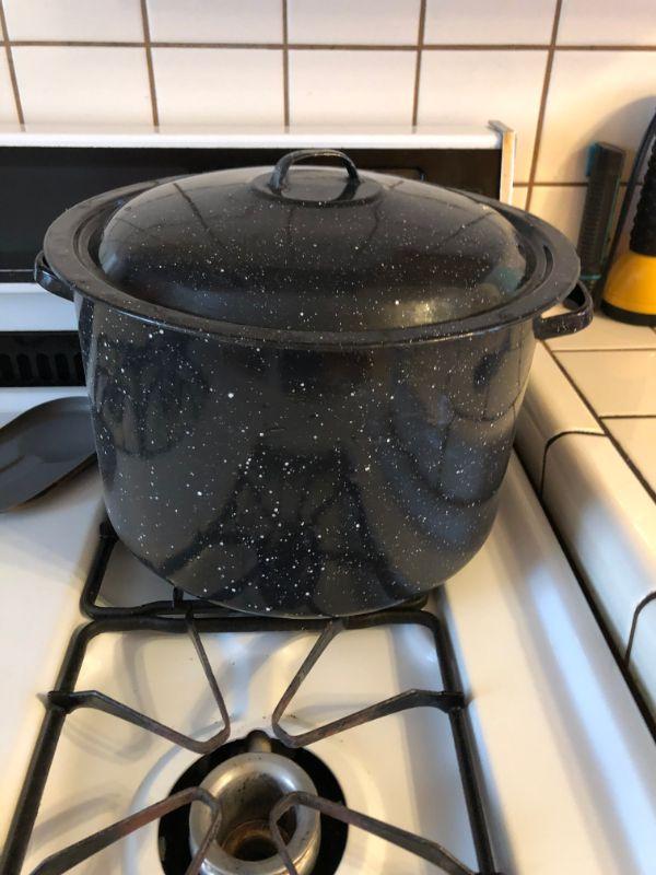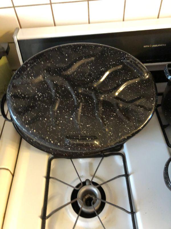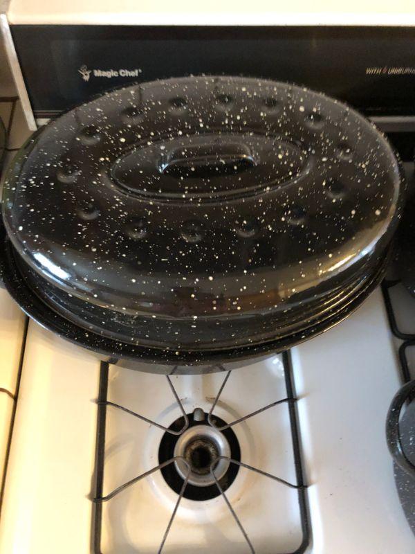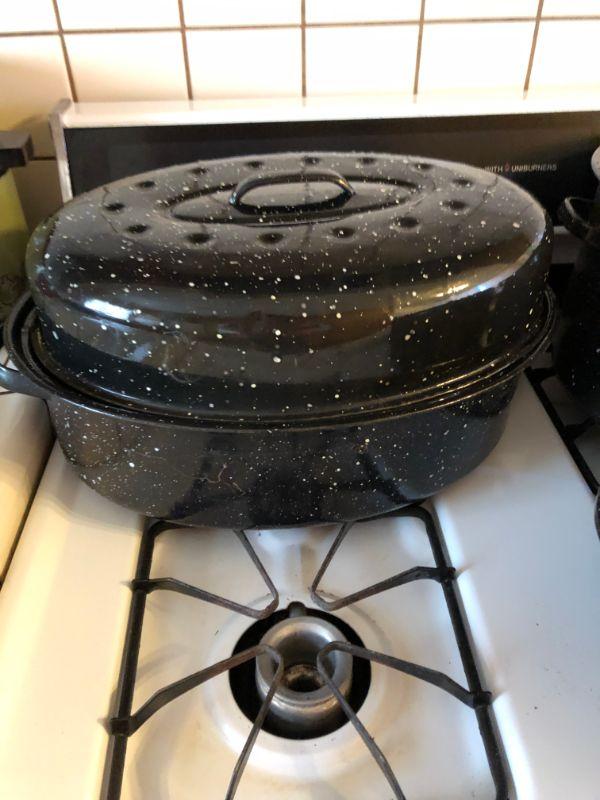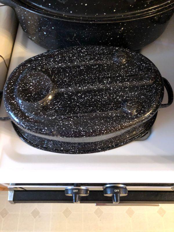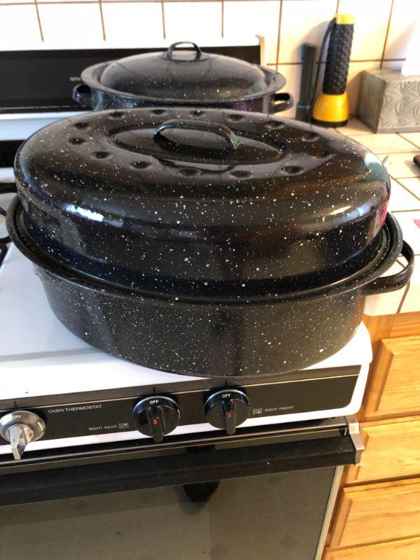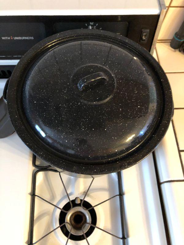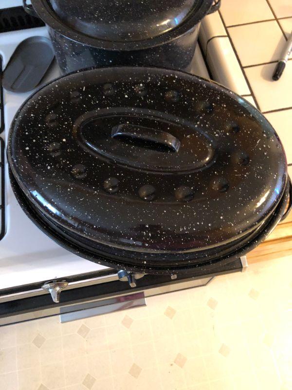 Black Enamelware Speckled Roasting Pans & Stock Pot, 3 pc lot w lids