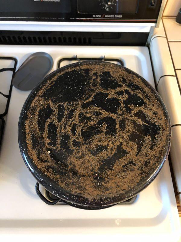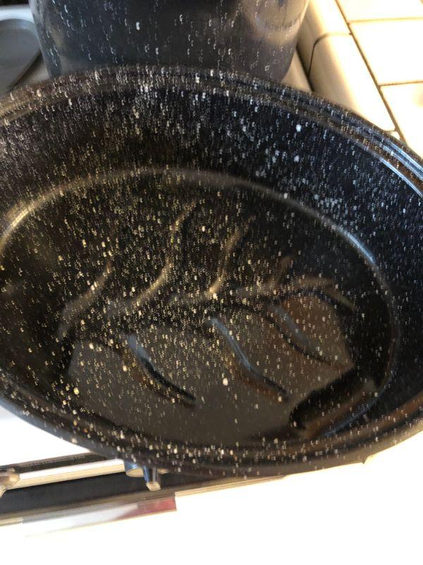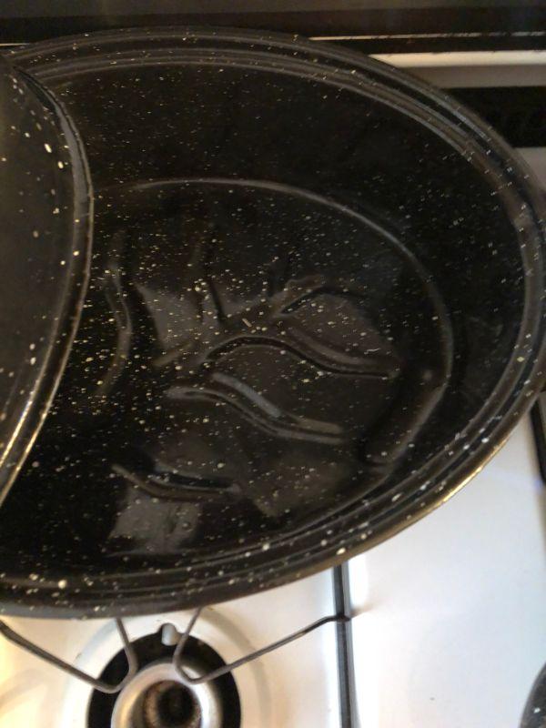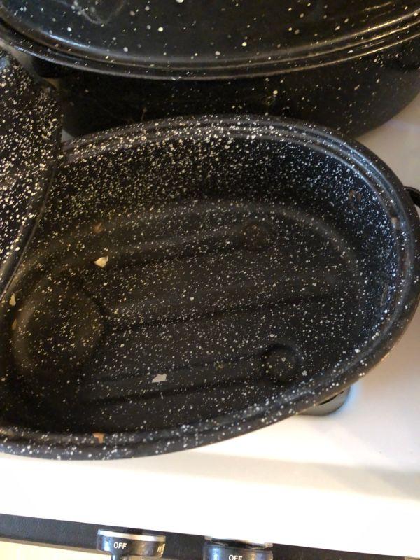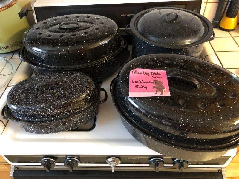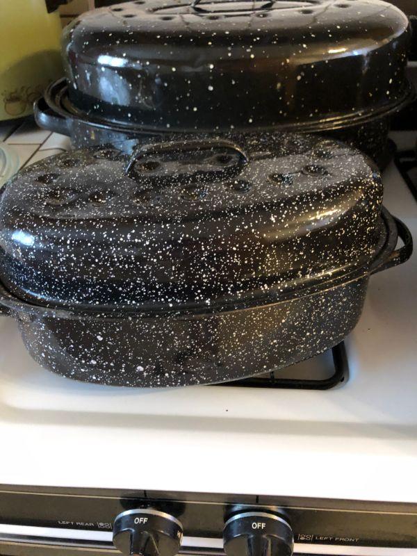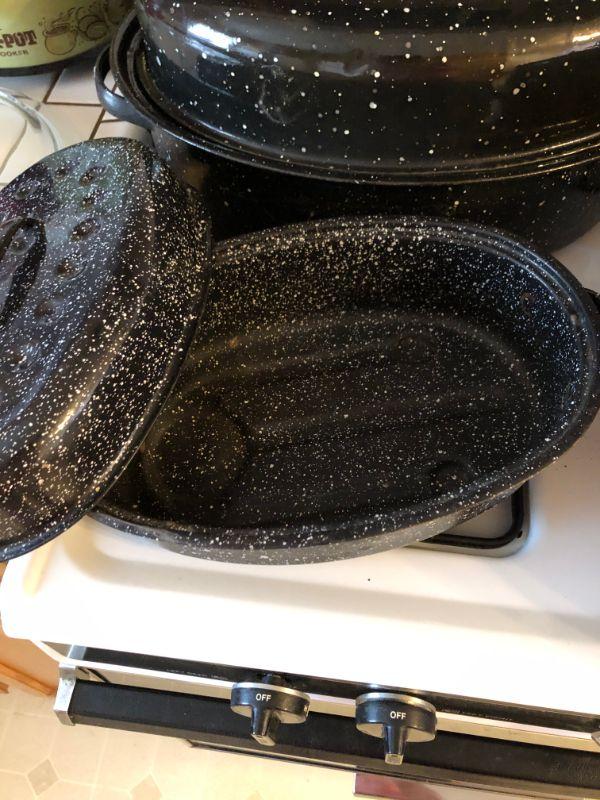 Large and Small roaster plus large stockpot. Traditional Black with white speckles. In fair to good condition.