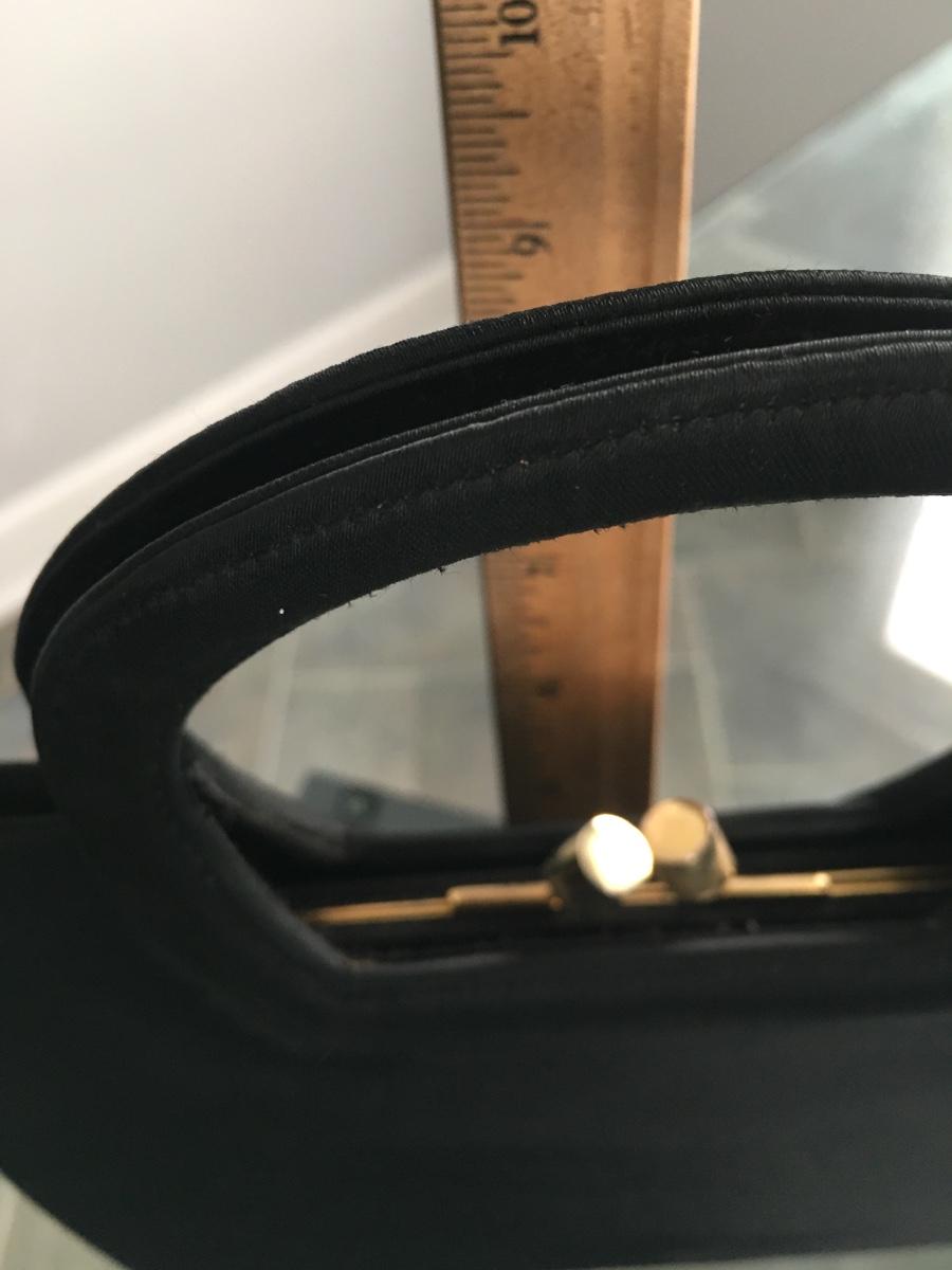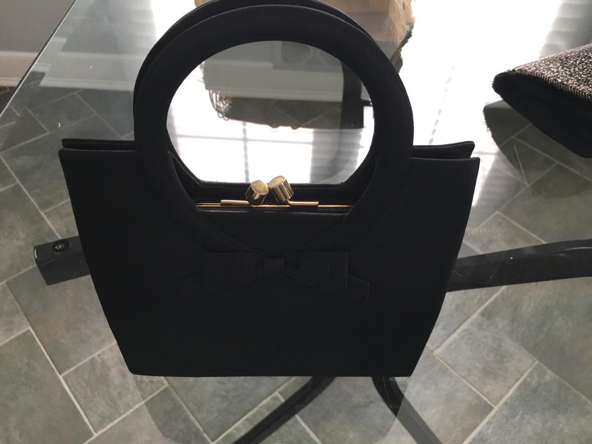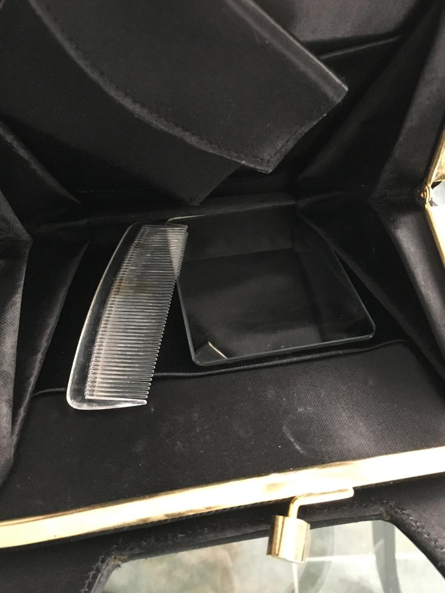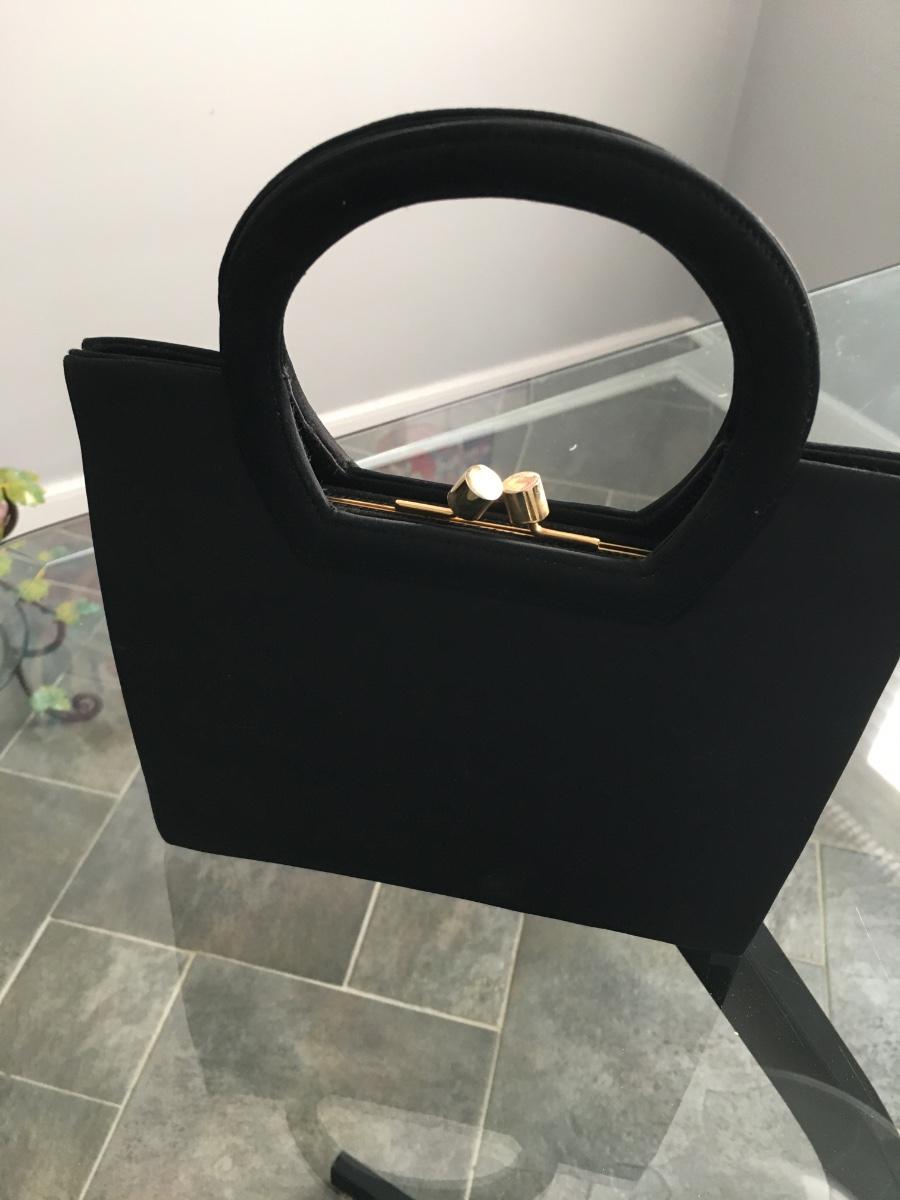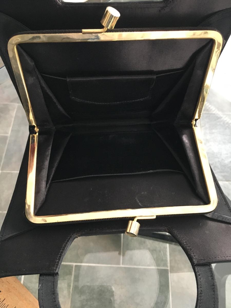 Cloth evening bag thatsnaps closed. Has small mirror, comb and tiny chane purse. Excellent condition.