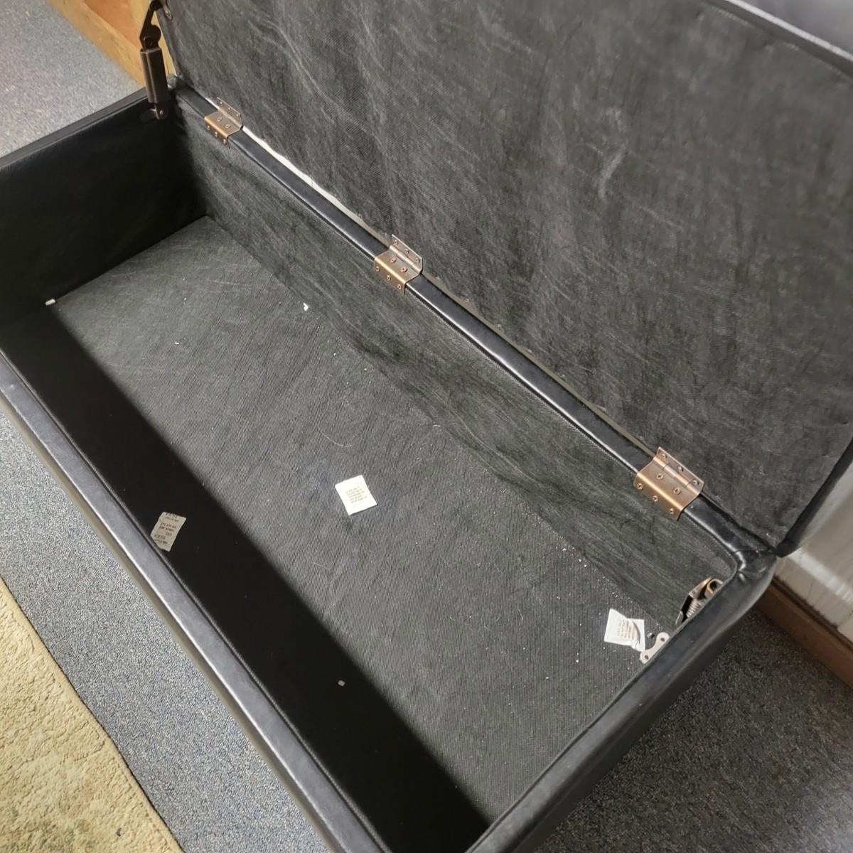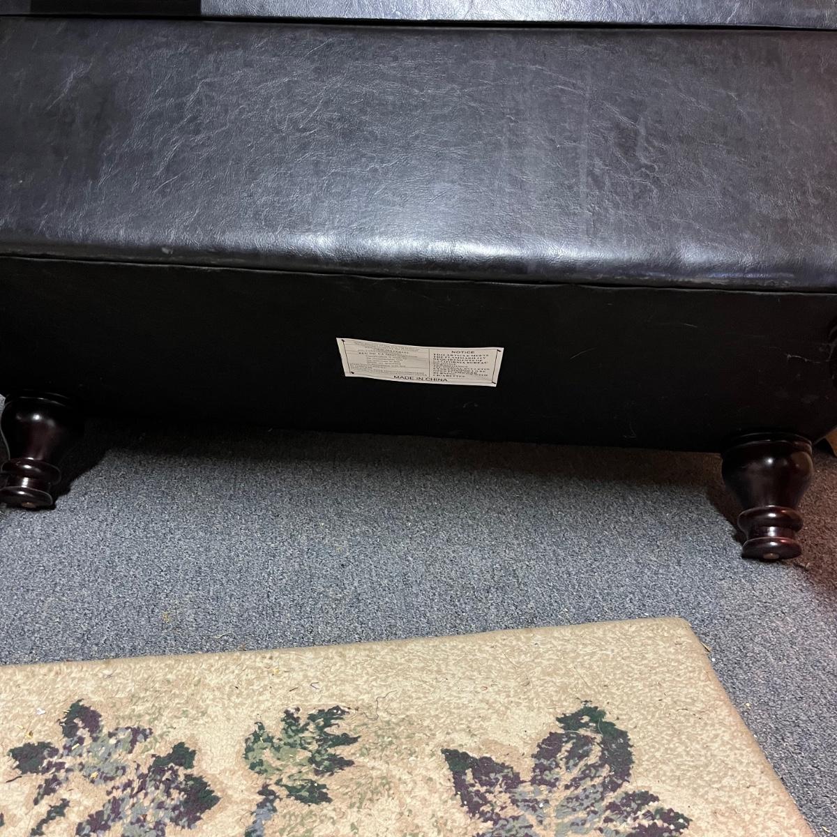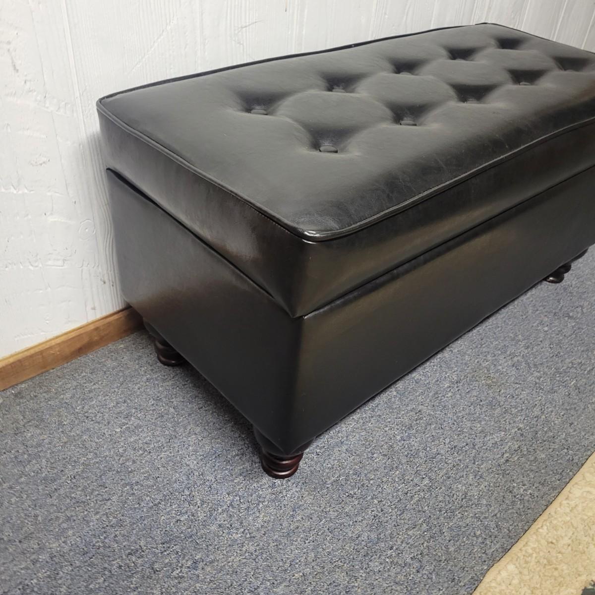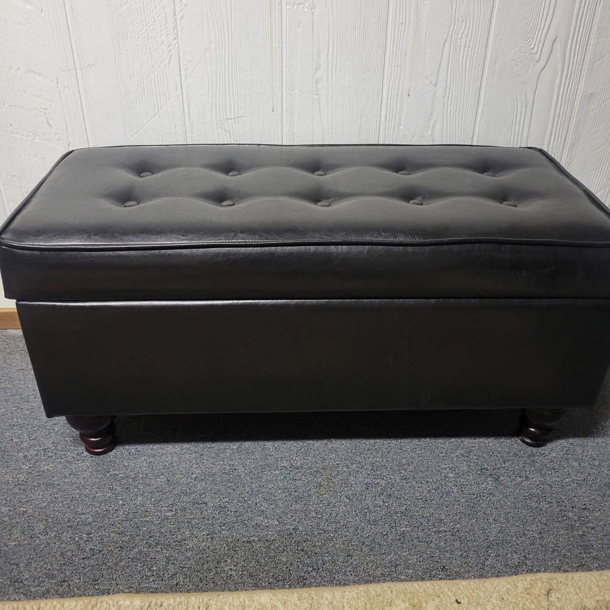 A black faux leather chest/bench that is in good condition. There are no notable tears or blemishes on the fabric, but one internal hinge has come undone, but should be an easy fix. Chest has wooden legs and measures approximately 38" x 17" x 18.5" Local pickup only