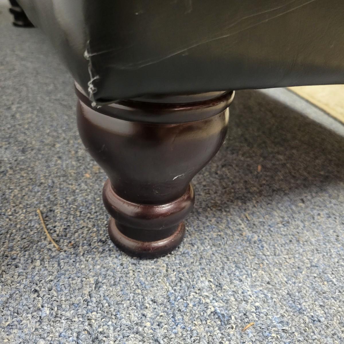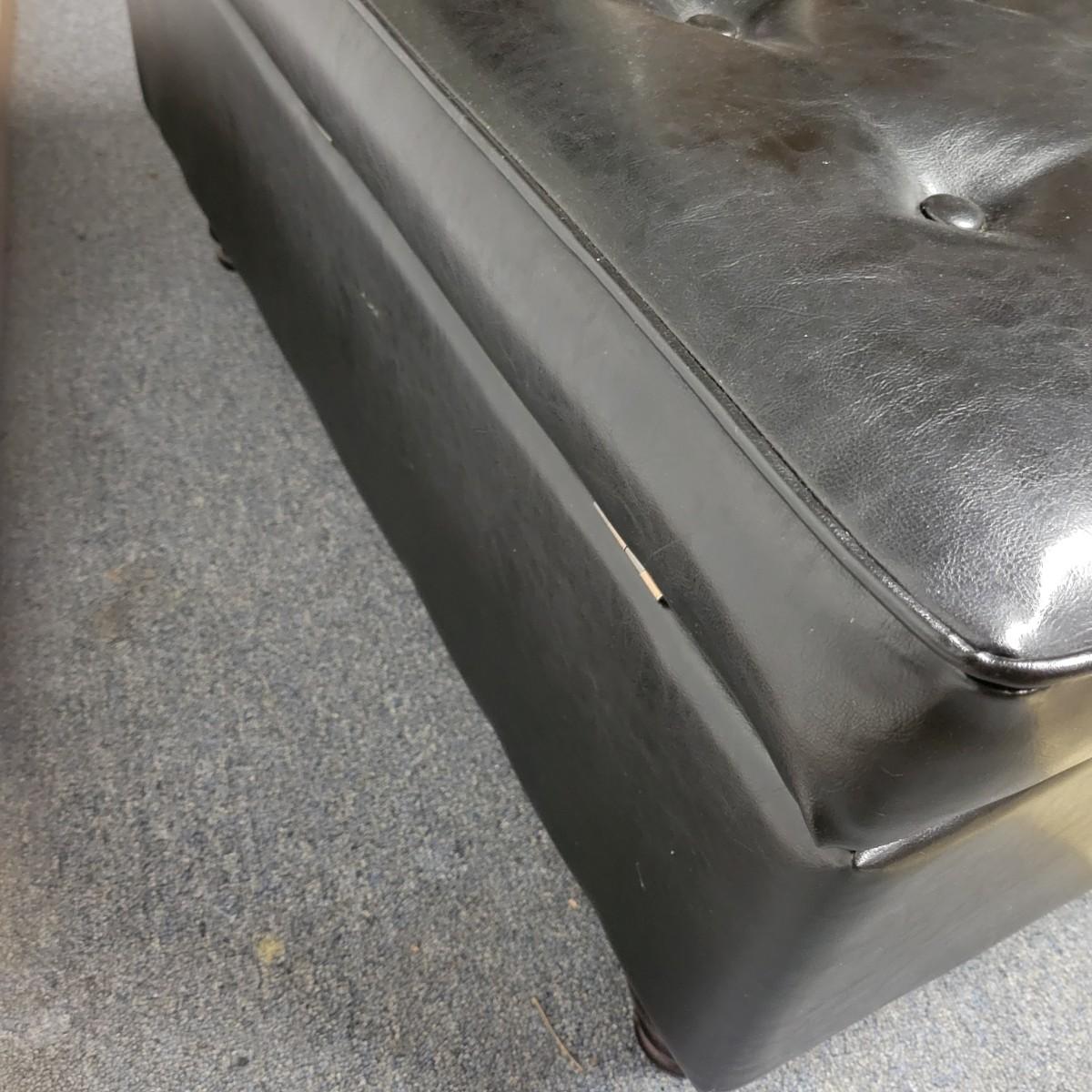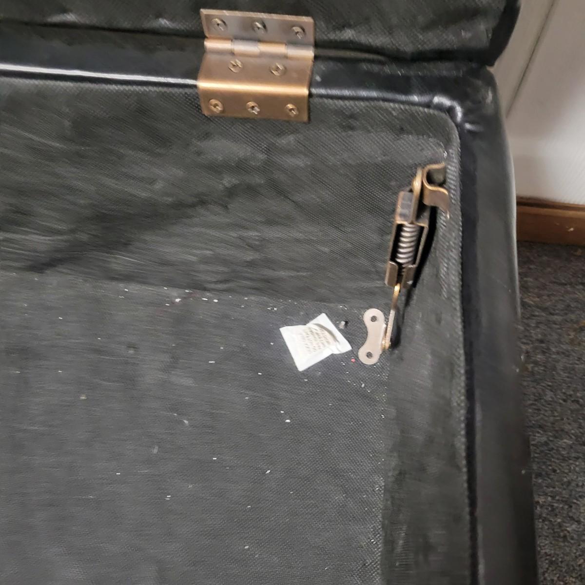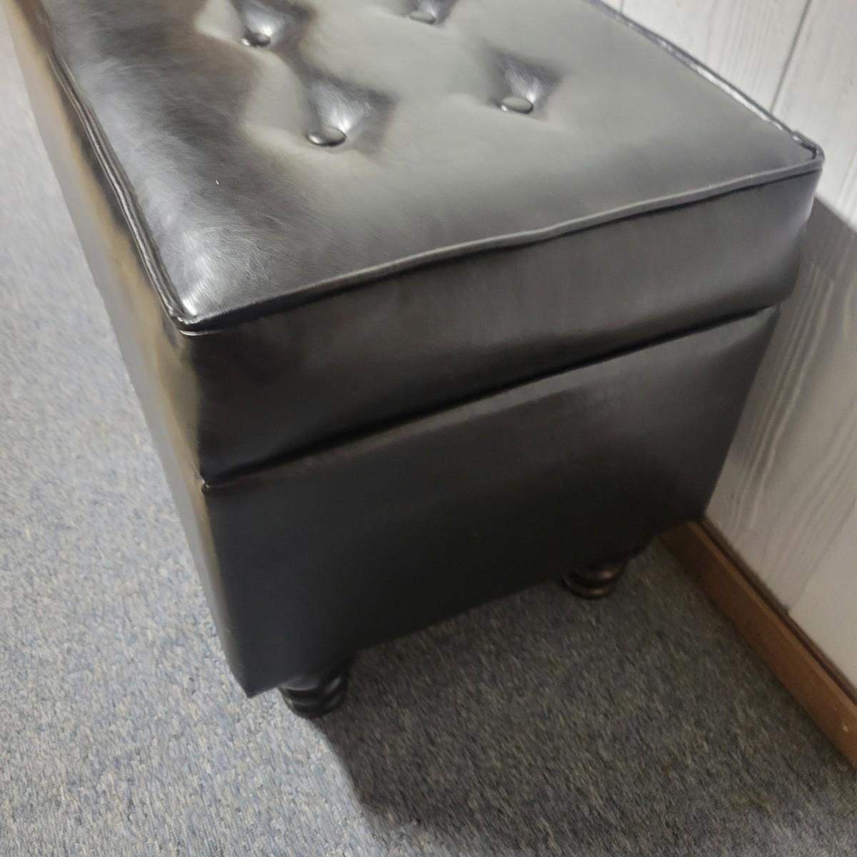 A black faux leather chest/bench that is in good condition. There are no notable tears or blemishes on the fabric, but one internal hinge has come undone, but should be an easy fix. Chest has wooden legs and measures approximately 38" x 17" x 18.5" Local pickup only