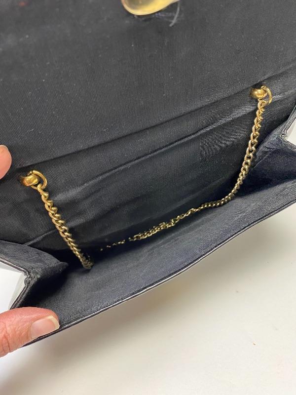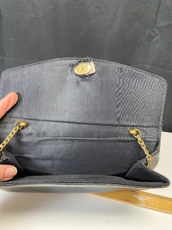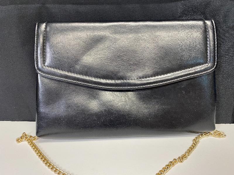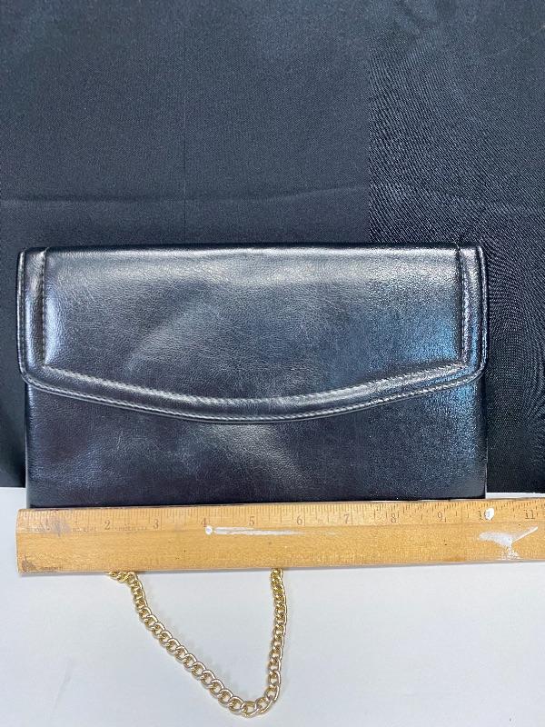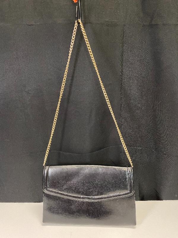 Unbranded faux leather clutch purse. Has a gold tone chain shoulder strap that can be placed inside to make it a handheld clutch. Magnetic snap closure, flap side needs to be fixed.