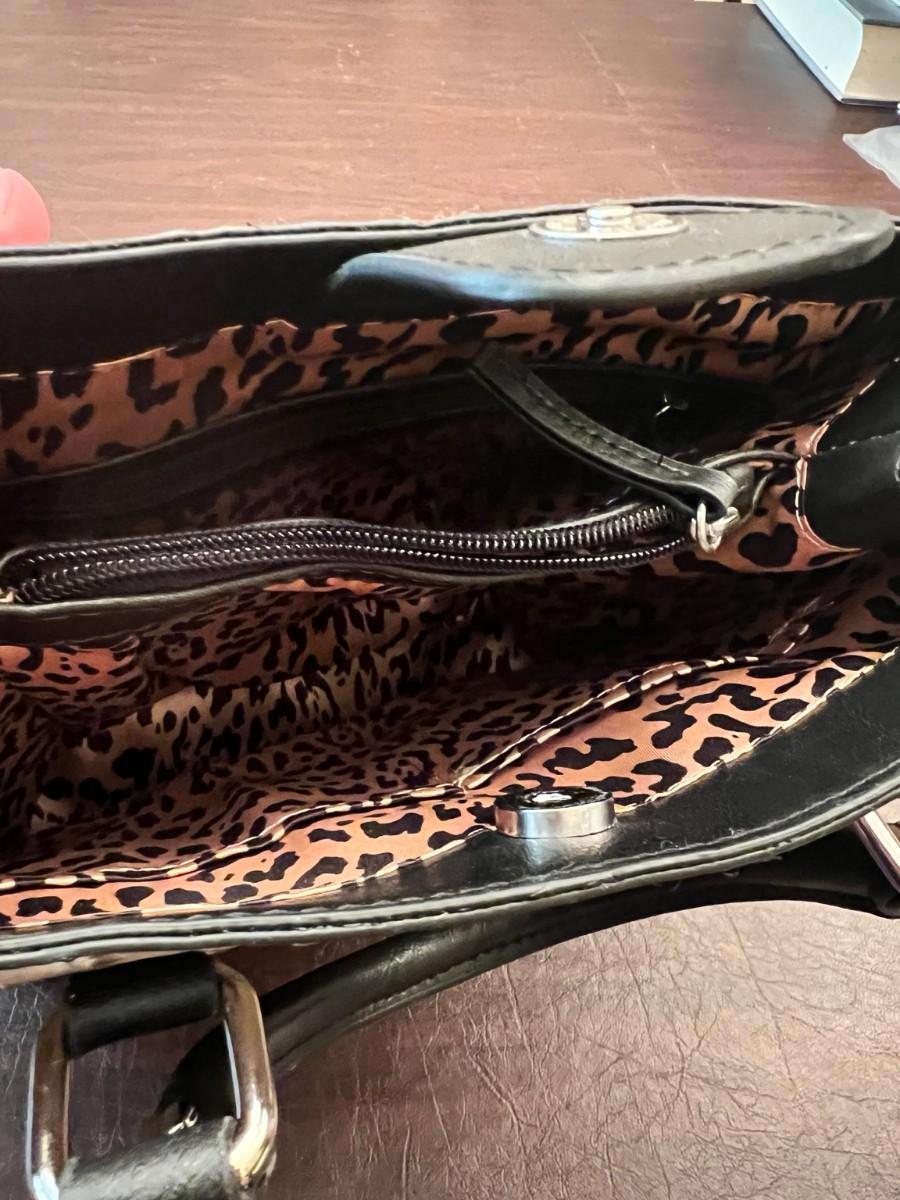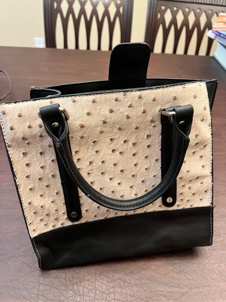 Black & Faux Ostrich Leather Handbag With Leopard Lining – Magnetic Closure