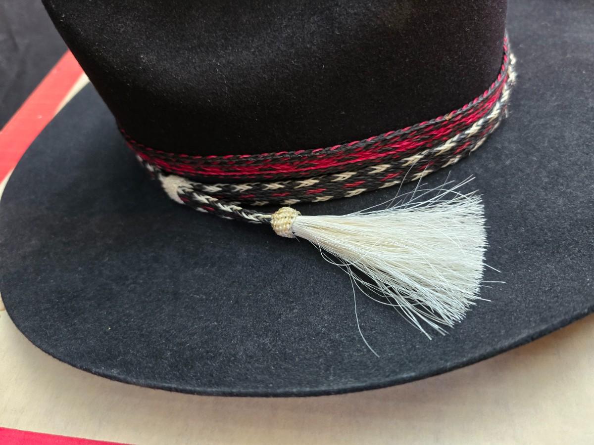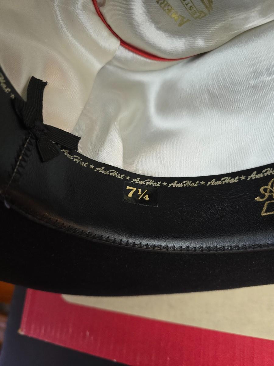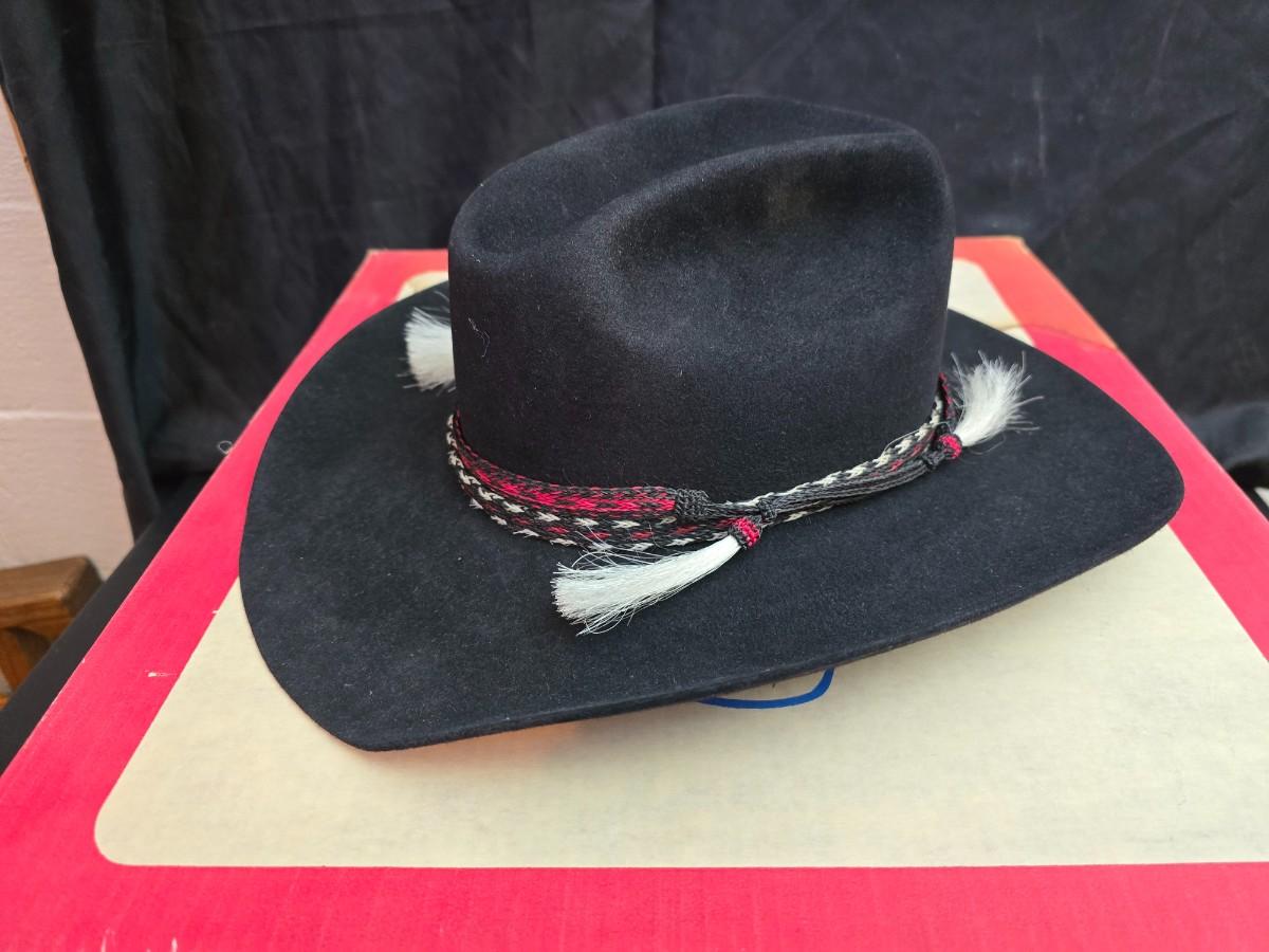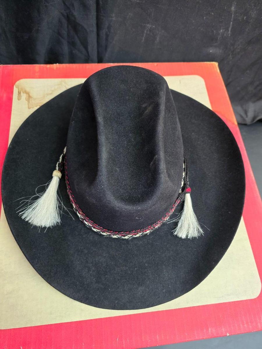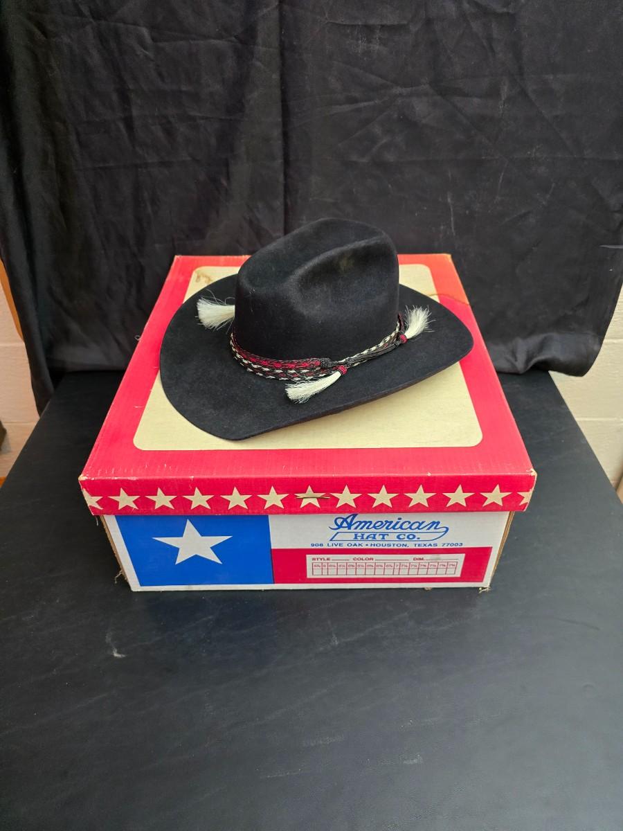 Black felt American Hat Company cowboy hat with a braided hatband with white tassels, with its original box. Size 7 1/4 comes with a hat saver