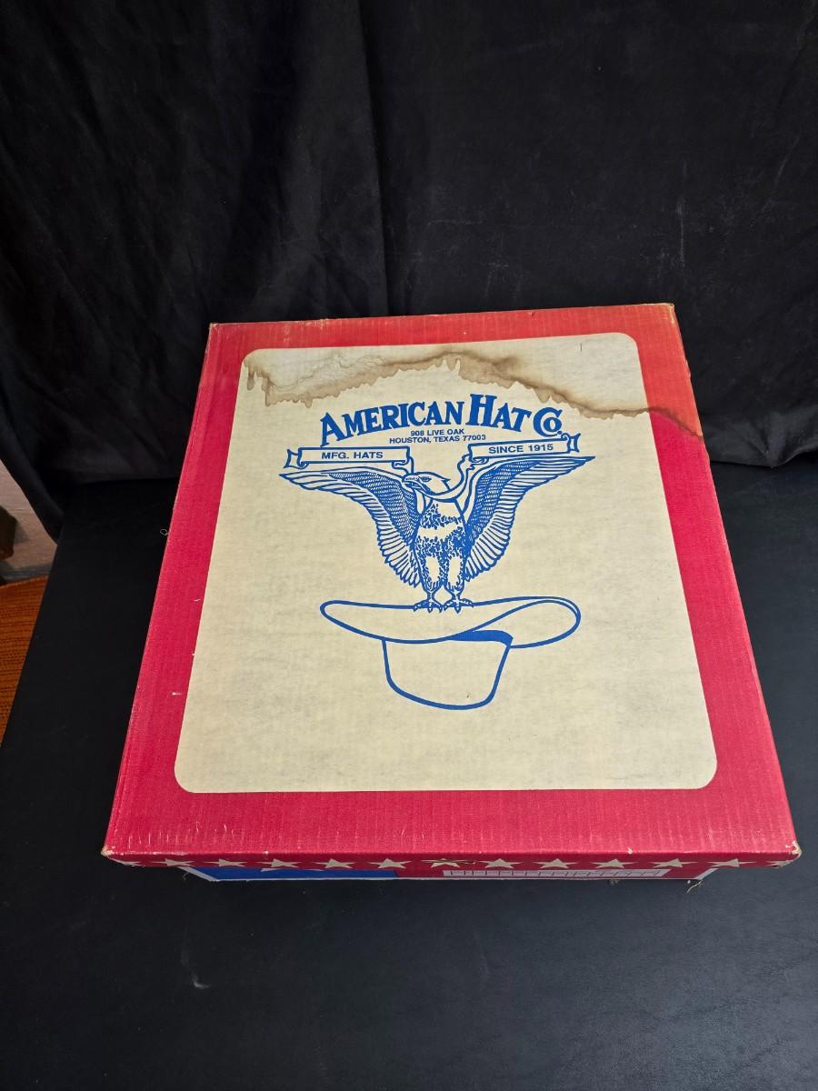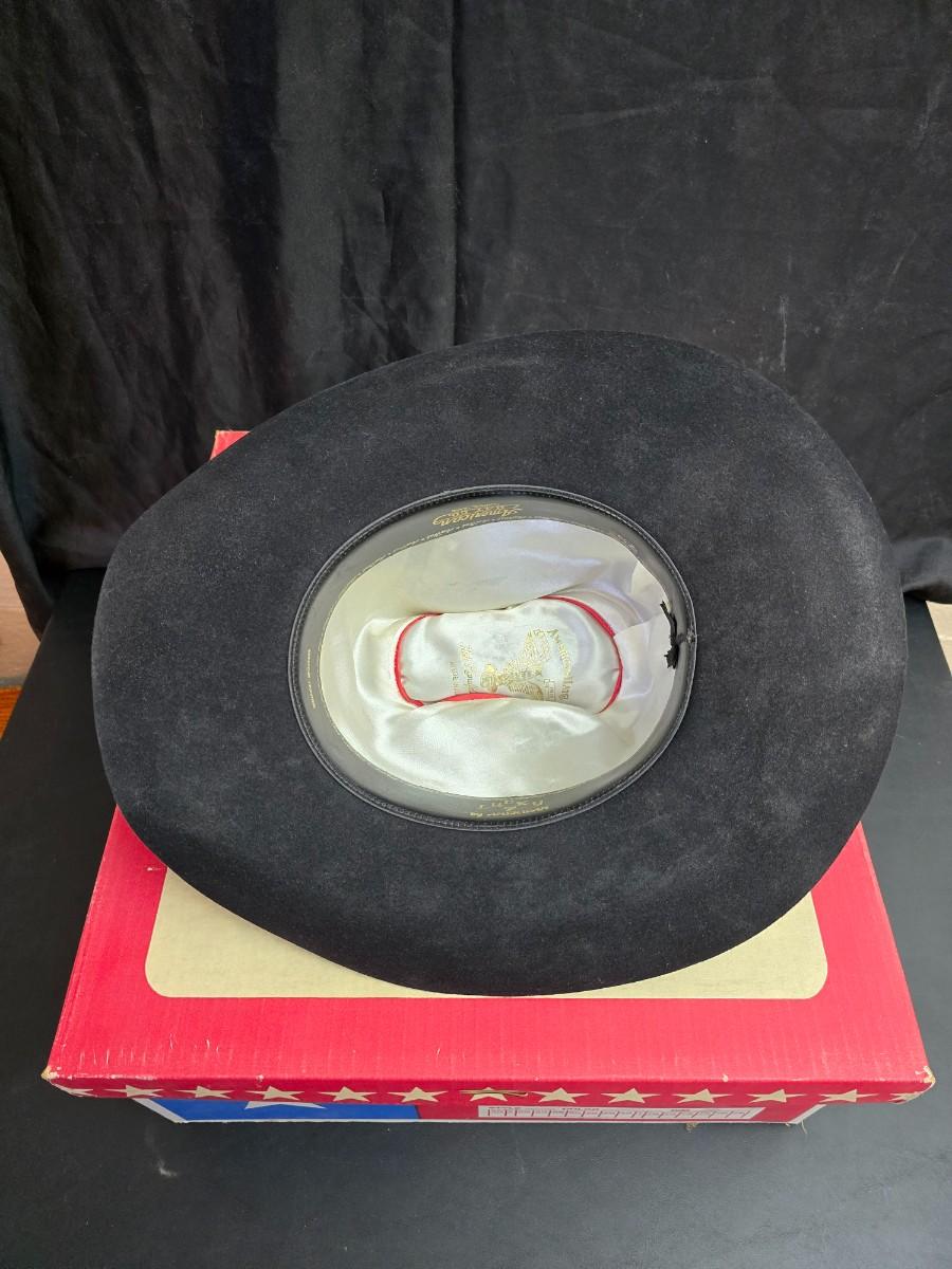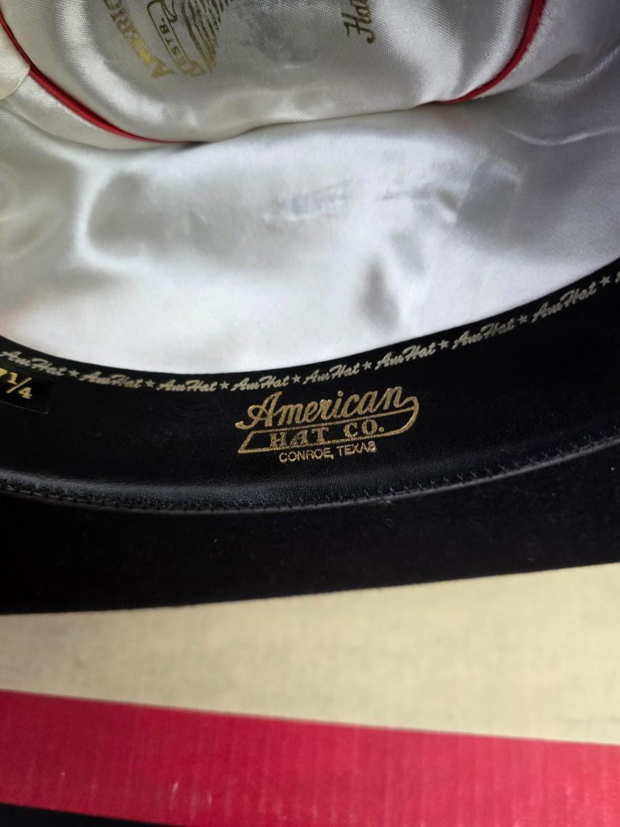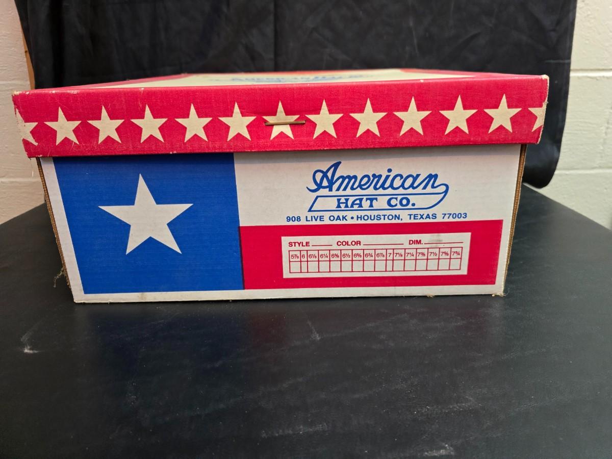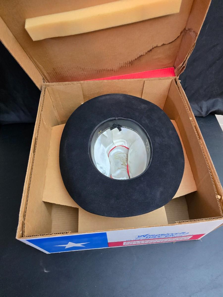 Black felt American Hat Company cowboy hat with a braided hatband with white tassels, with its original box. Size 7 1/4 comes with a hat saver