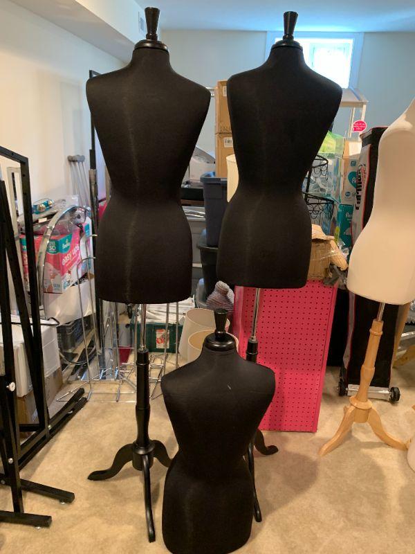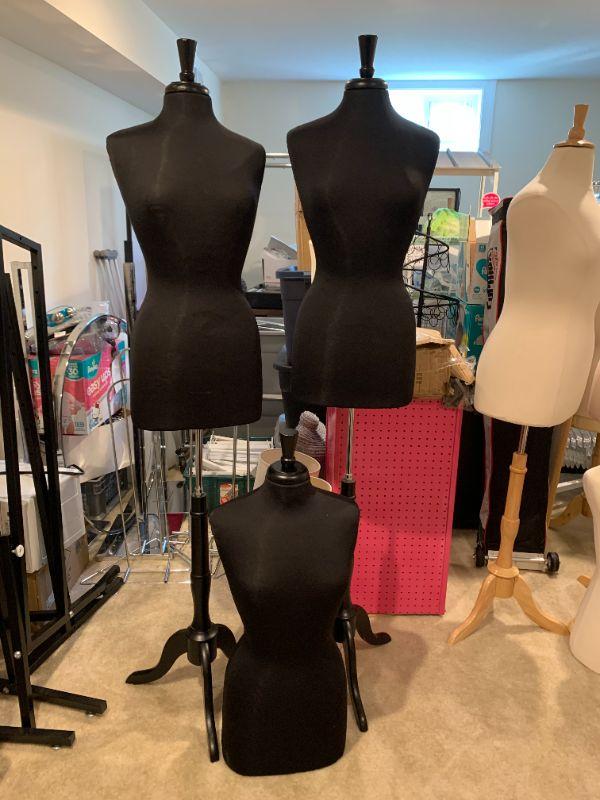 Three black female dress forms, two include an adjustable base. Price is PER EACH. Dress form without base is $15.