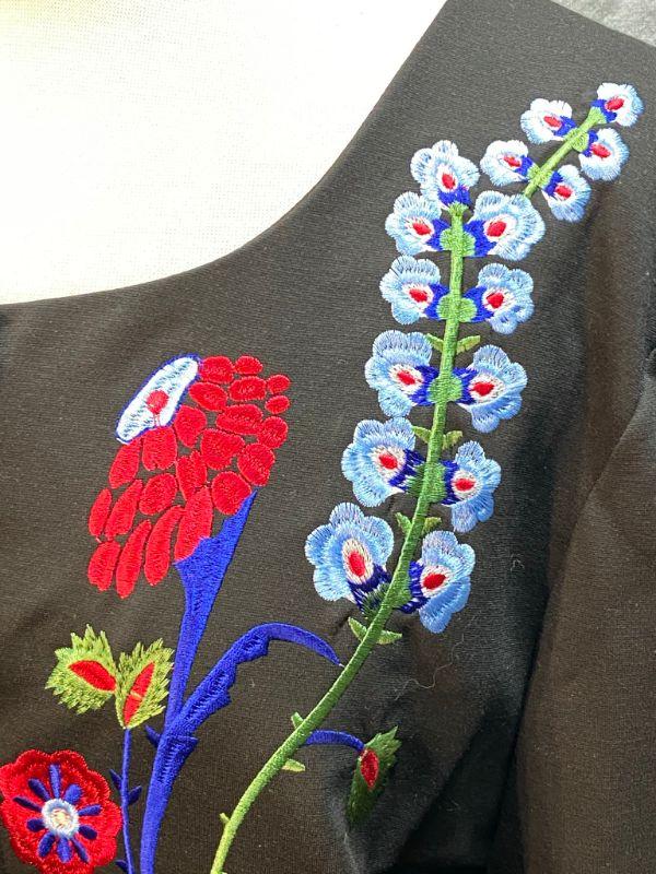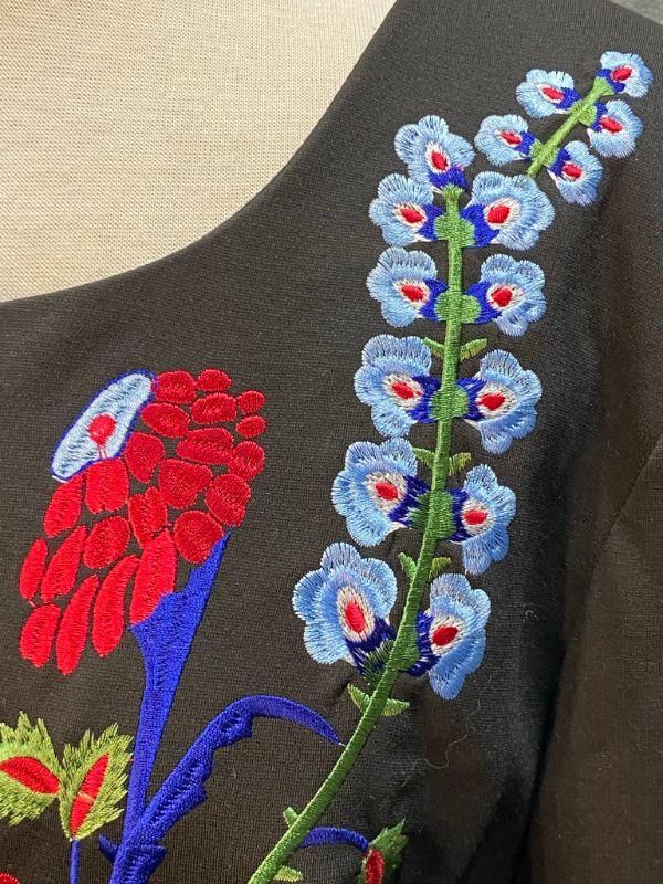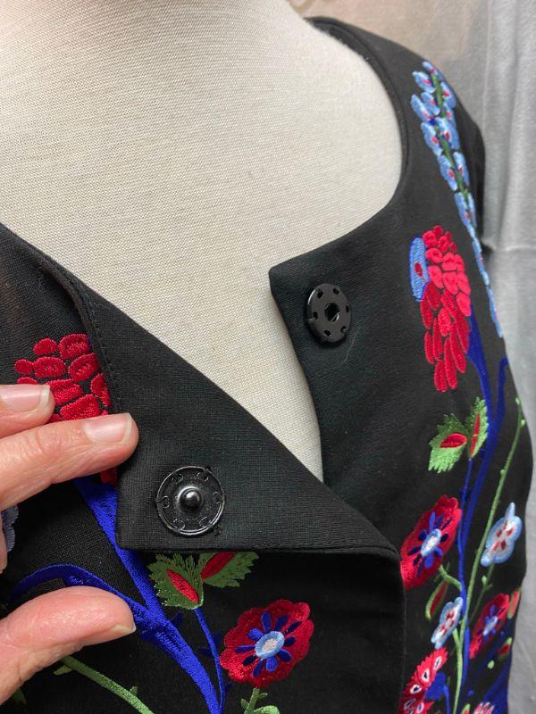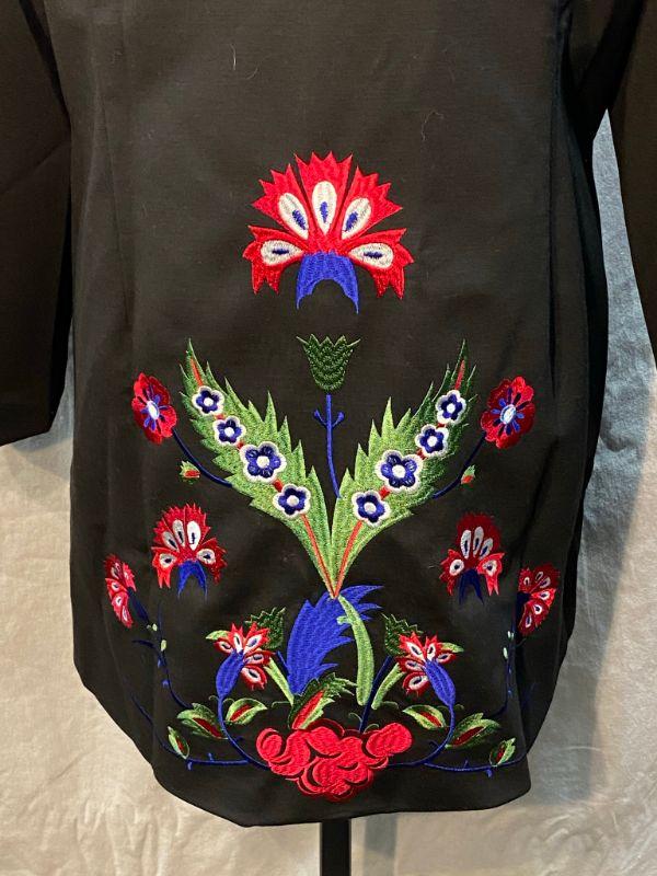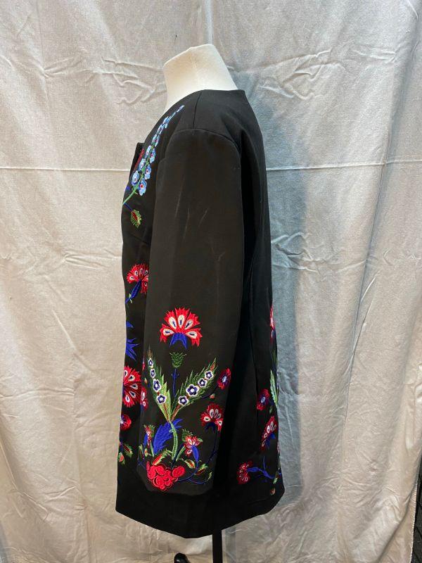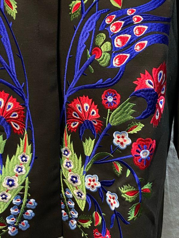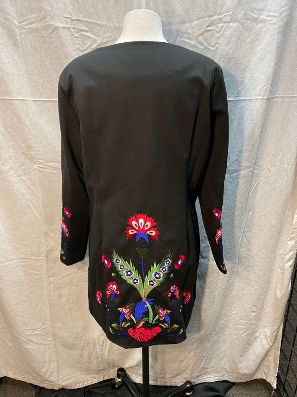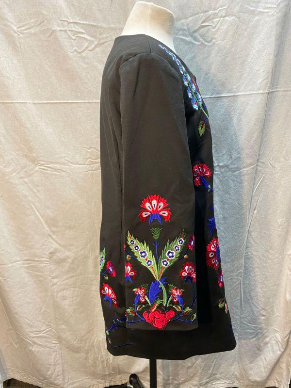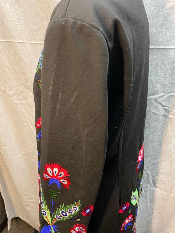 Black formal coat. Beautifully embroidered floral design. Snap closure. This is an imported jacket. The tag says that it is a XXXL, but it is not, maybe closer to a medium. Good condition.
