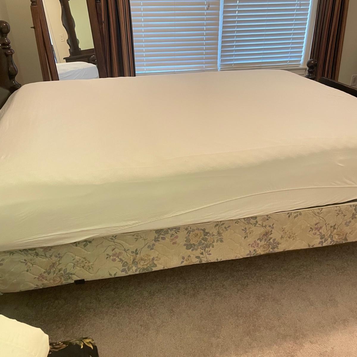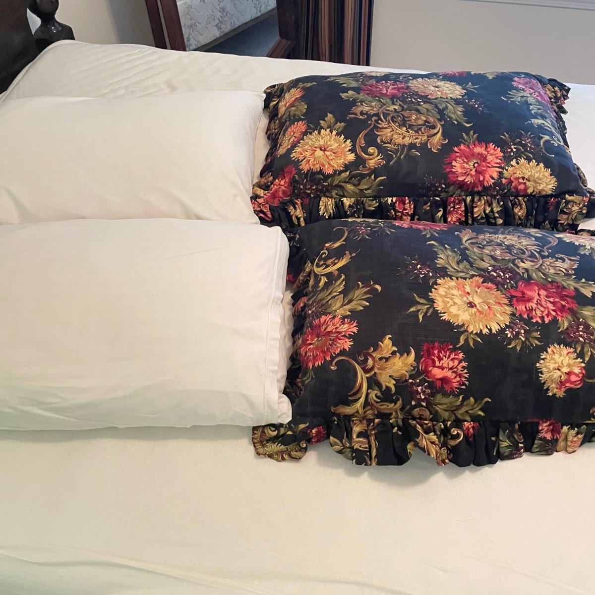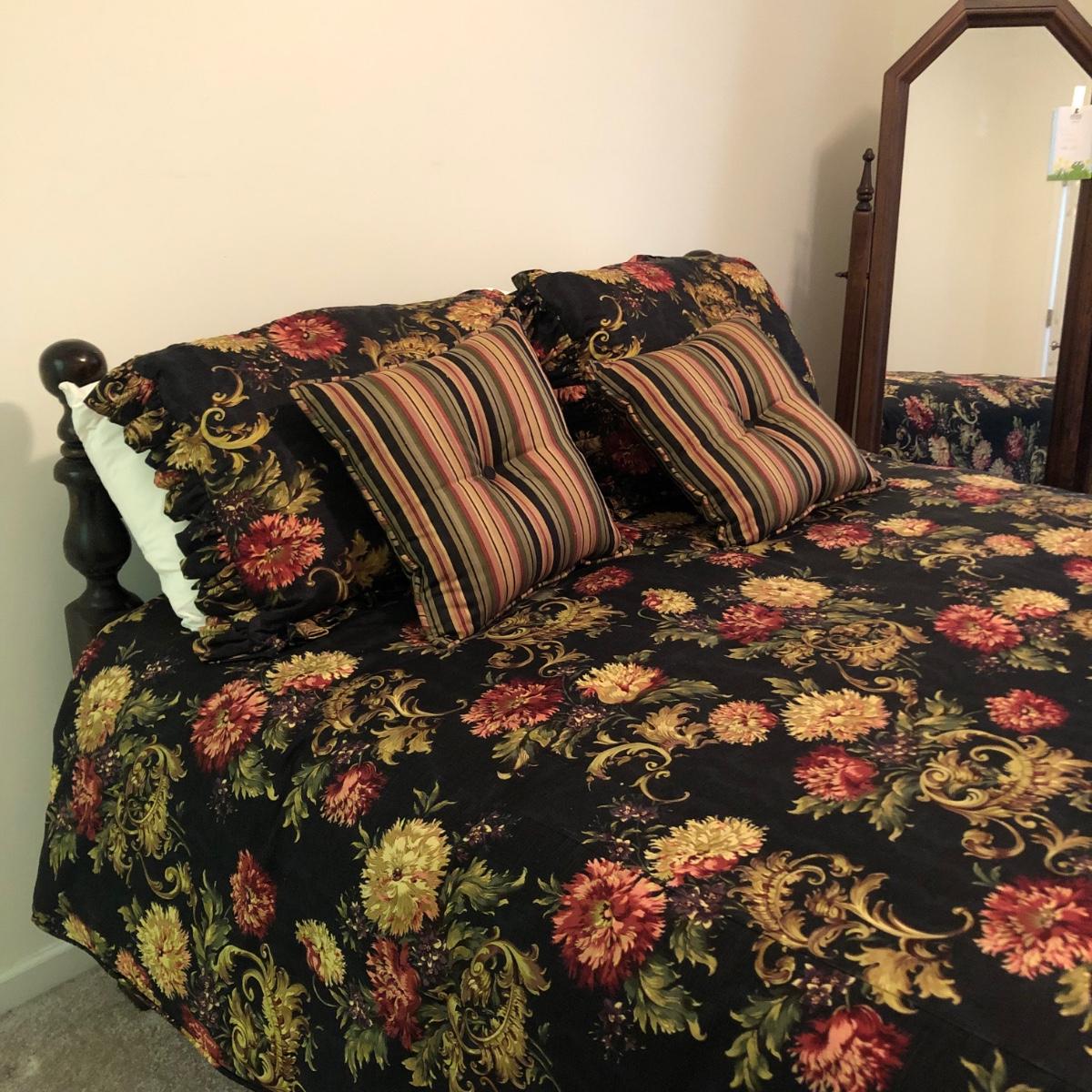 This queen size comforter is very elegant. This lot comes with the matching pillow cases, and the decorative striped pillows. The Winning bidder may take the 2 white pillows on the bed as well as the two pillows In the Black Floral Pillow Cases. Lot also includes white cotton top and fitted sheet set and acrylic blanket.