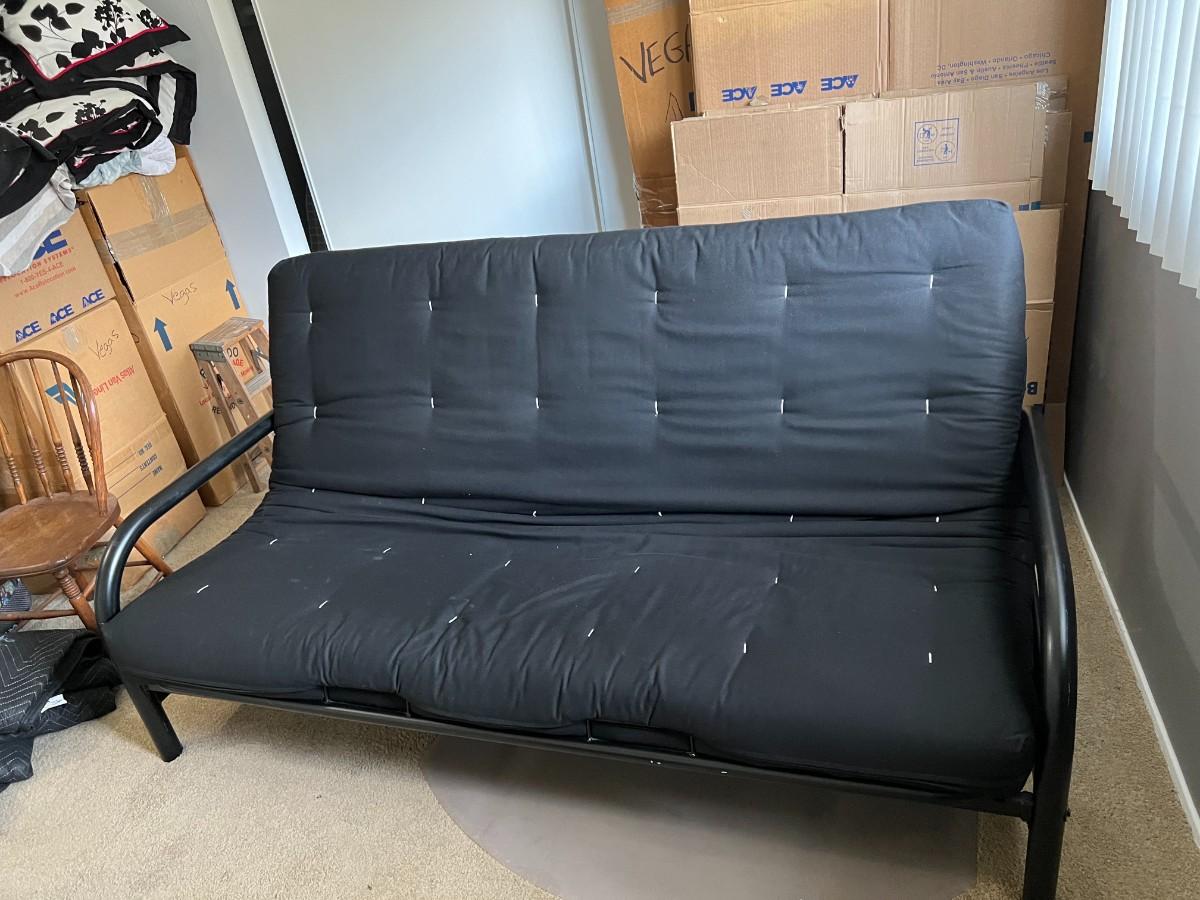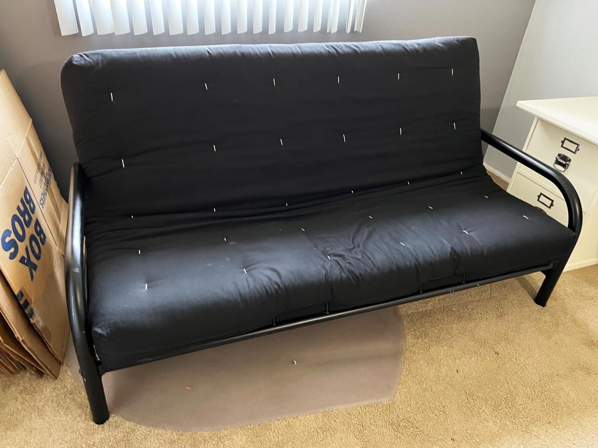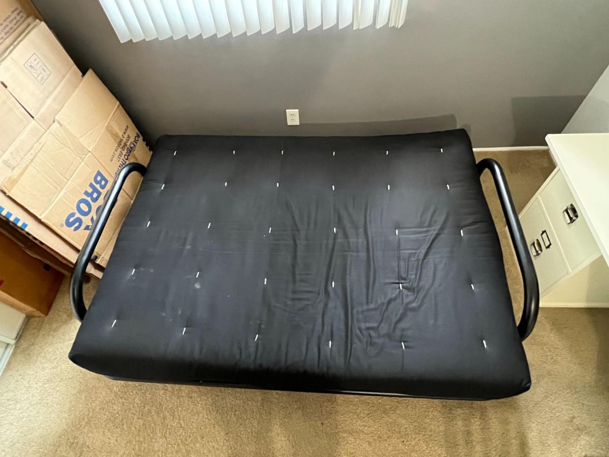 PICK UP ONLY ON THE 20th IN ANAHEIM. CROSS STREET MAGNOLIA AND WINSTON. Black Folding Metal Frame Futon, there is some wear to the futon mattress, but there is no significant stains or rips and is in good useable condition. Check pictures for more details and for sizing.