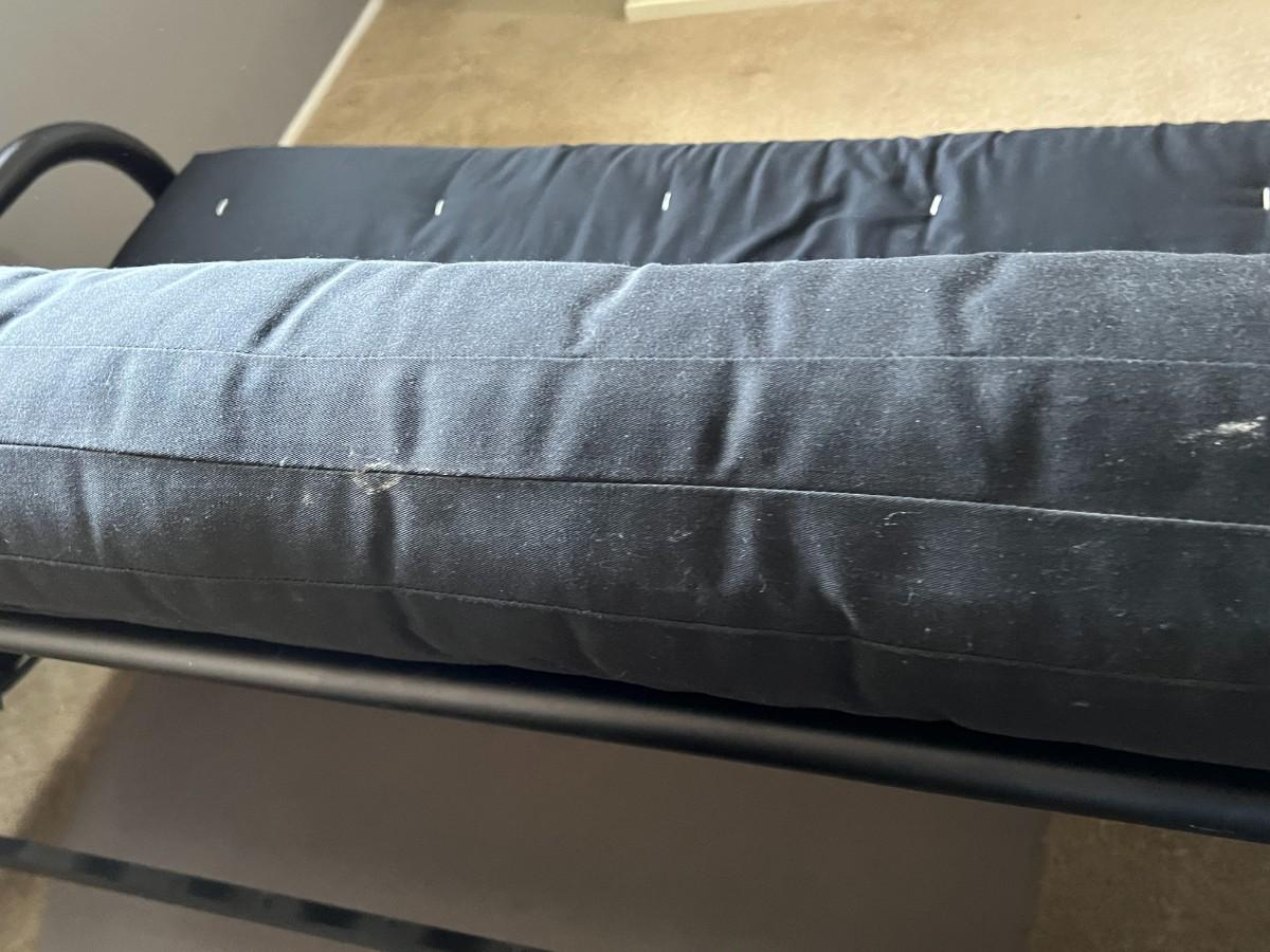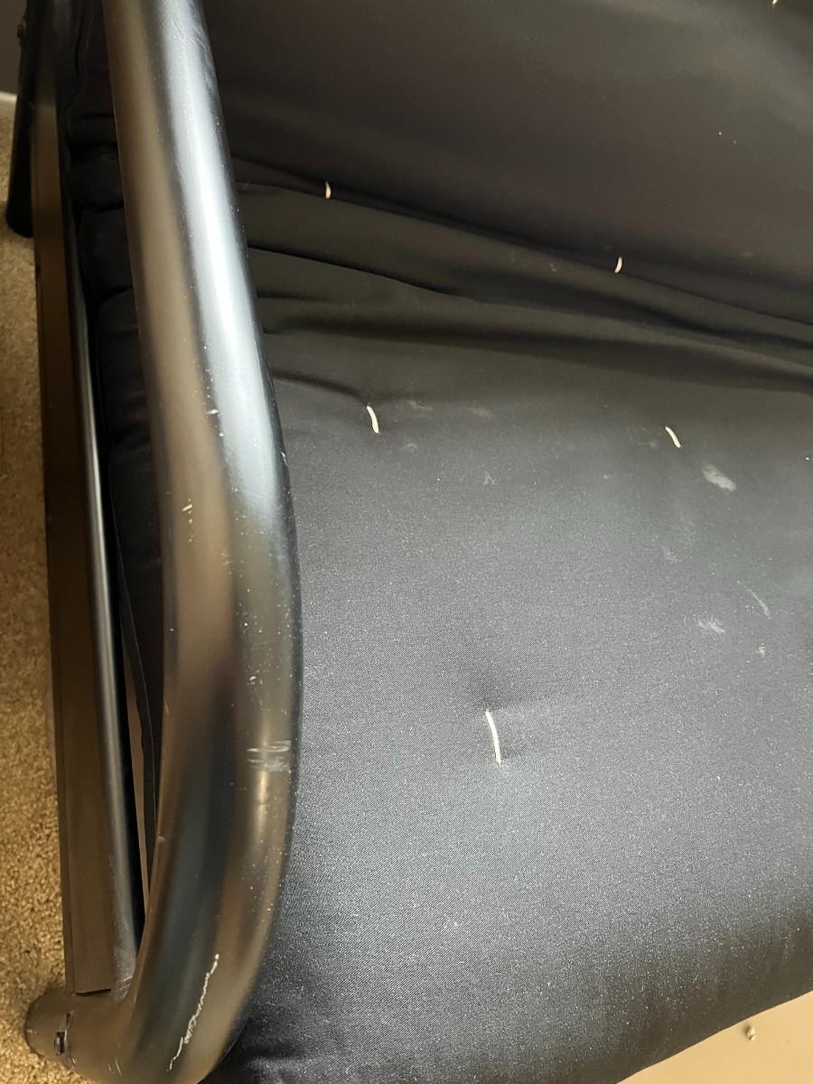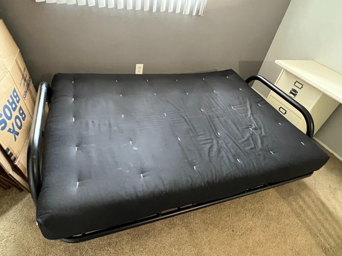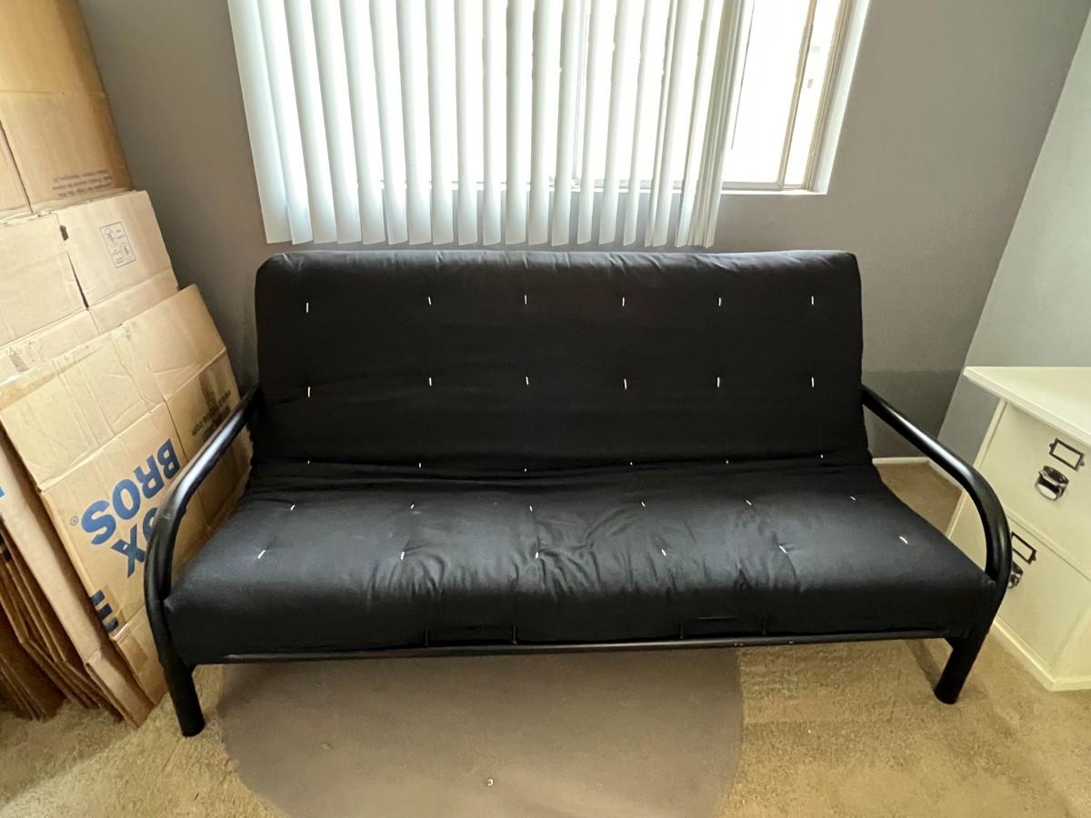 PICK UP ONLY ON THE 20th IN ANAHEIM. CROSS STREET MAGNOLIA AND WINSTON. Black Folding Metal Frame Futon, there is some wear to the futon mattress, but there is no significant stains or rips and is in good useable condition. Check pictures for more details and for sizing.