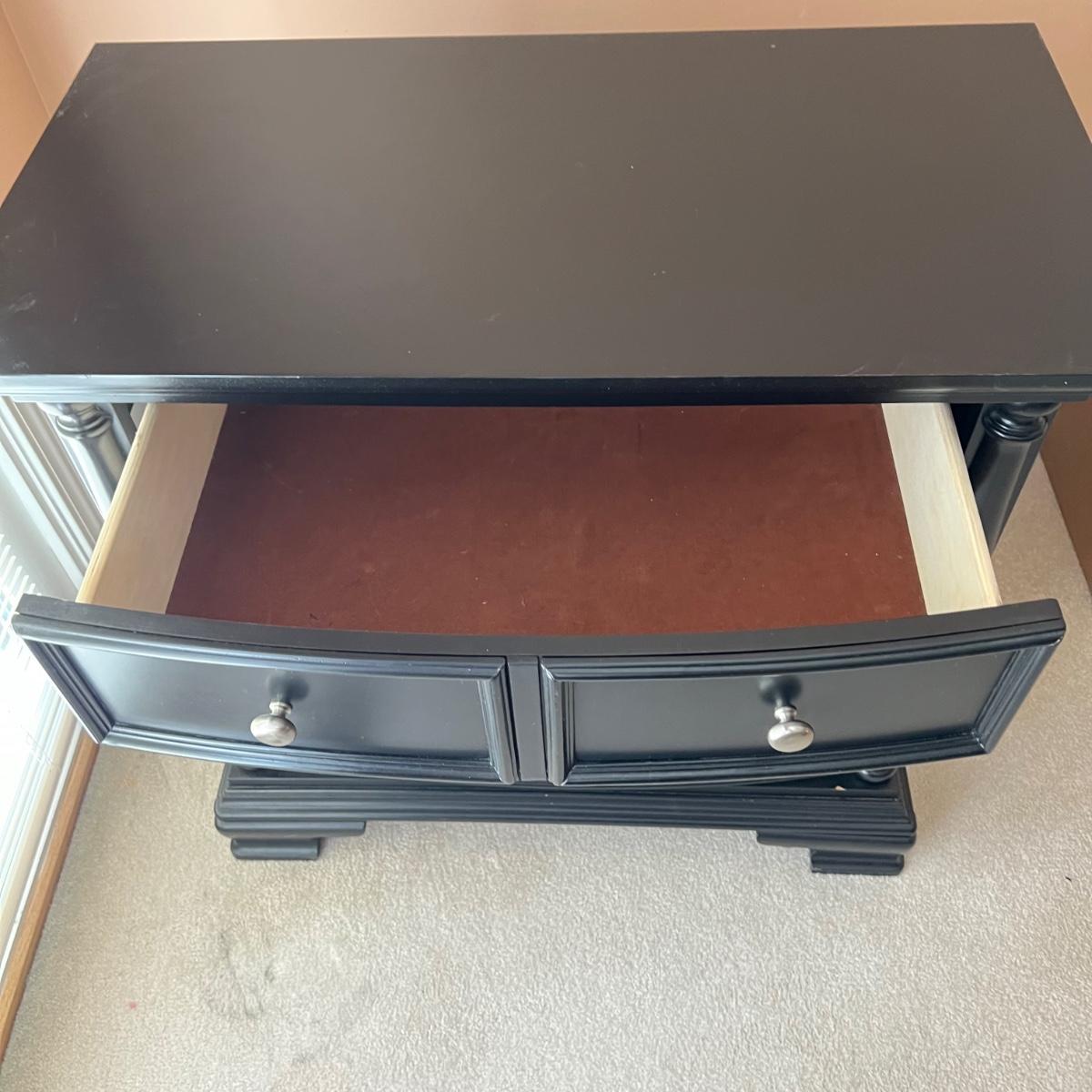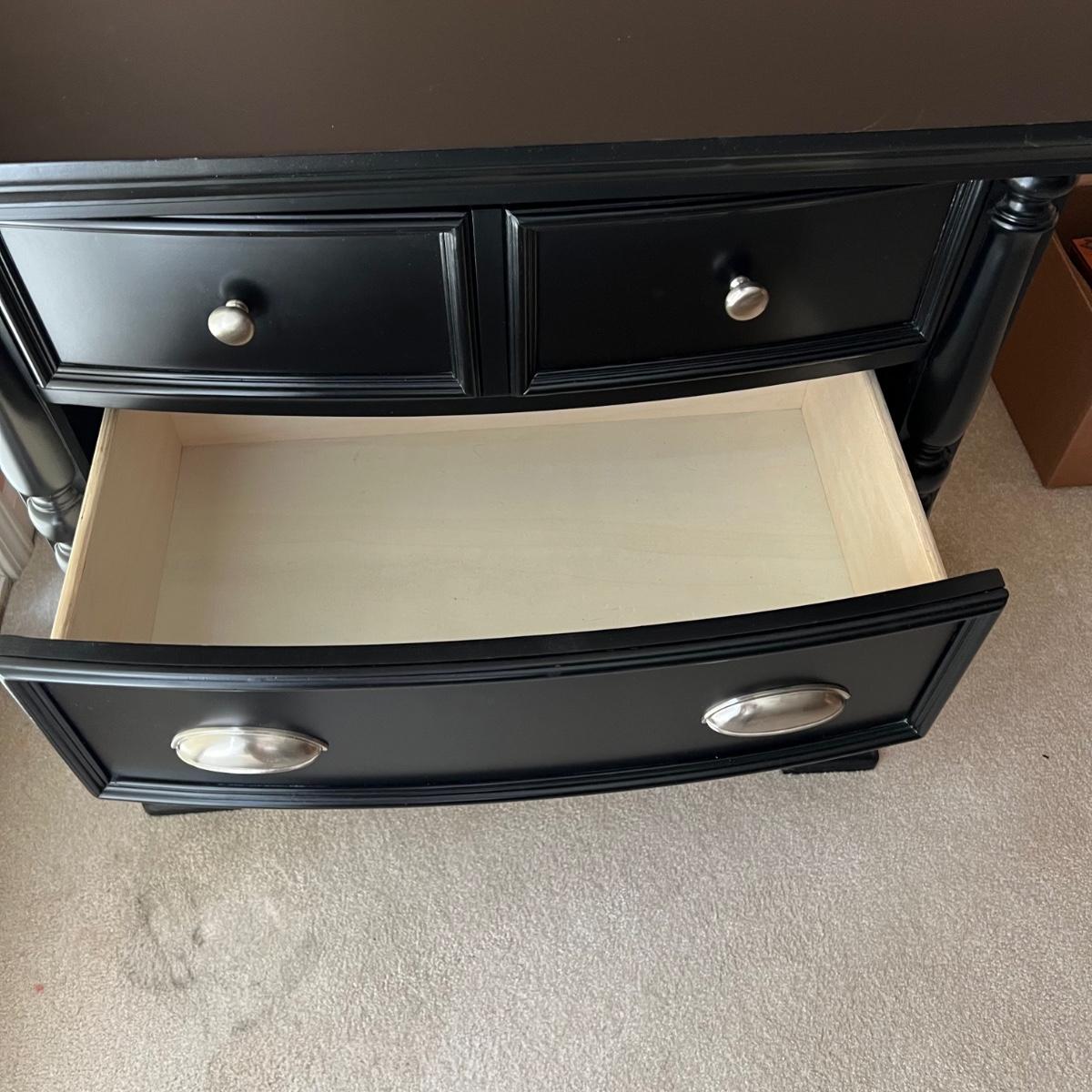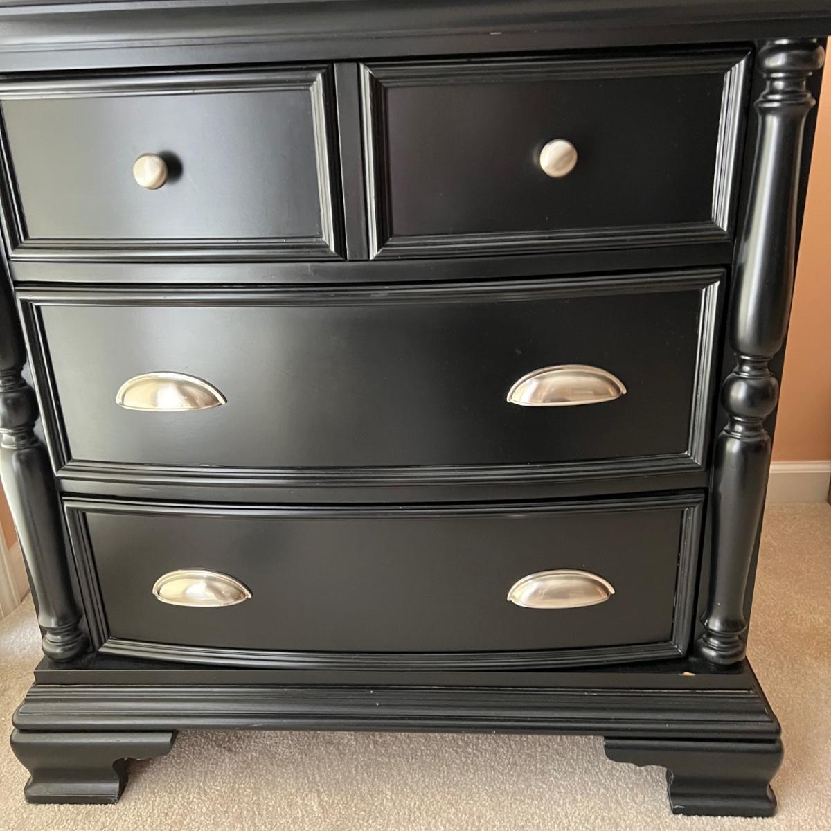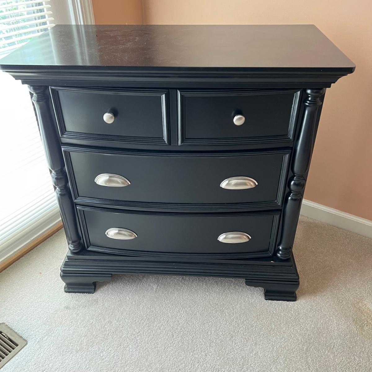 Black wooden four drawer dresser measures 33.5” x 18” x 33.5”H. The hardware is brushed sliver. Note that this dresser matches a larger dresser in this sale.