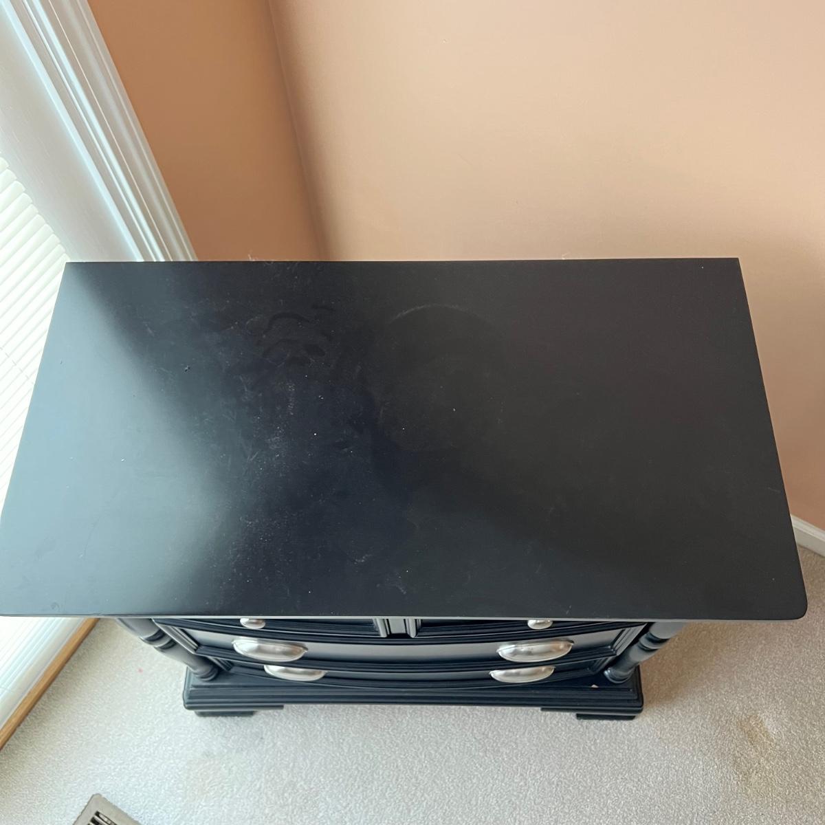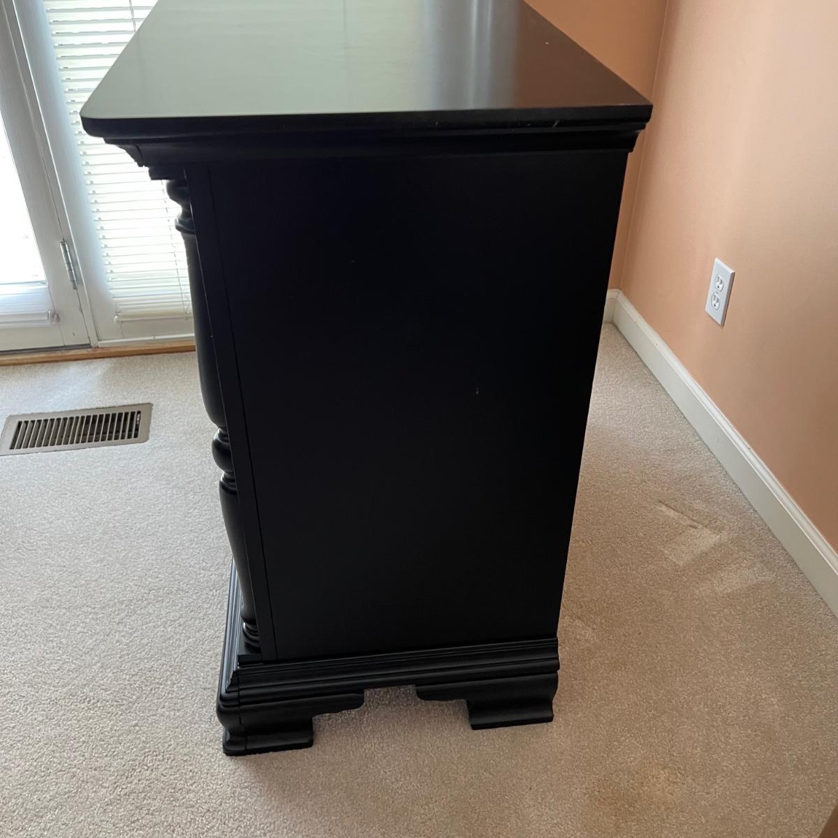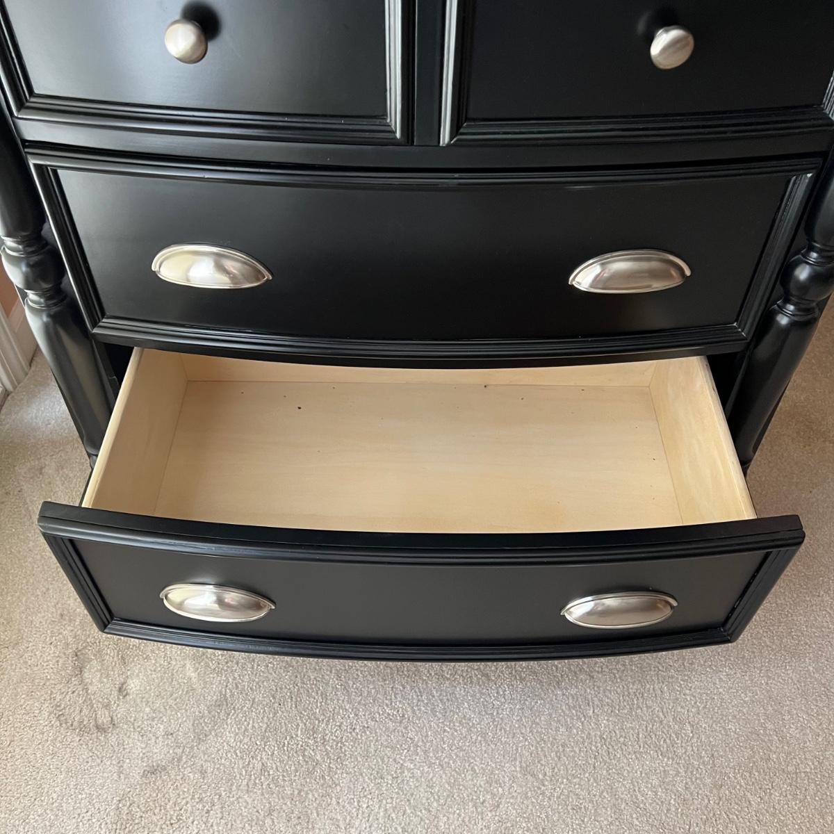 Black wooden four drawer dresser measures 33.5” x 18” x 33.5”H. The hardware is brushed sliver. Note that this dresser matches a larger dresser in this sale.