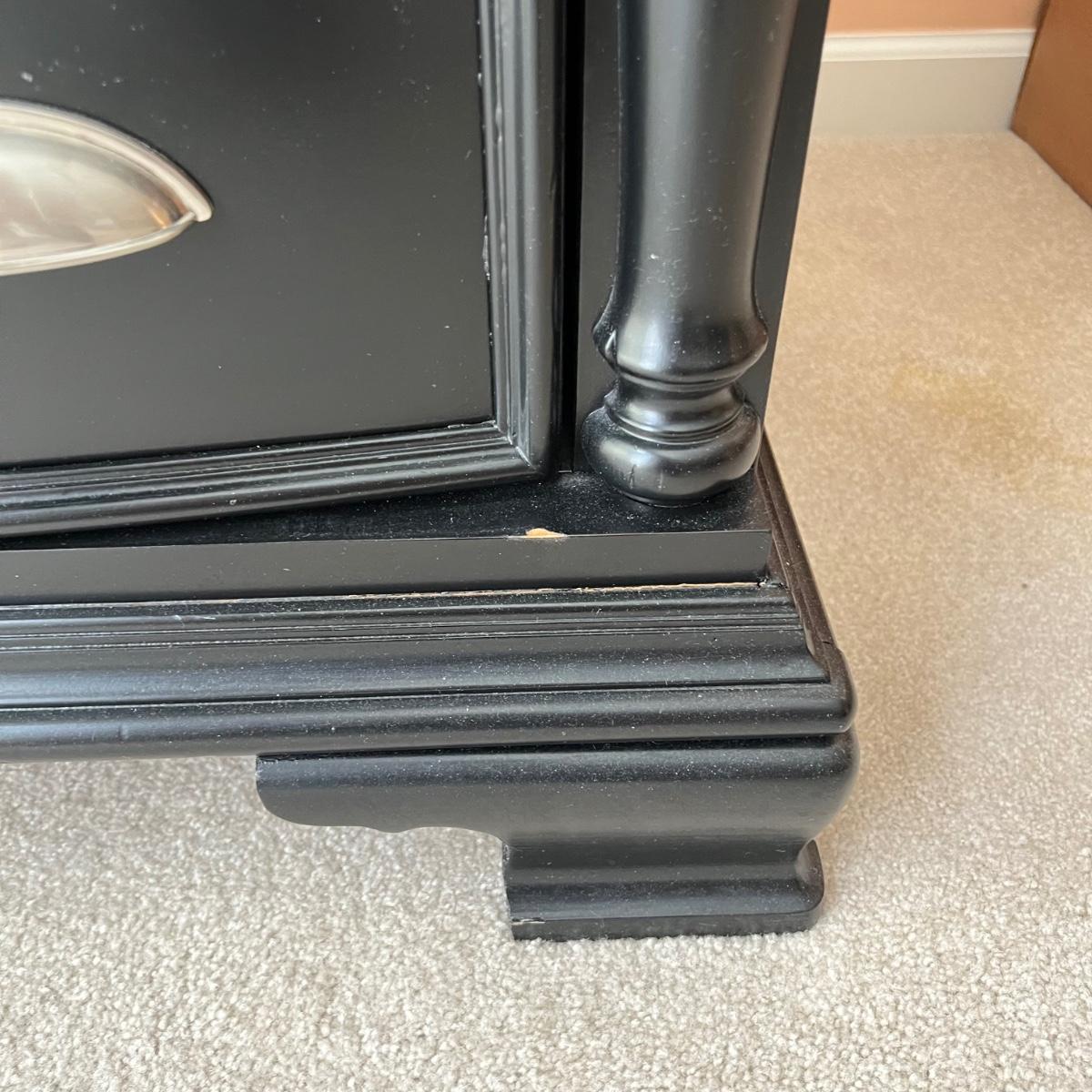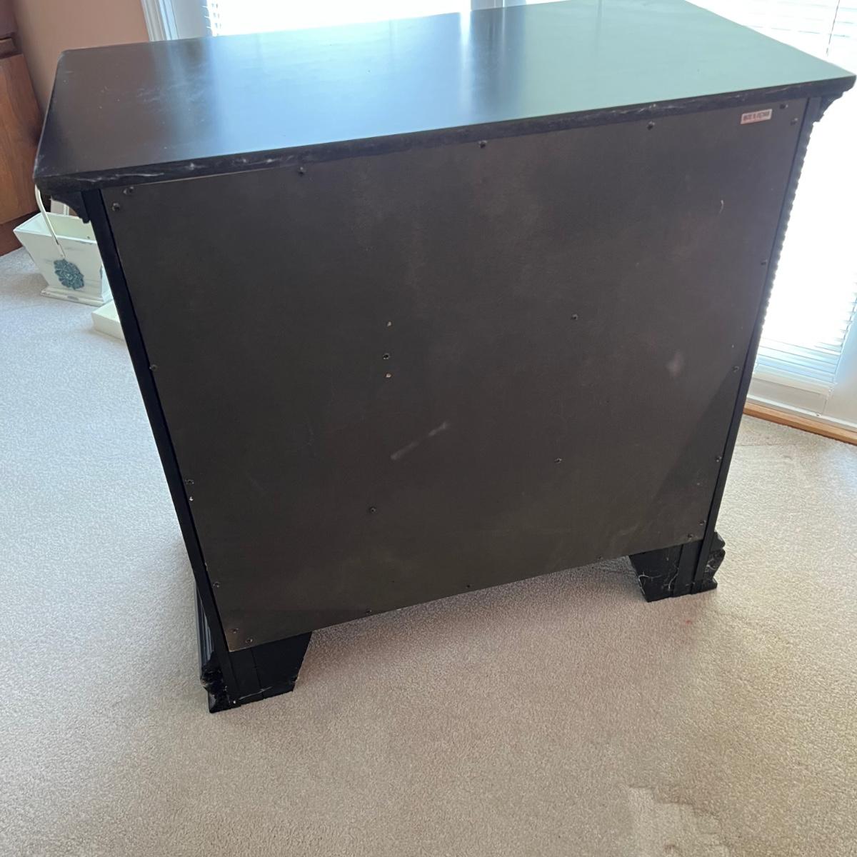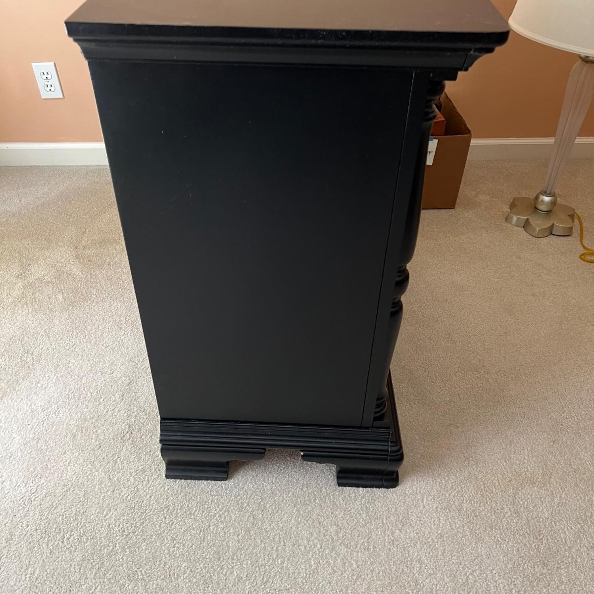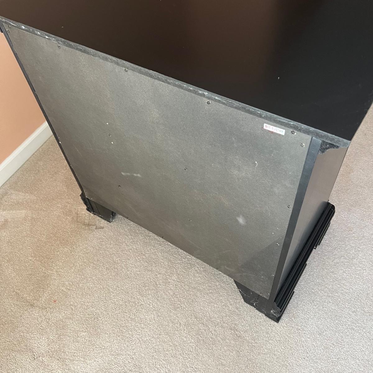 Black wooden four drawer dresser measures 33.5” x 18” x 33.5”H. The hardware is brushed sliver. Note that this dresser matches a larger dresser in this sale.