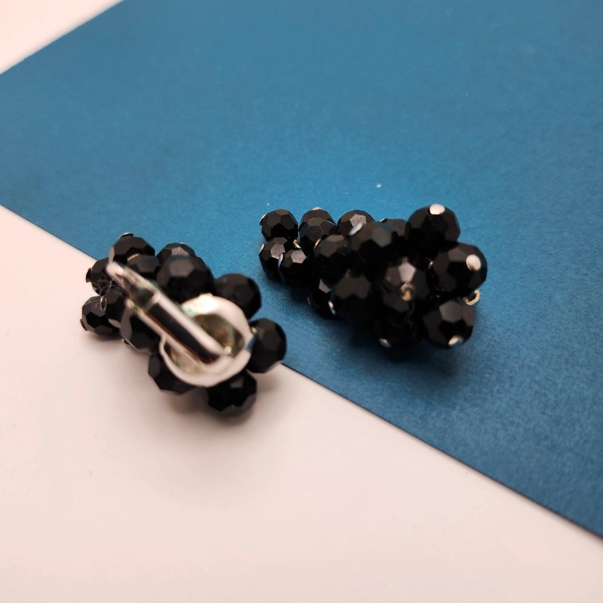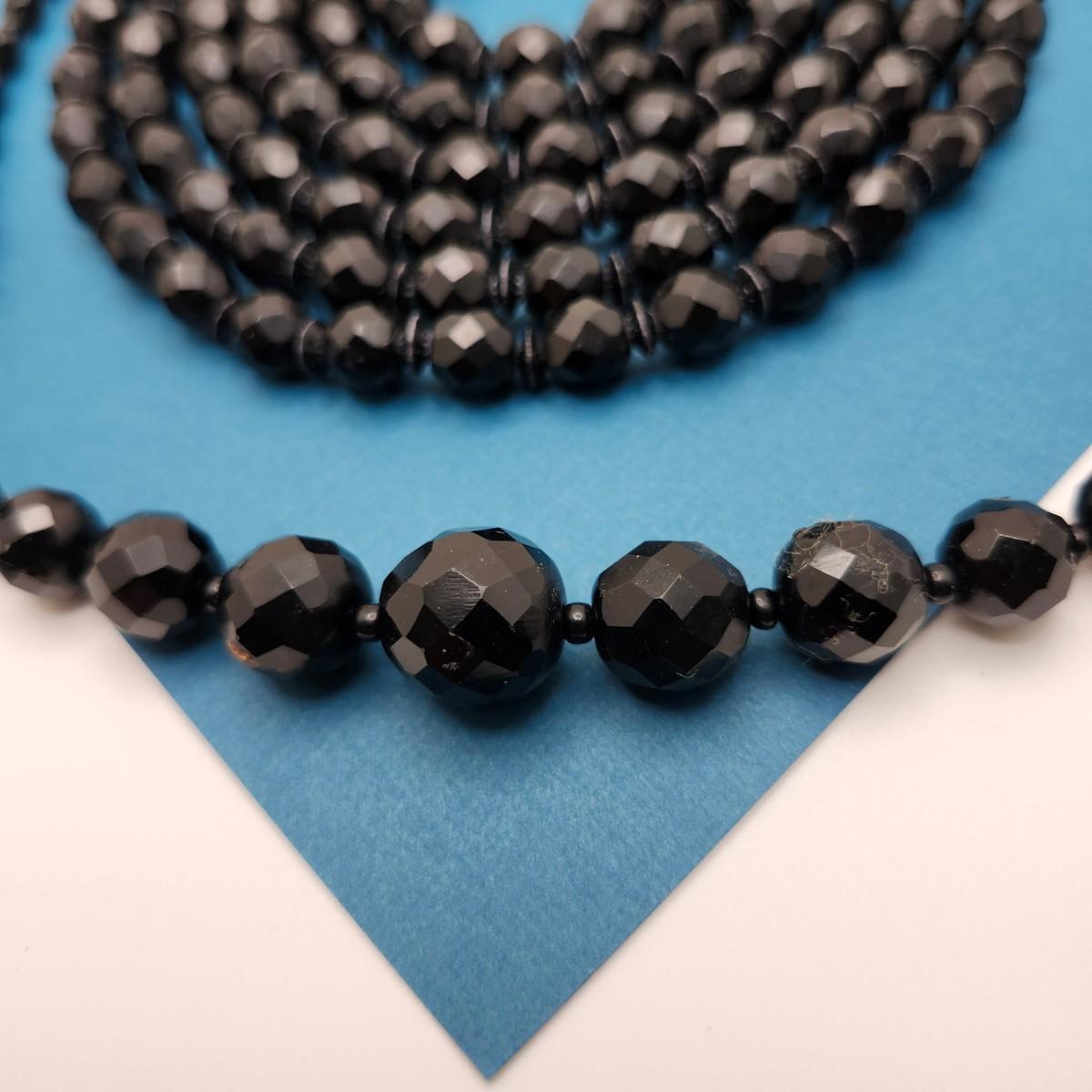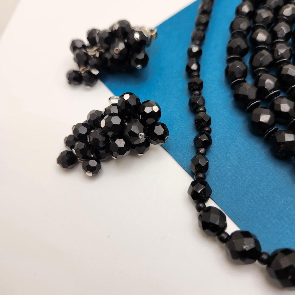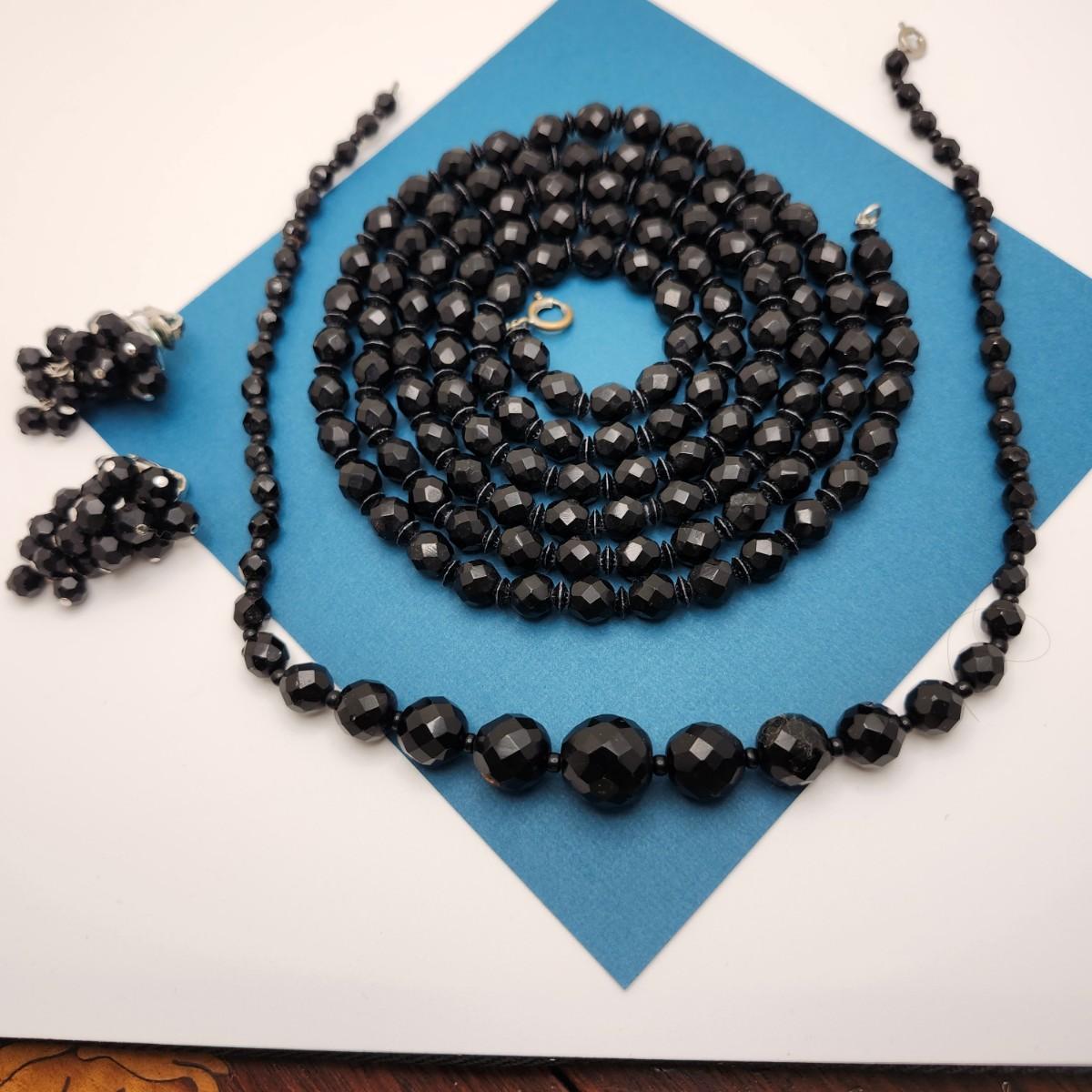 50 inch flapper length single strand necklace. 16 inch graduated choker. Clip earrings.