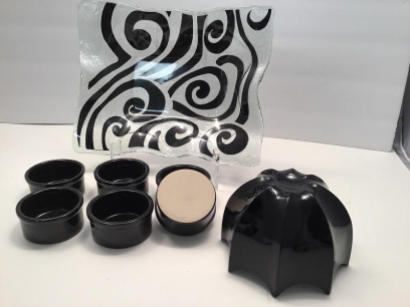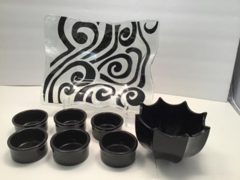 Vintage amethyst glass bowl. 6 black ramekins And black glass swirl tray