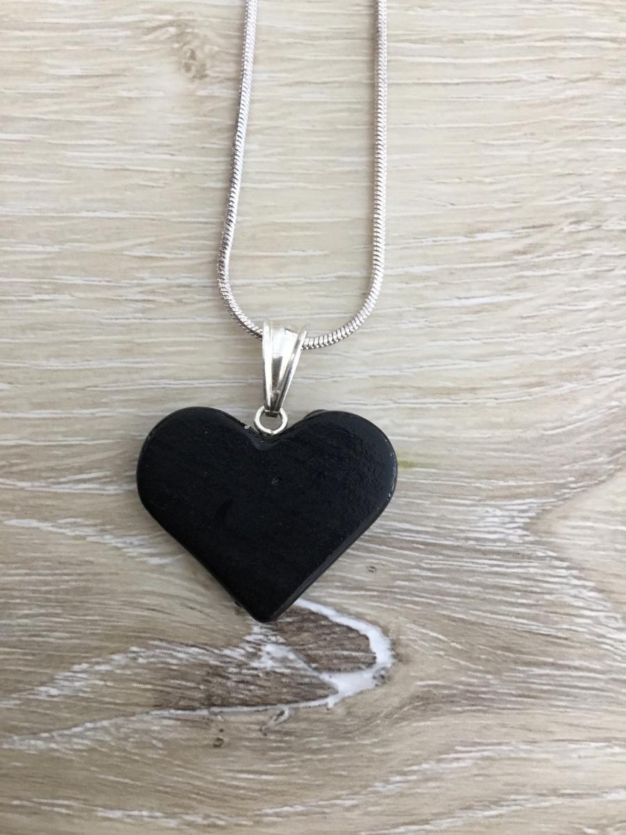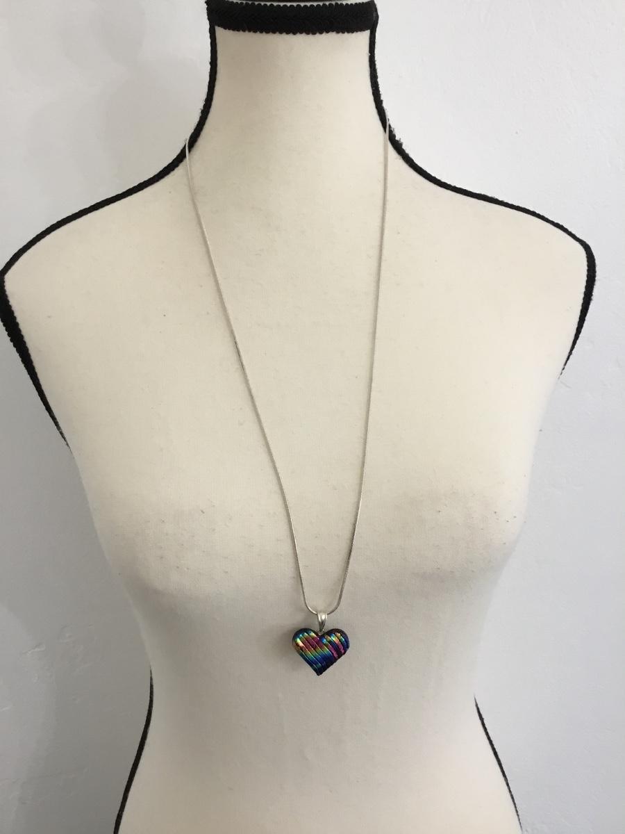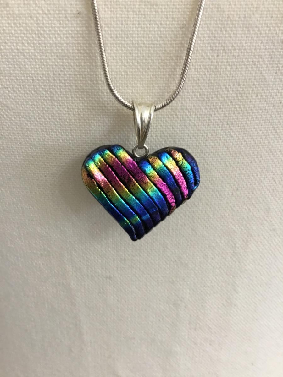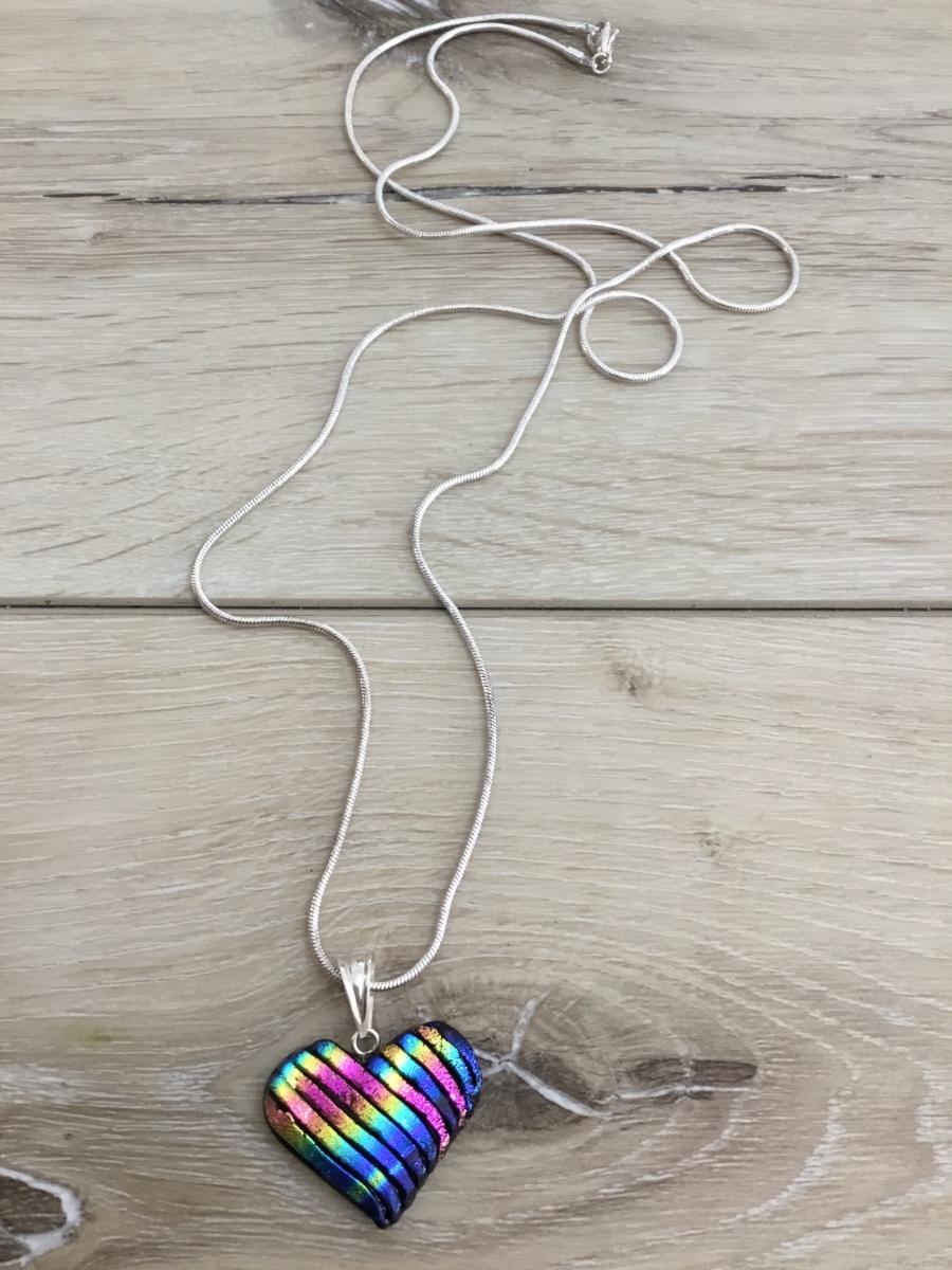 Black glass Multi colored heart pendant with silver tone chain necklace