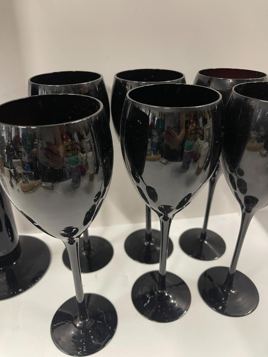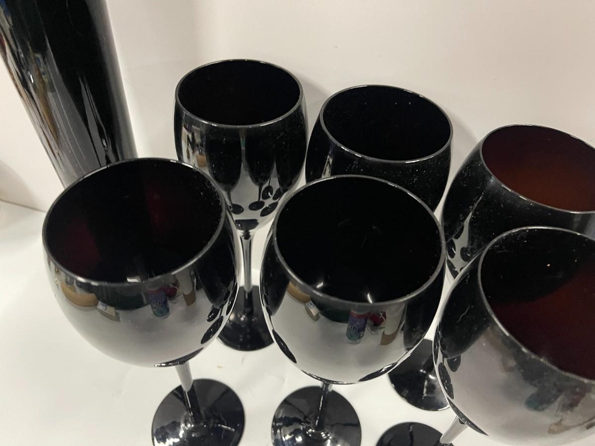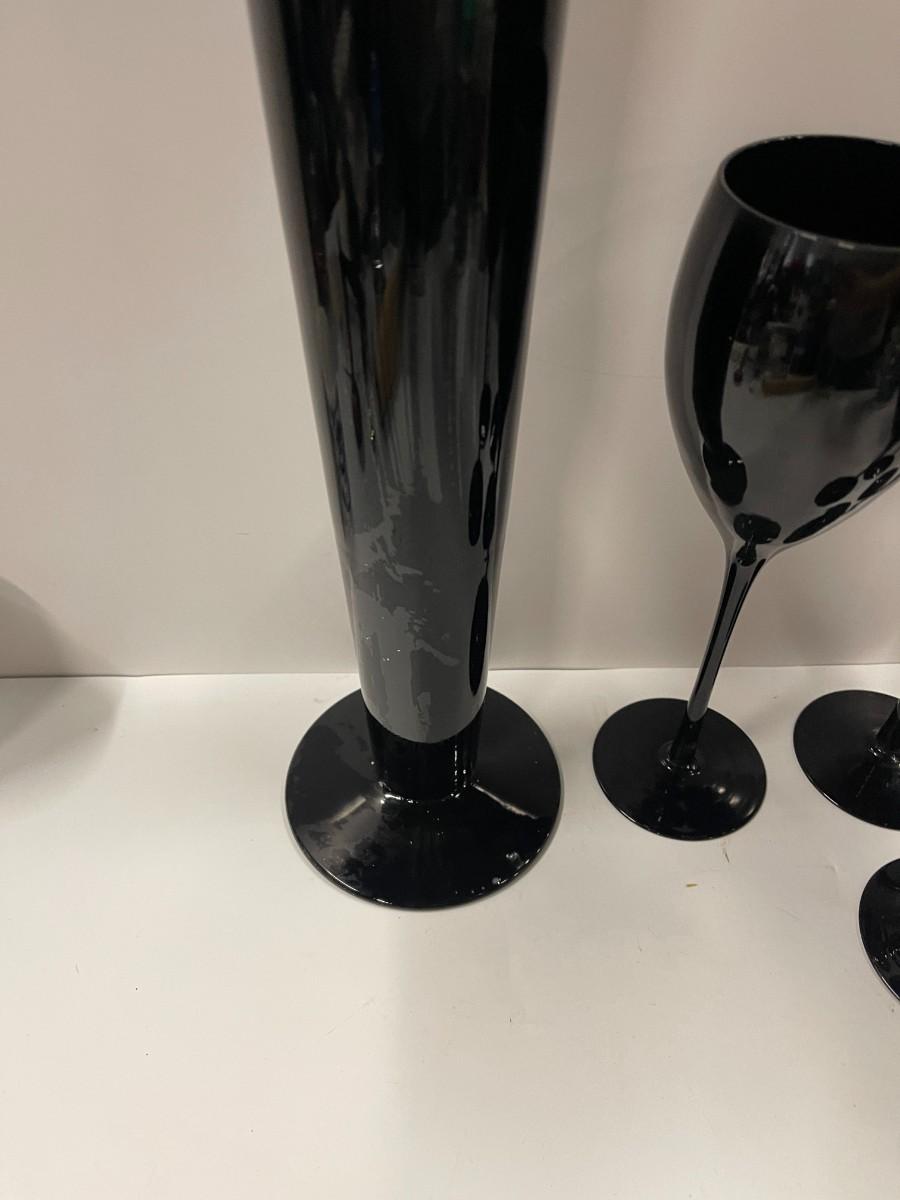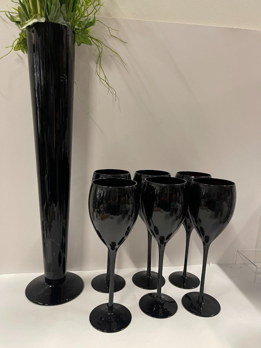6 black wine glasses, 10" tall and matching black trumpet vase, 20" tall. All in excellent condition.