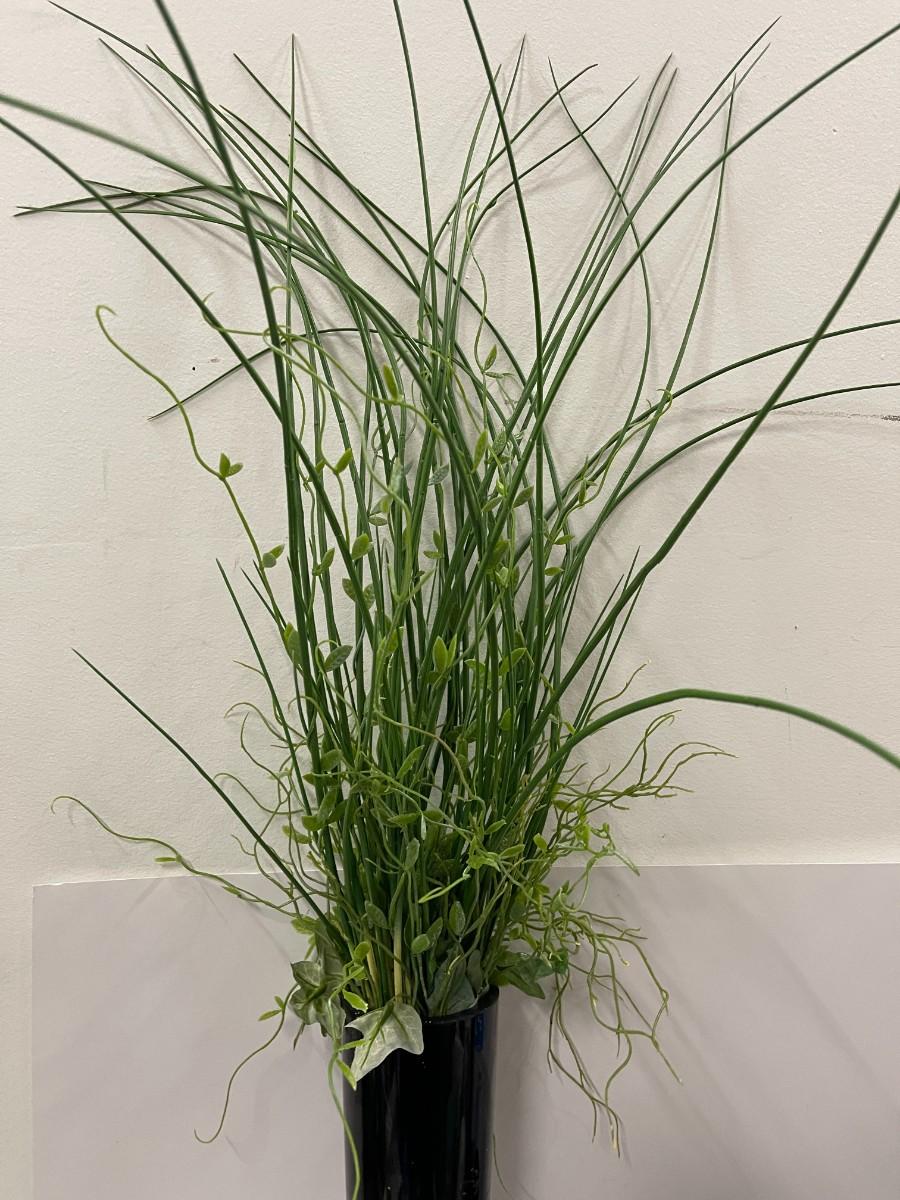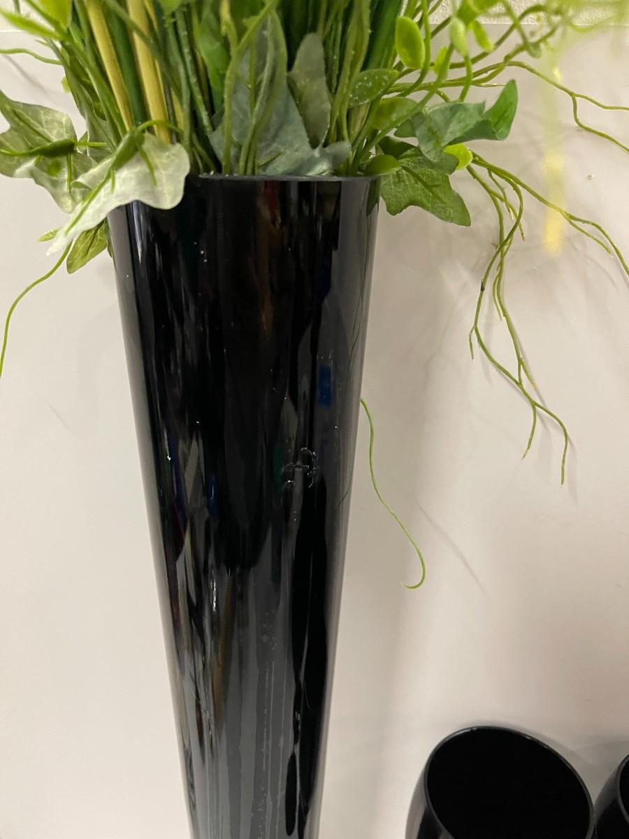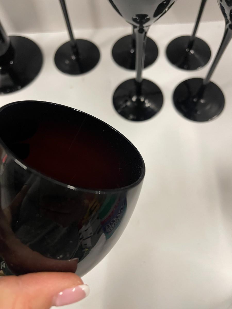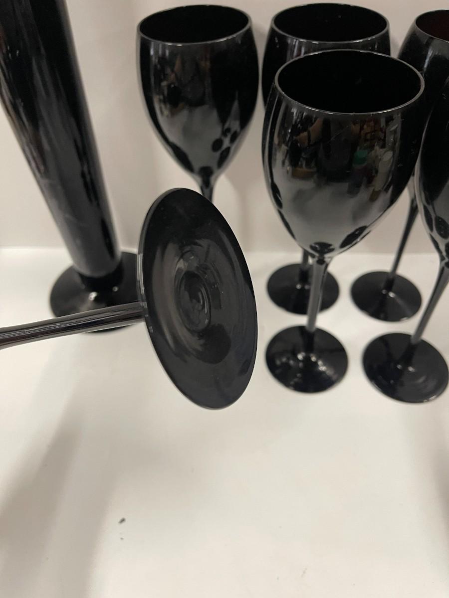 6 black wine glasses, 10" tall and matching black trumpet vase, 20" tall. All in excellent condition.