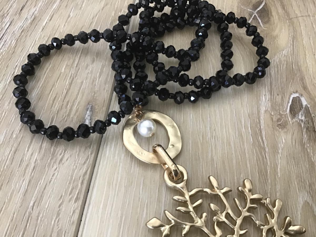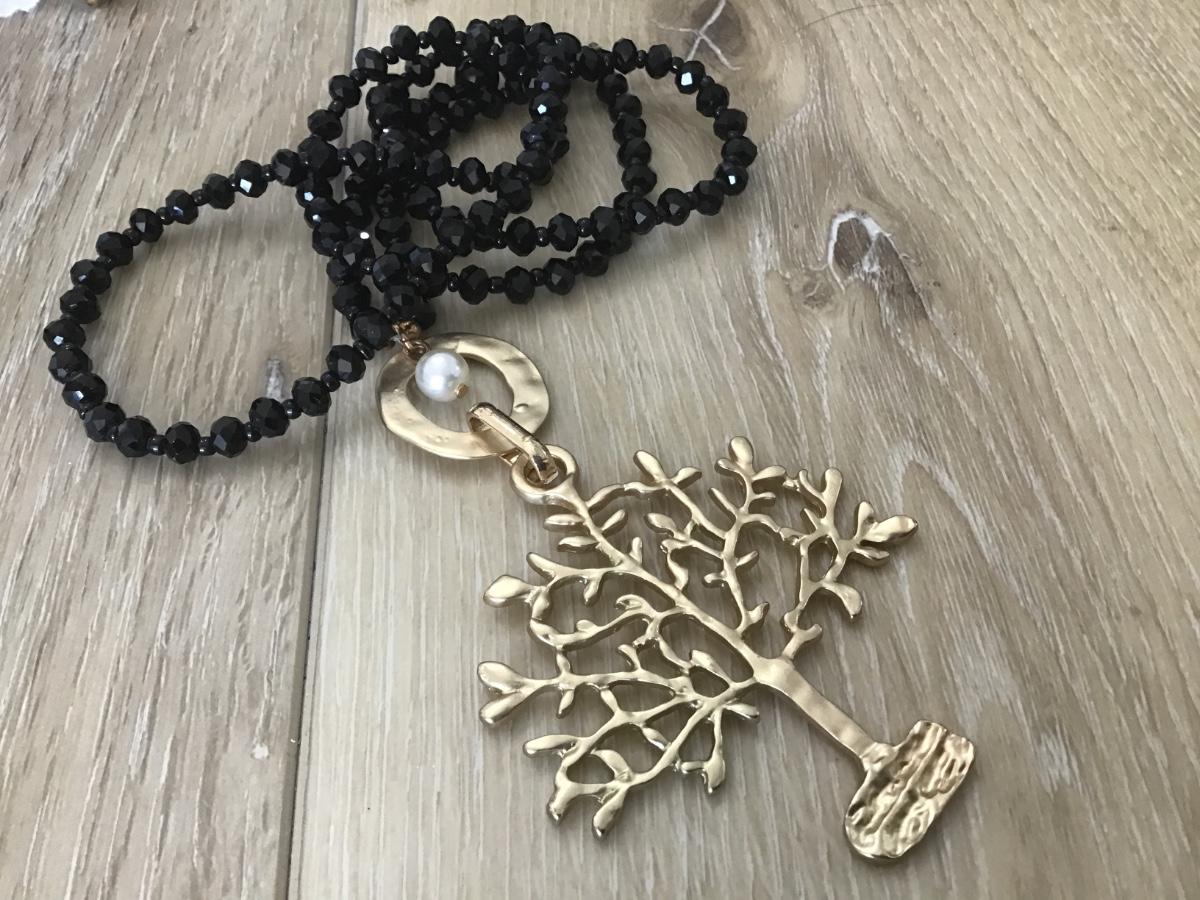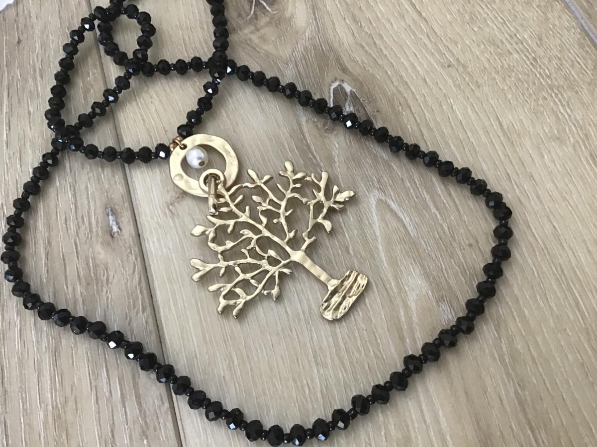 Black Glass With Gold Tree Long Necklace