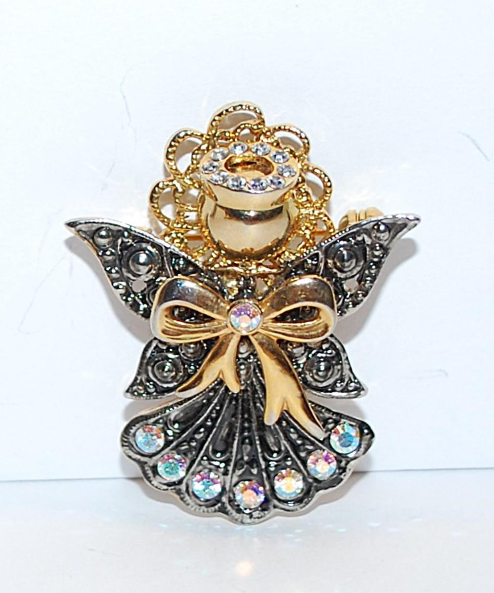Black & Gold Colored Modern ANGEL BROOCH (1¾" x 1½") with Iridescent Accent Stones and Jeweled Halo on a Gold Tone Setting