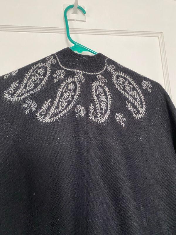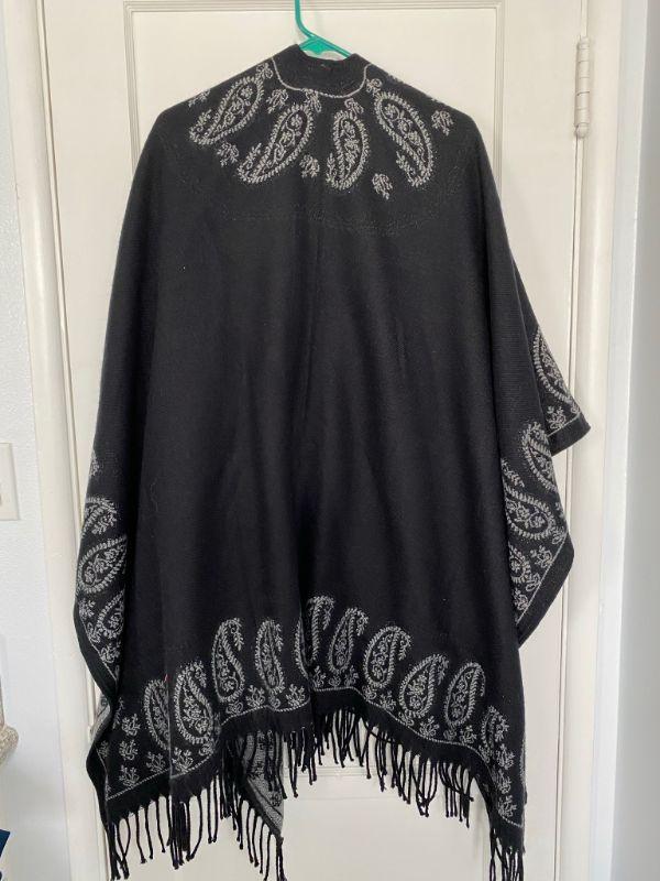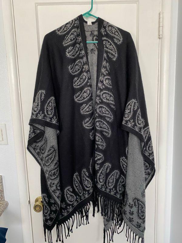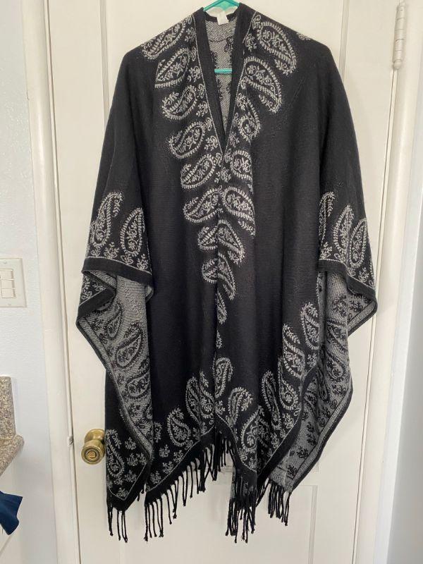 Black and gray paisley wrap. Fringed edge open front poncho. One size.