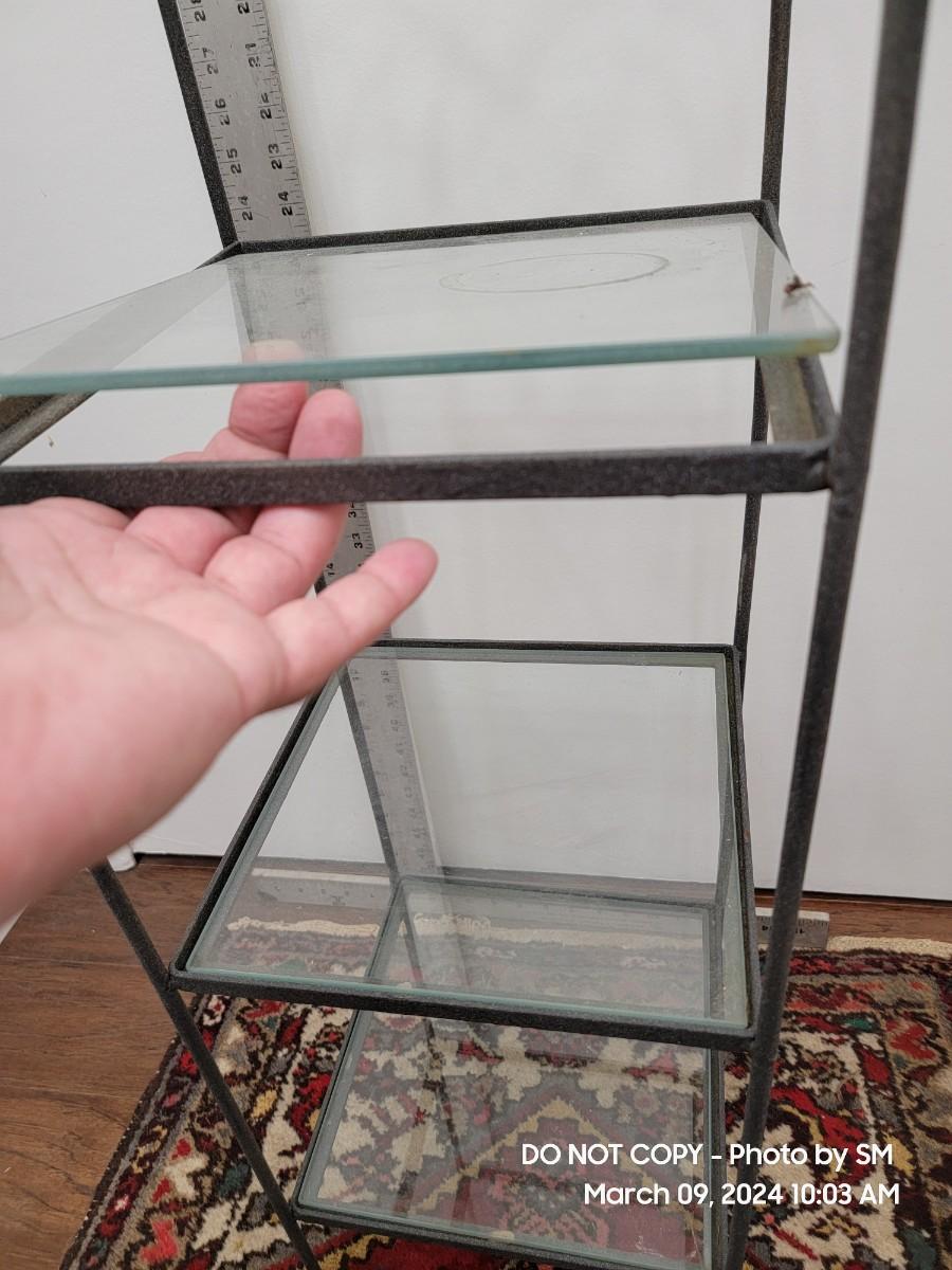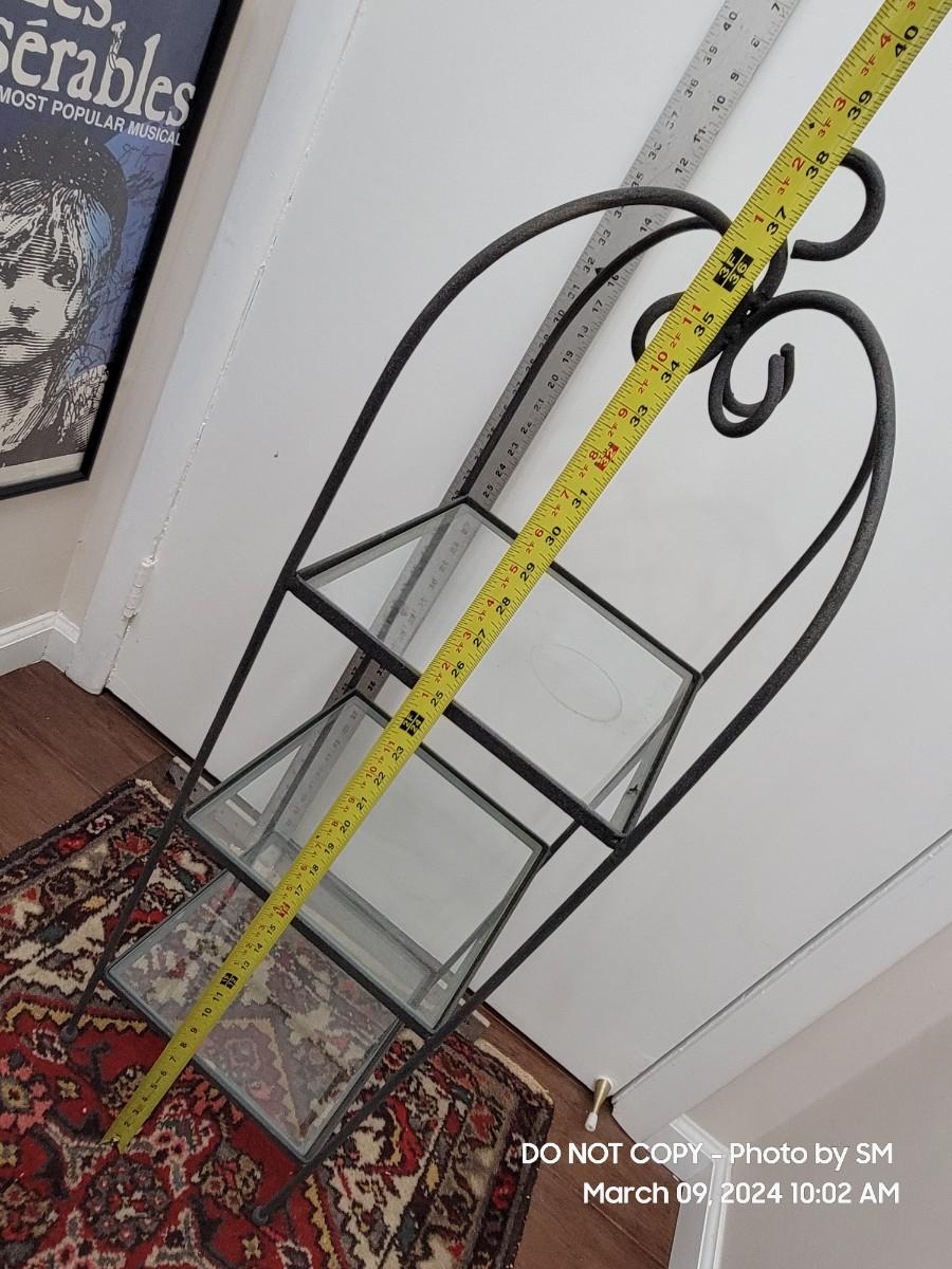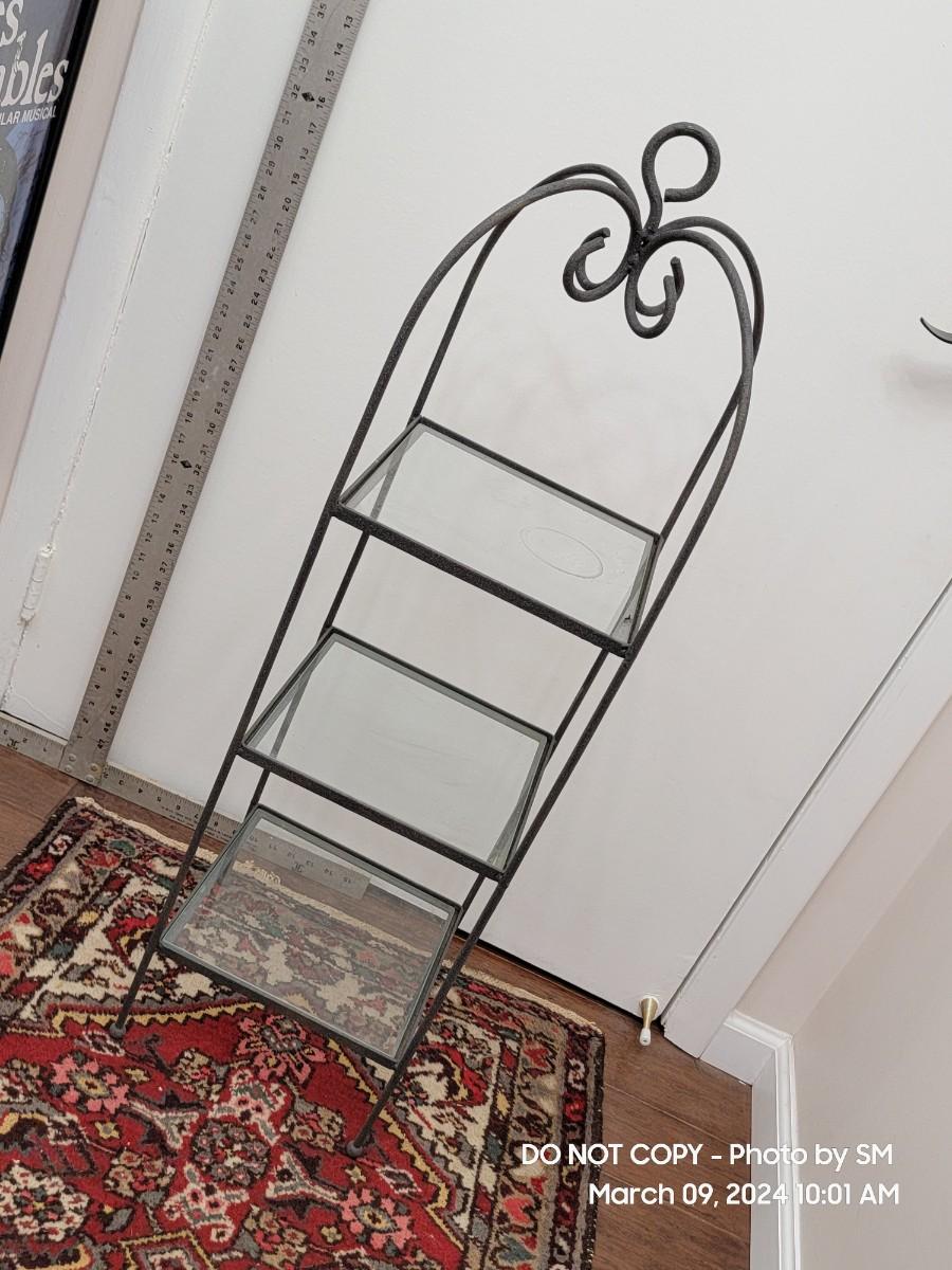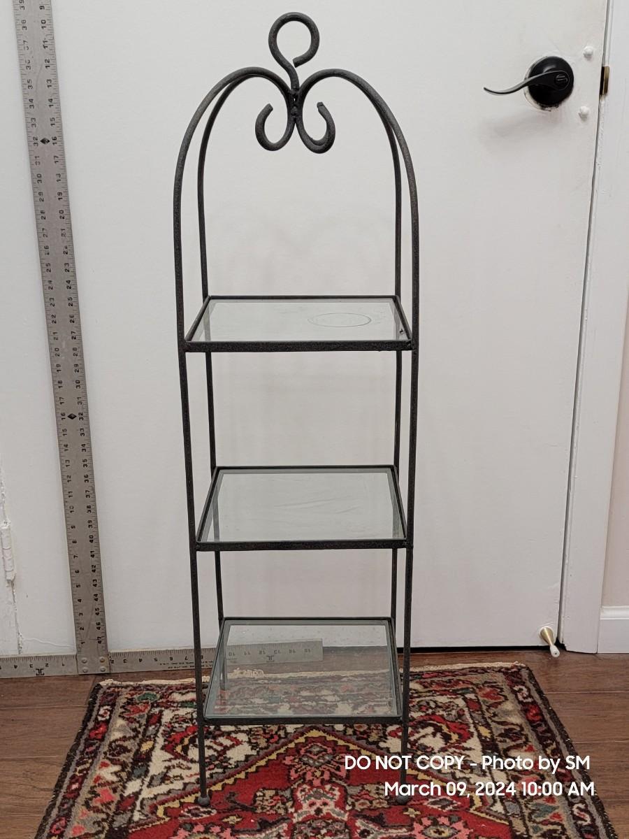 Heavy, black finish, may not be the original color. The stand is true iron (not aluminum), the glass shelves are not cracked good shape. Needs a cleaning. Great plant stand or trinket holder.