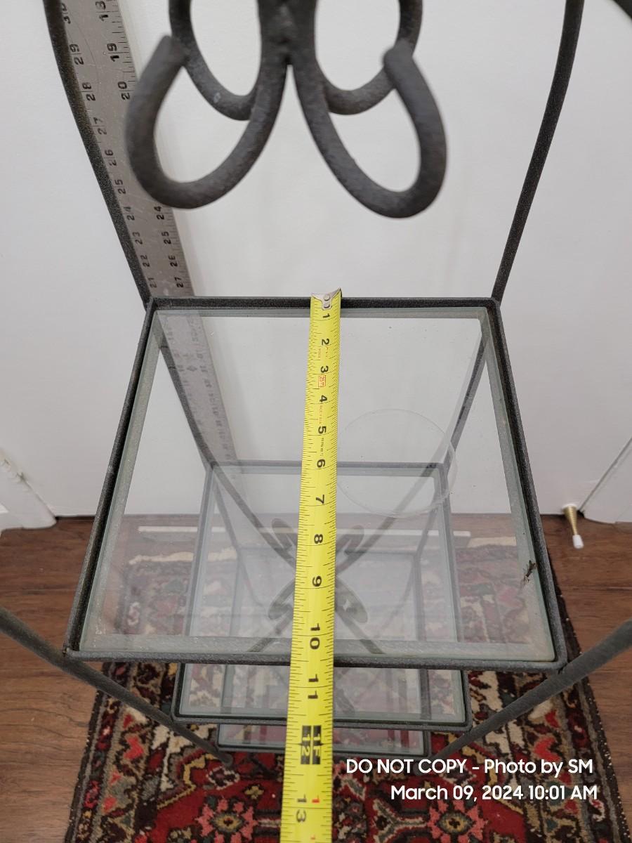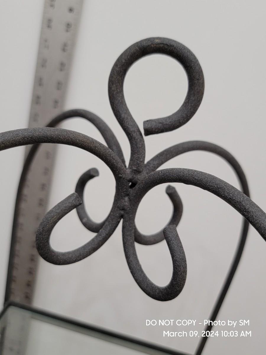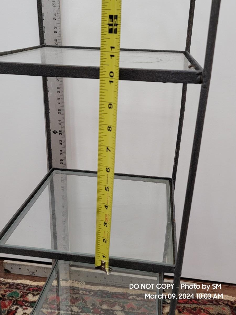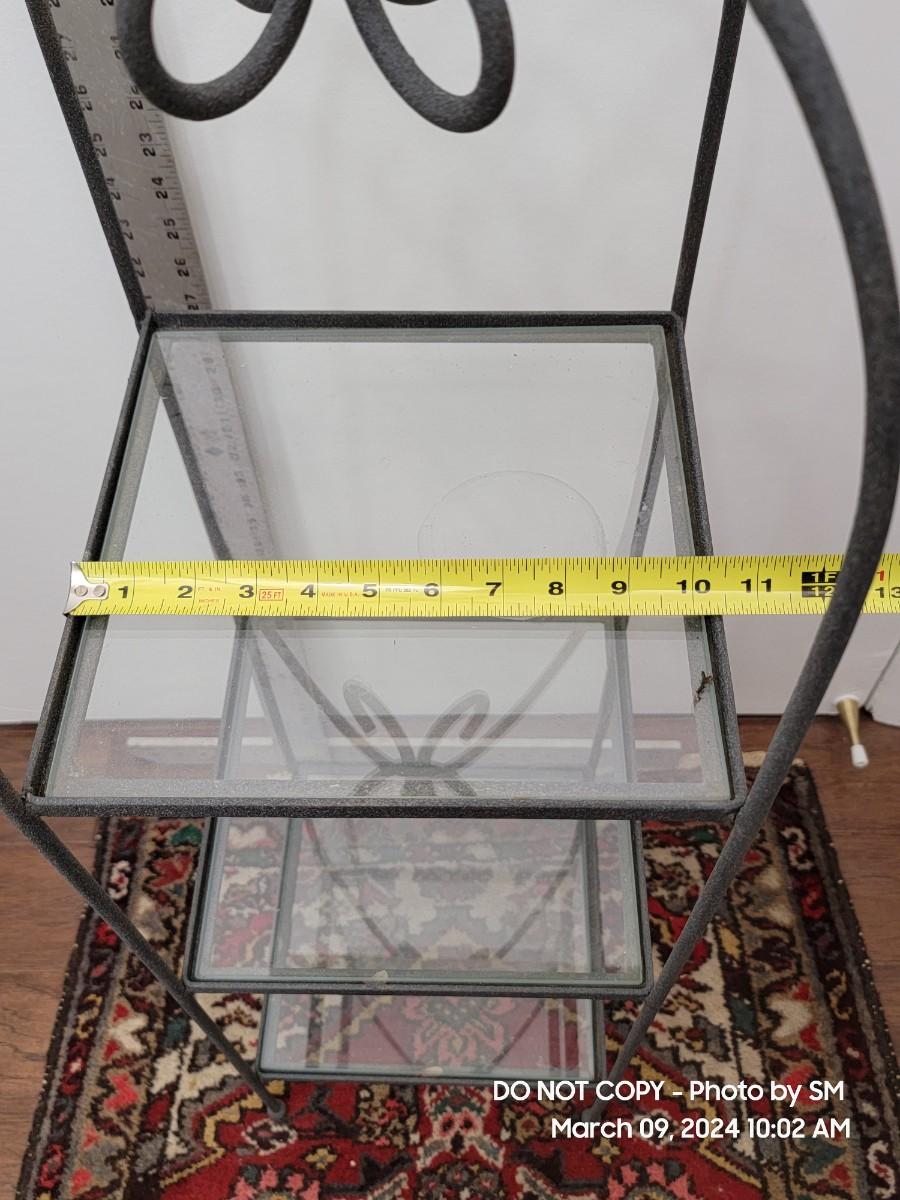 Heavy, black finish, may not be the original color. The stand is true iron (not aluminum), the glass shelves are not cracked good shape. Needs a cleaning. Great plant stand or trinket holder.