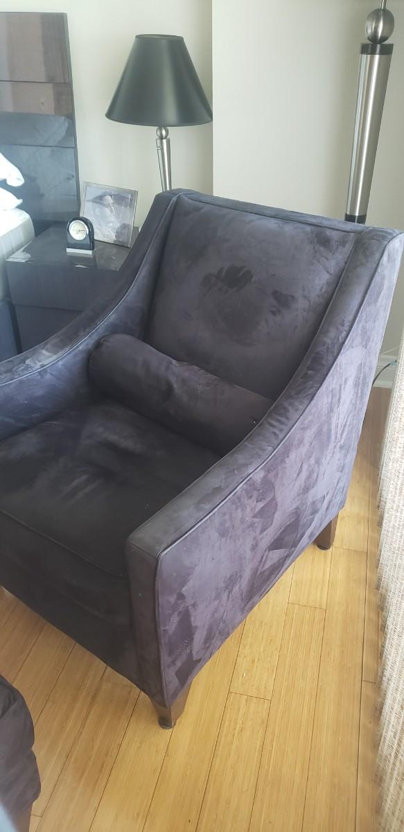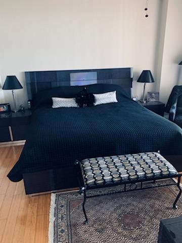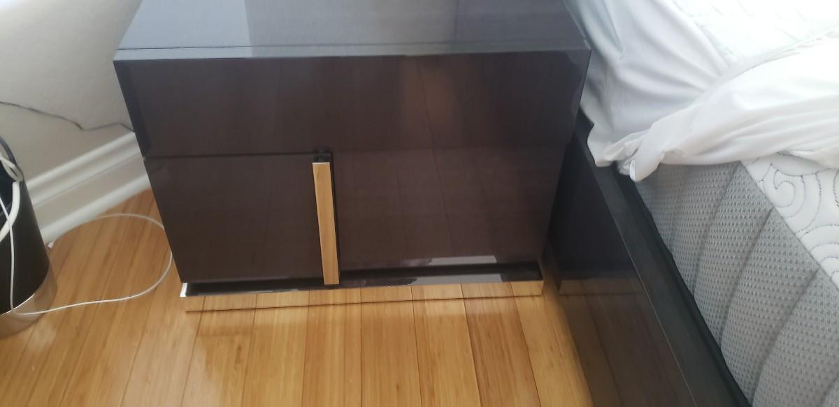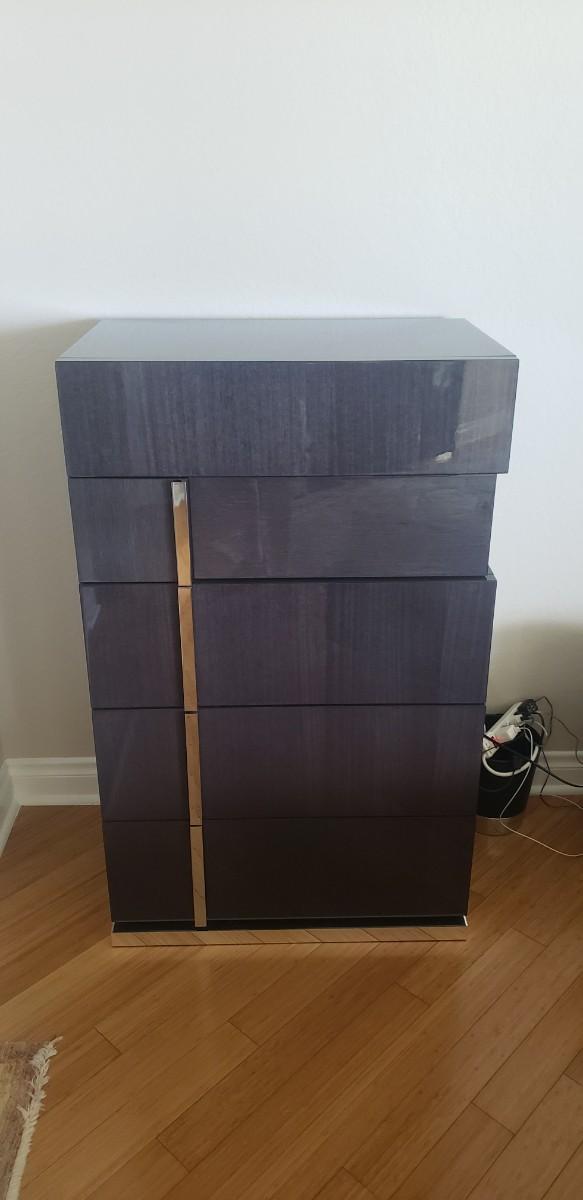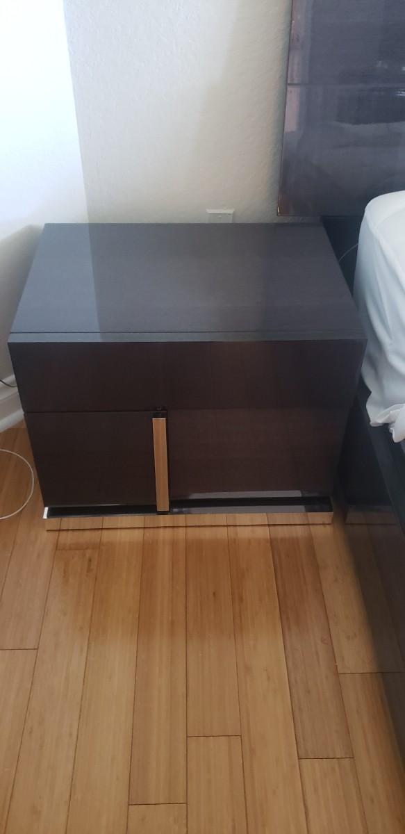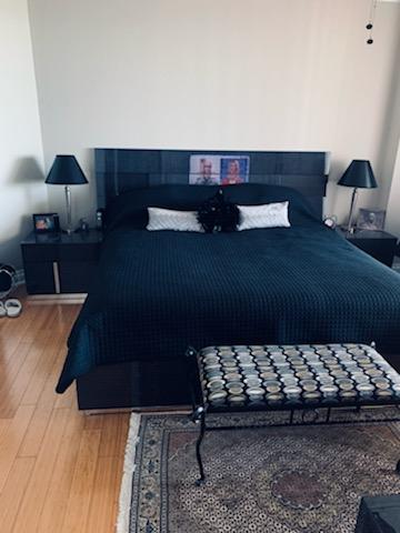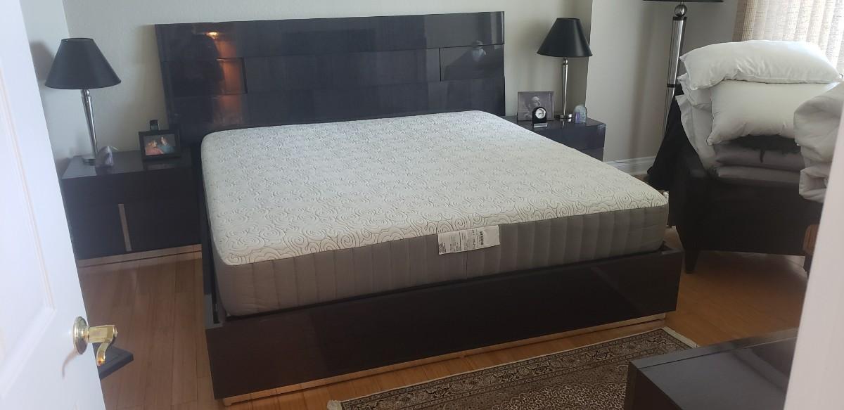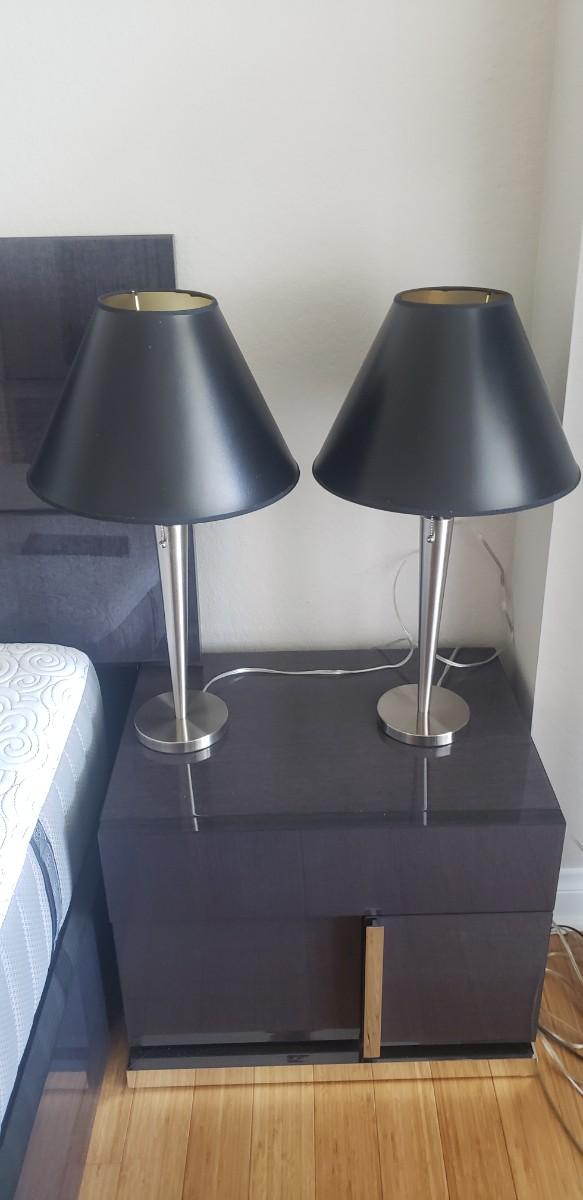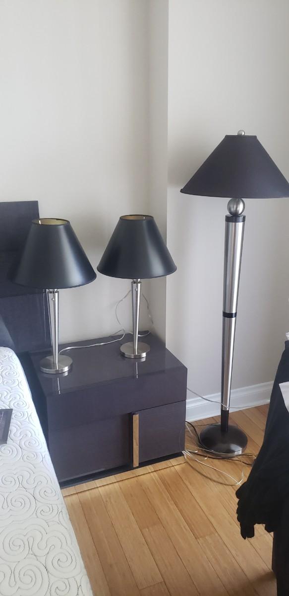 This Lot Includes King size bed (slate wood base) and mattress, two night stands (left & right) high dresser, Low dresser, solid wood made in Italy. 3 Silver Lamps, 1 is a Floor Lamp and 2 are Table lamps, Suede chair and Ottoman